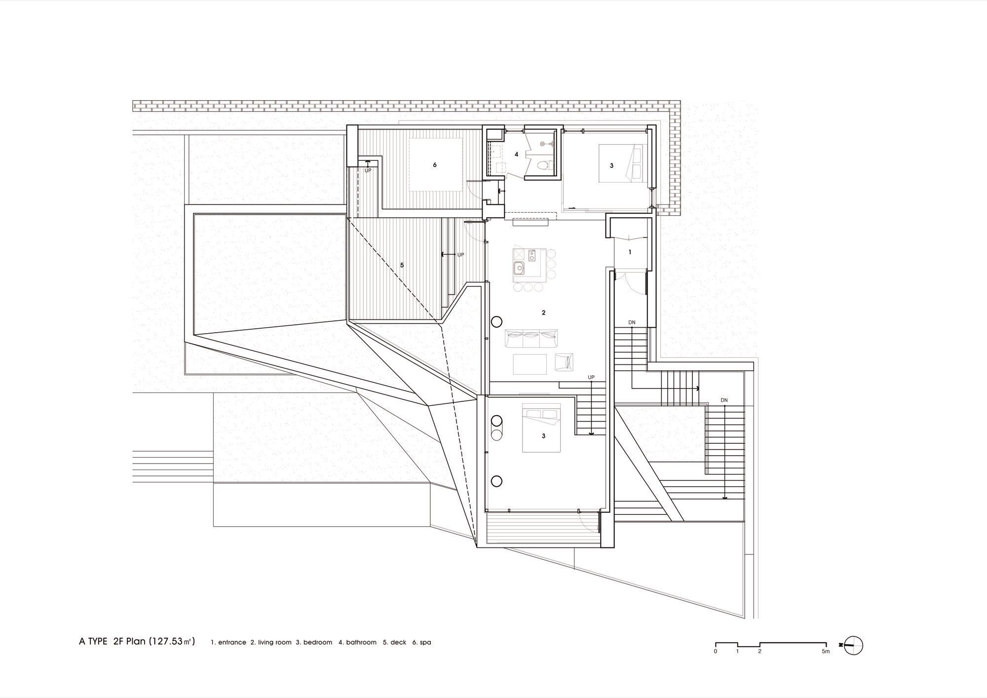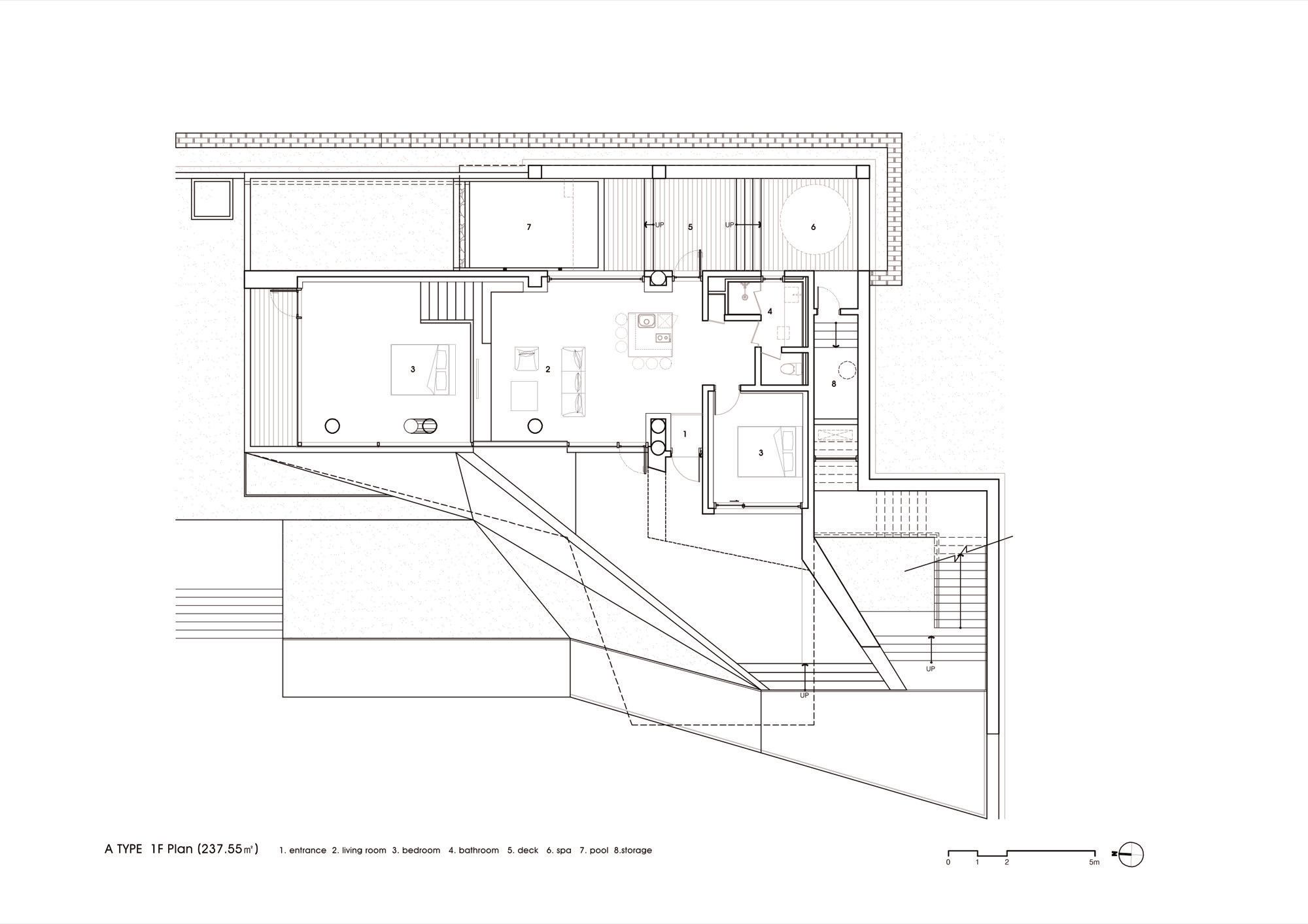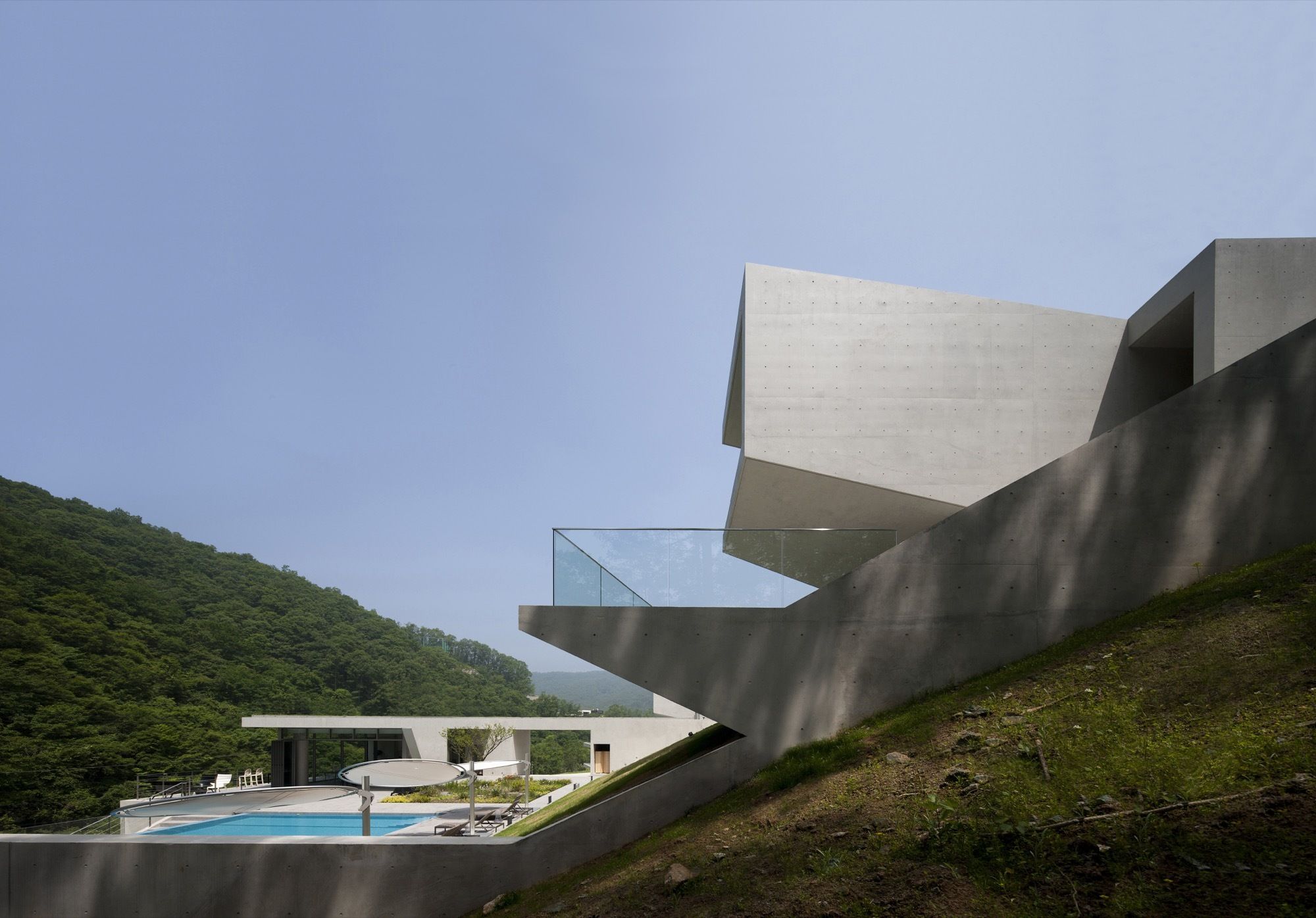 It varies from families for one night trip to couples for a date. All of them want to take a rest at a fancy space without any disruption. They can experience a new spatiality via multi-leveling floor plan that living room, main bedroom, Korean style bedroom, bathroom, terrace, and spa are divided through different levels rather than partitions. The reason of multi-leveling is that various levels can offer the diverse relationship between guest and natural scenery, which enables a colorful appreciation for the nature.