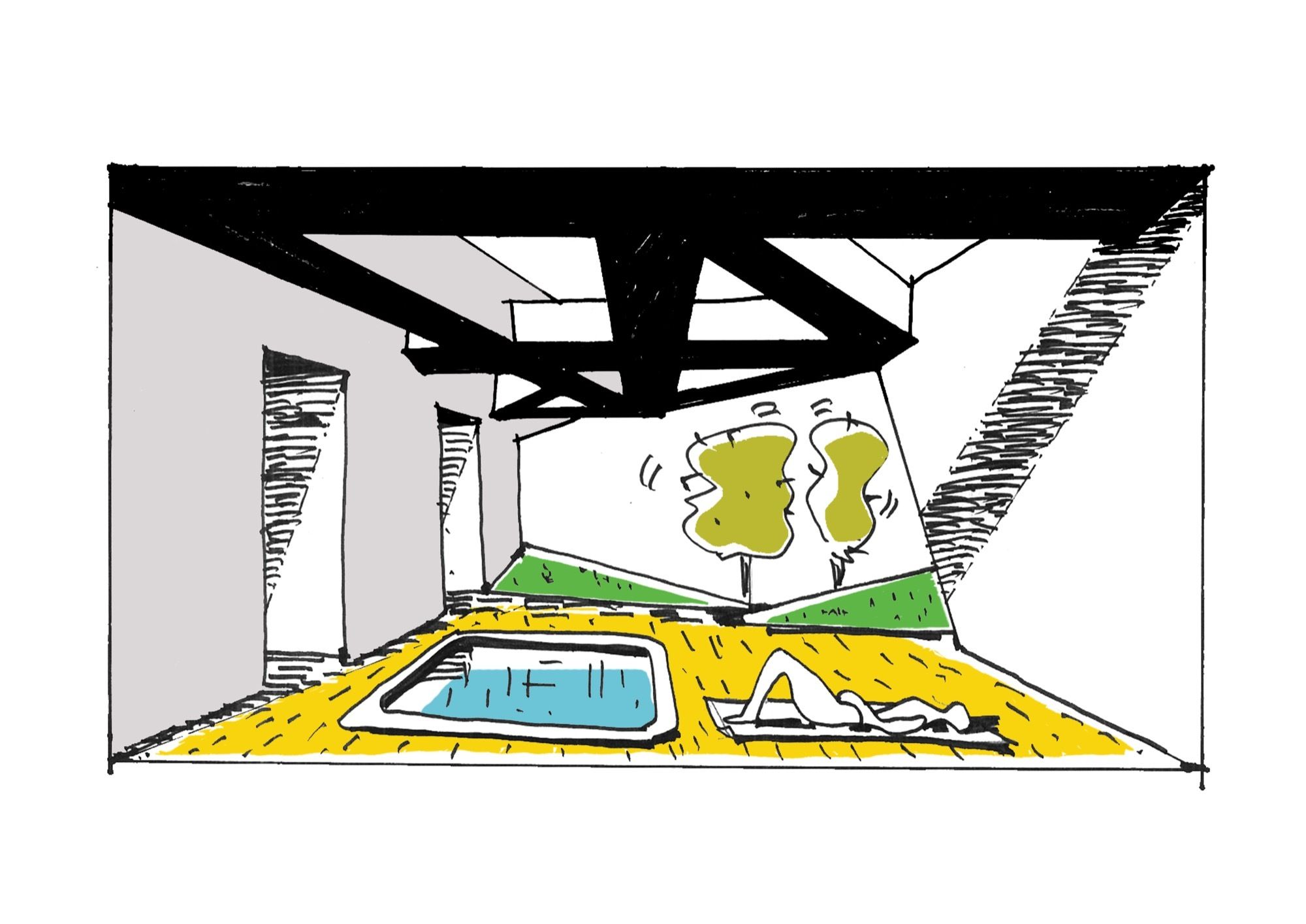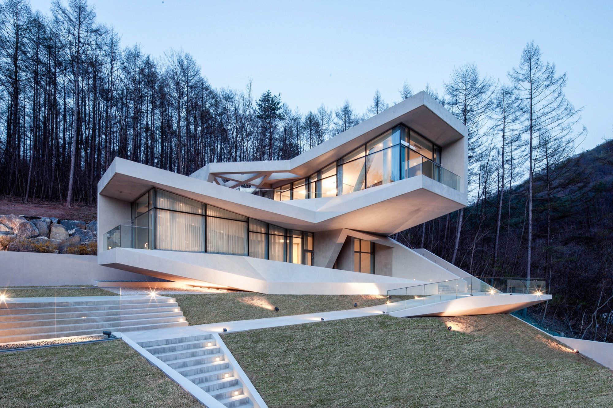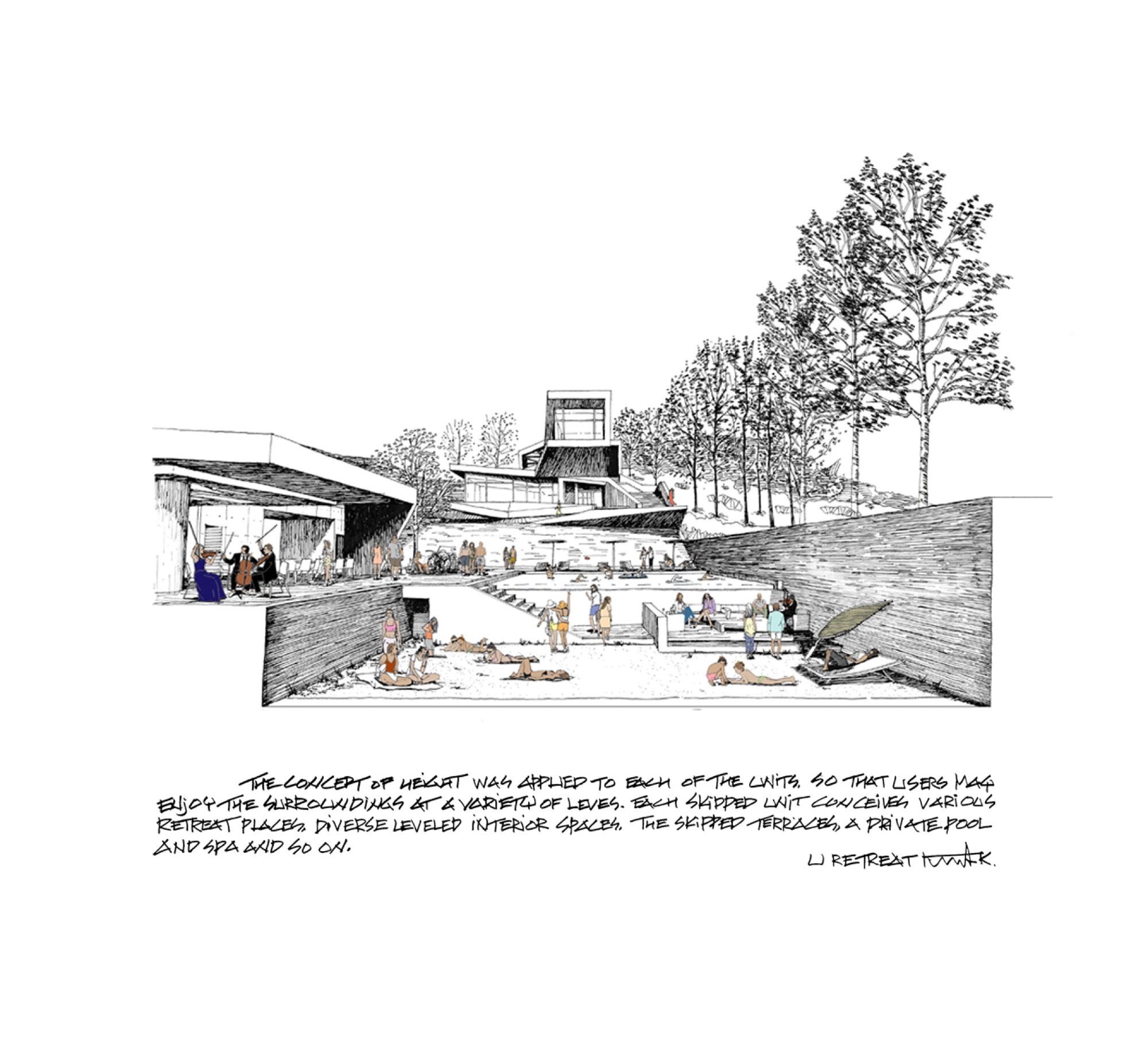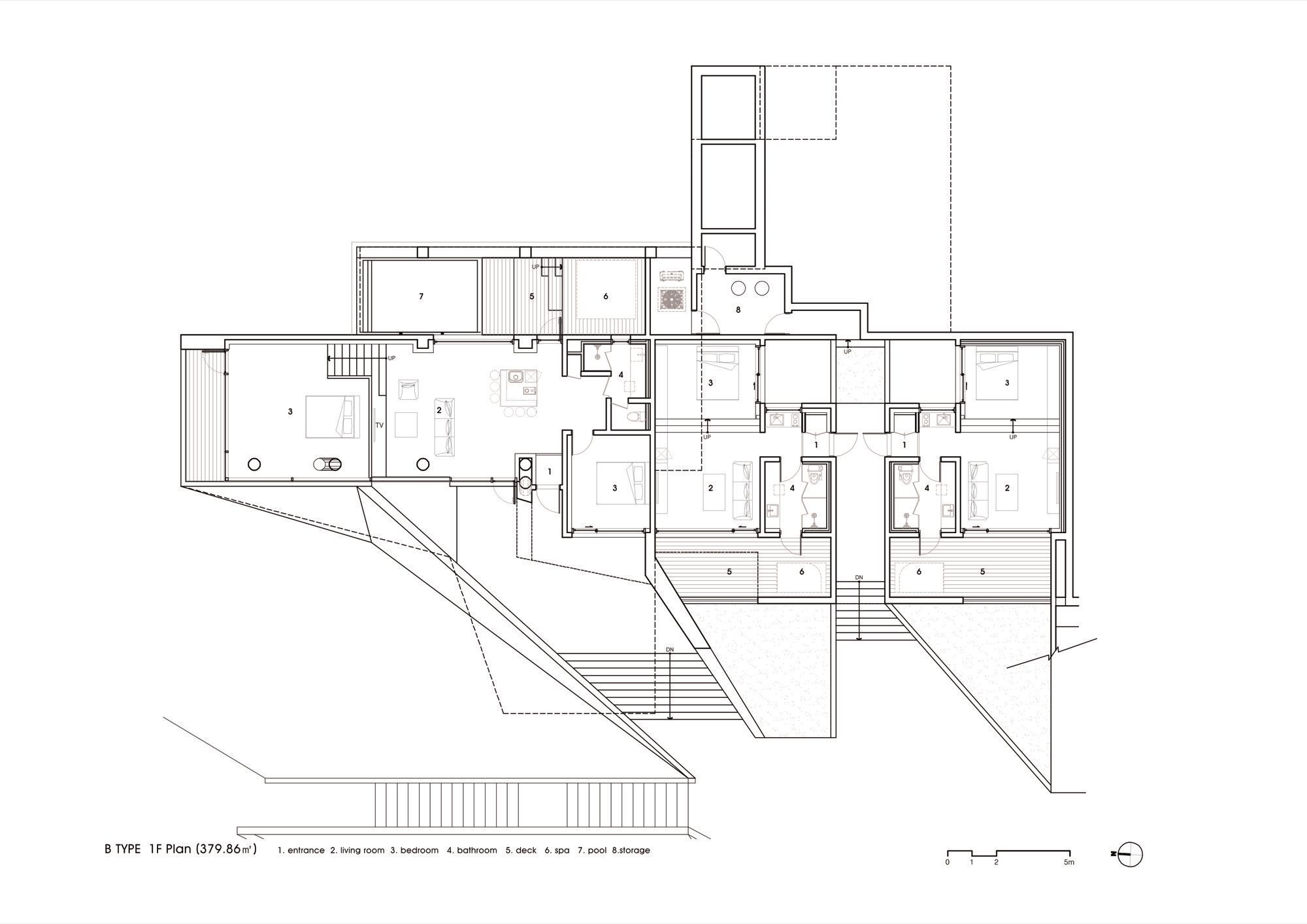 It varies from families for one night trip to couples for a date. All of them want to take a rest at a fancy space without any disruption. They can experience a new spatiality via multi-leveling floor plan that living room, main bedroom, Korean style bedroom, bathroom, terrace, and spa are divided through different levels rather than partitions. The reason of multi-leveling is that various levels can offer the diverse relationship between guest and natural scenery, which enables a colorful appreciation for the nature.