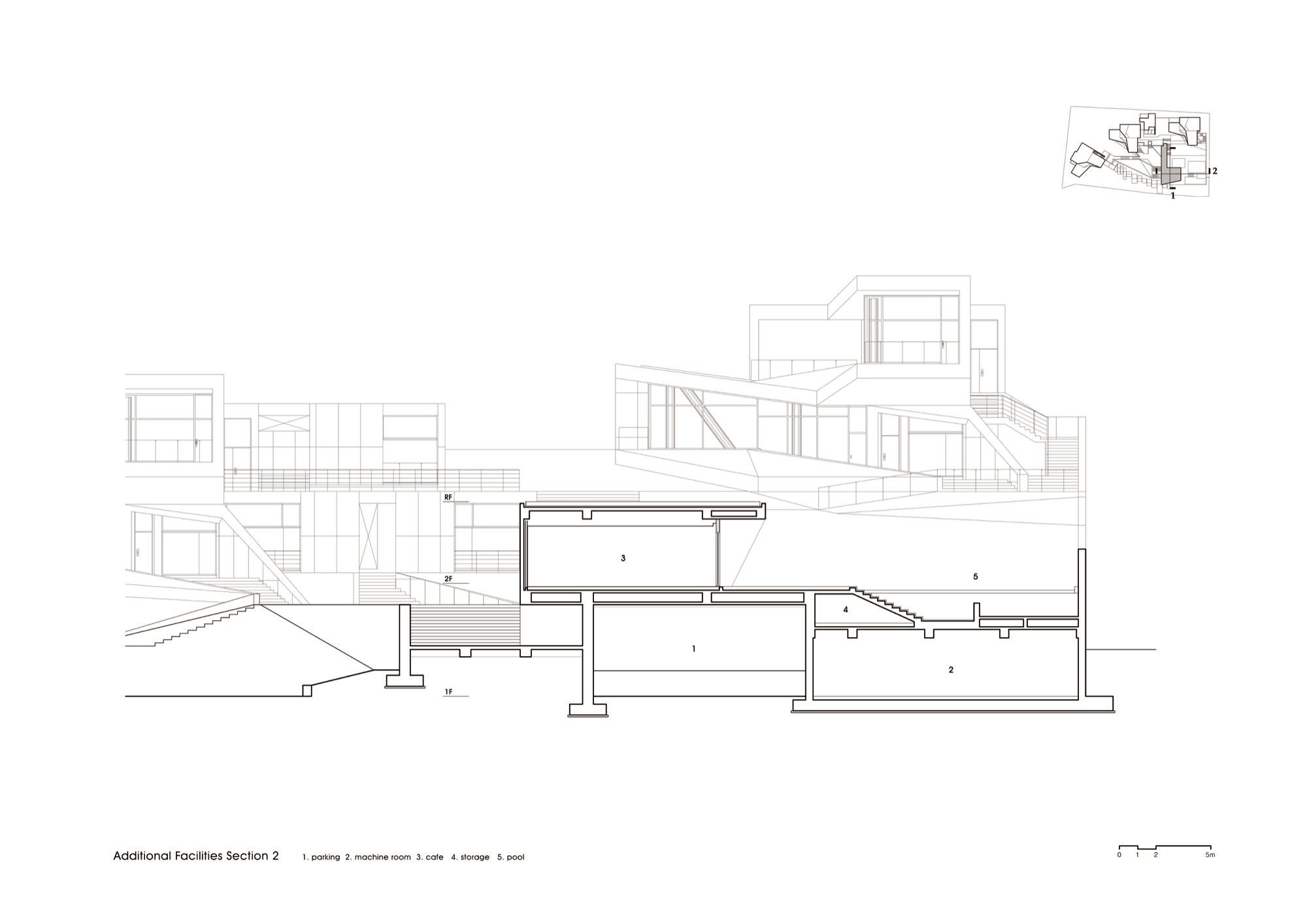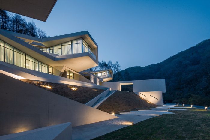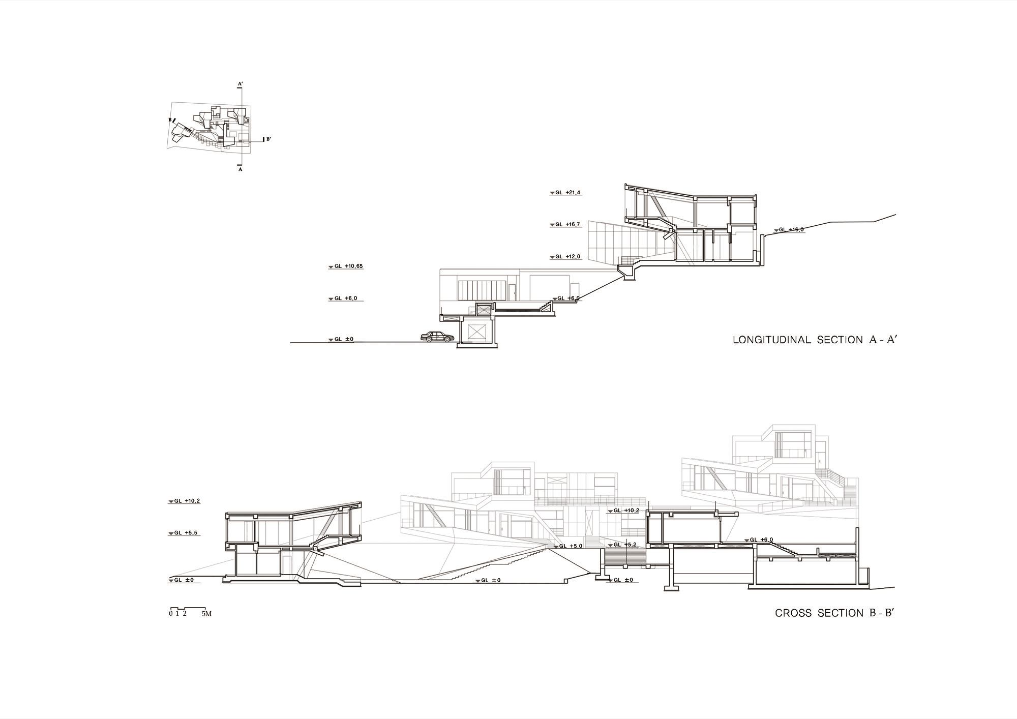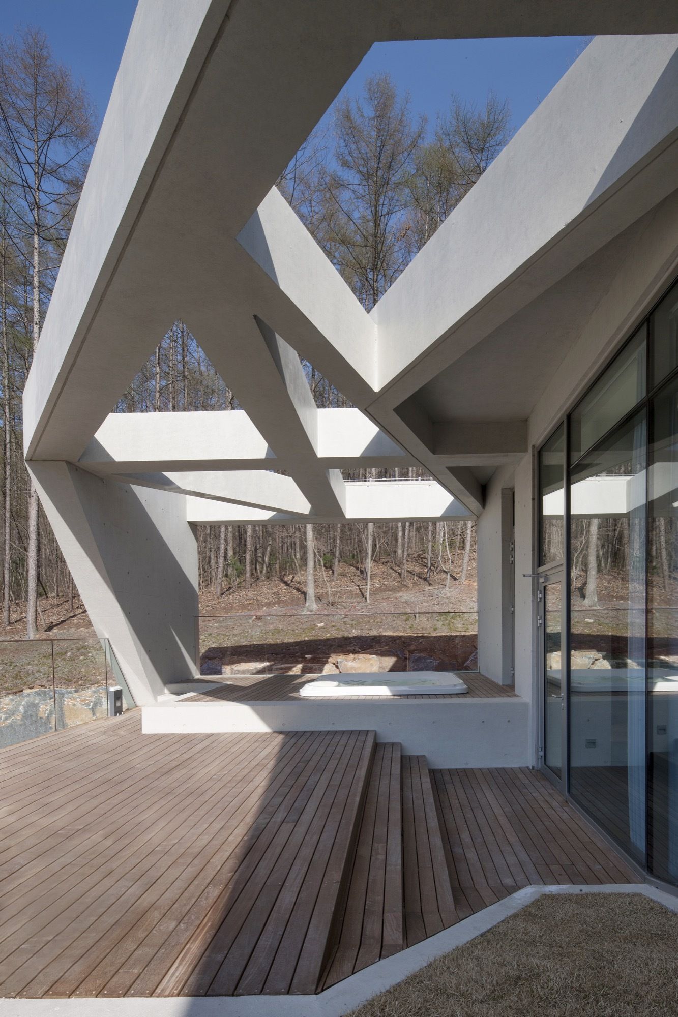 Mountain viewed from the site delivered the image of flying solid mass. Also, I expected that oblique lines made by concrete mass can contrast with irregular and varied lines of the nature. In this respect, diagonal column and cantilever and upper and lower parts connected with twist generate active shapes harmoniously diversified with natural science.