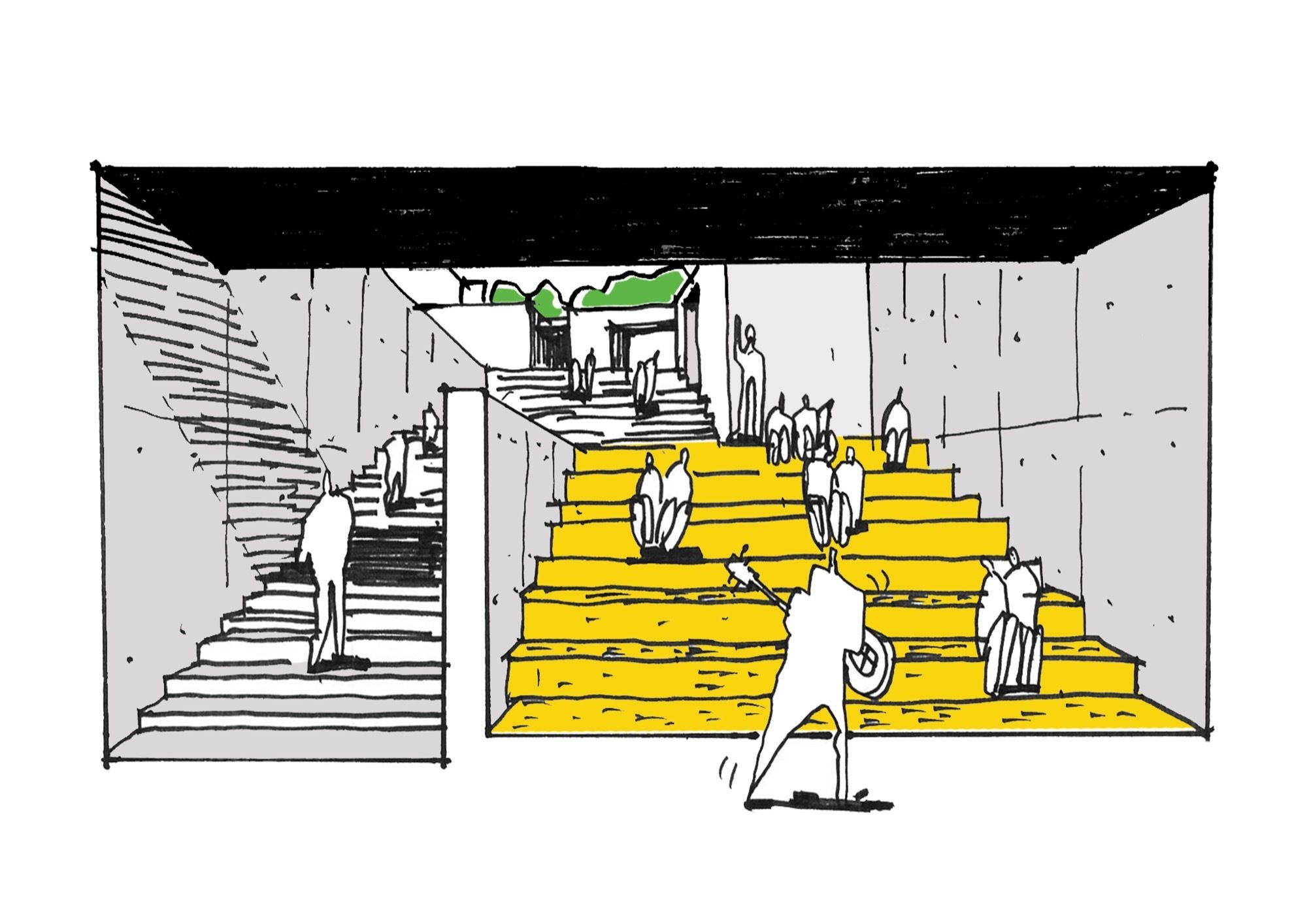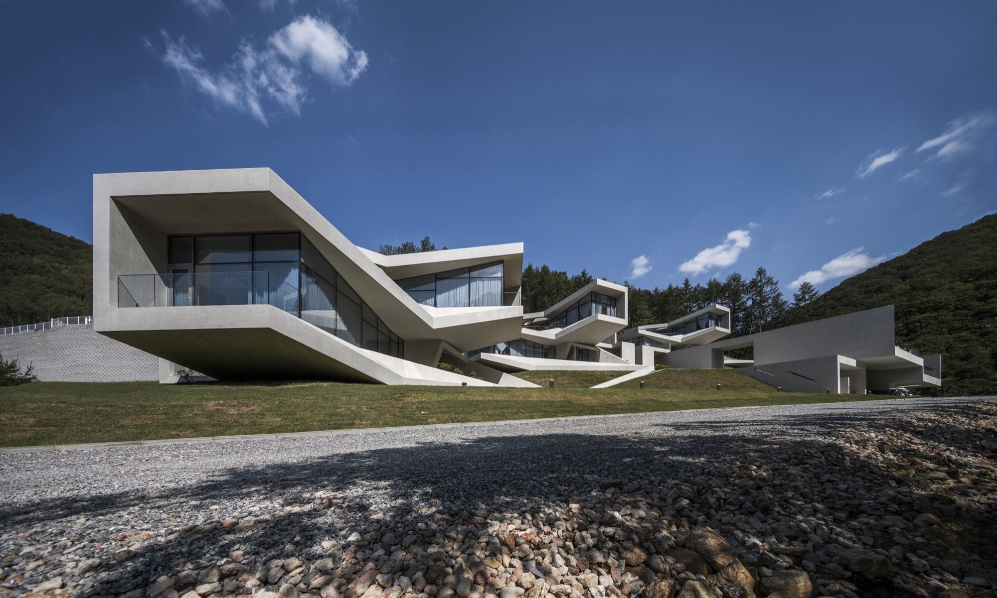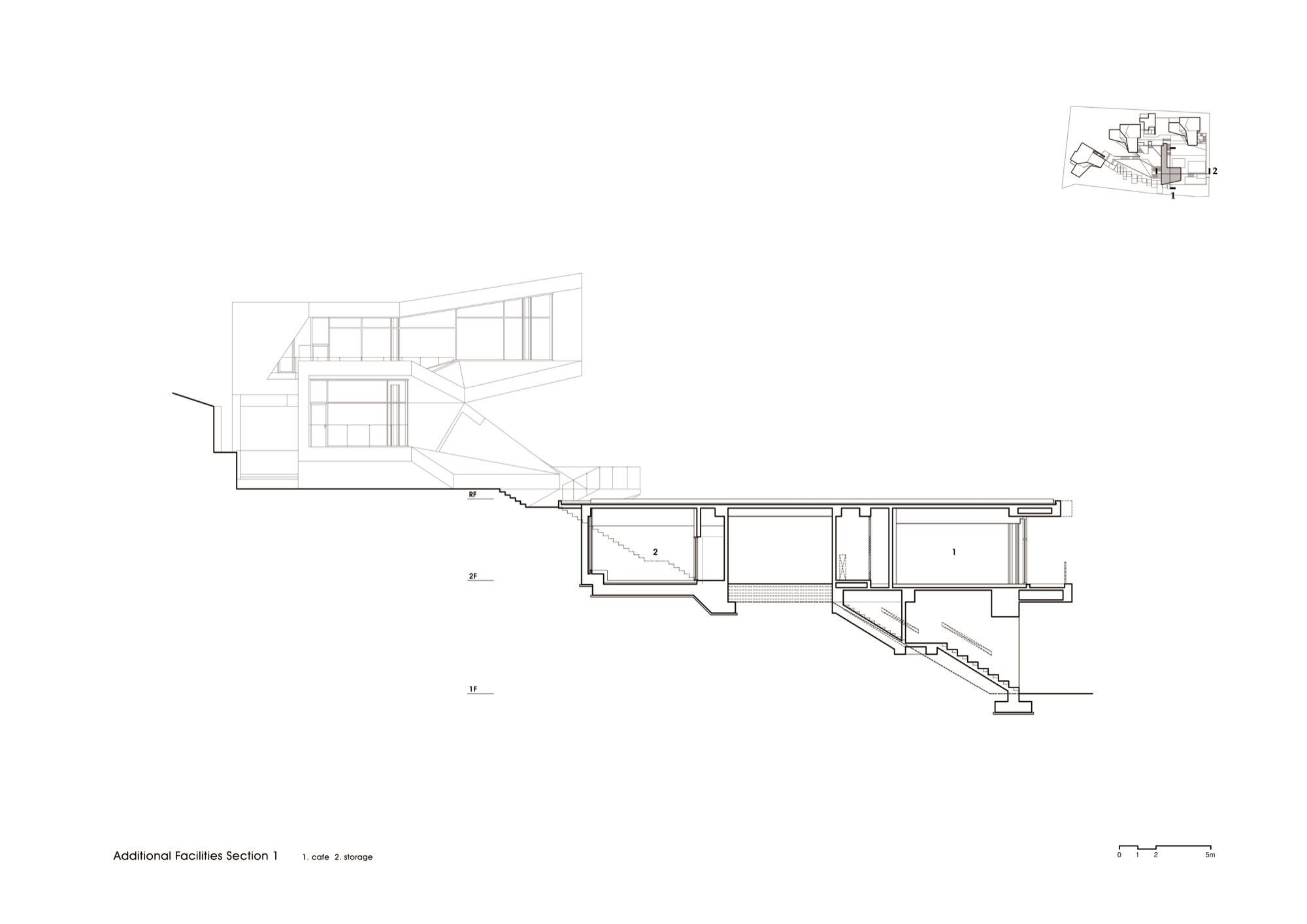 Mountain viewed from the site delivered the image of flying solid mass. Also, I expected that oblique lines made by concrete mass can contrast with irregular and varied lines of the nature. In this respect, diagonal column and cantilever and upper and lower parts connected with twist generate active shapes harmoniously diversified with natural science.