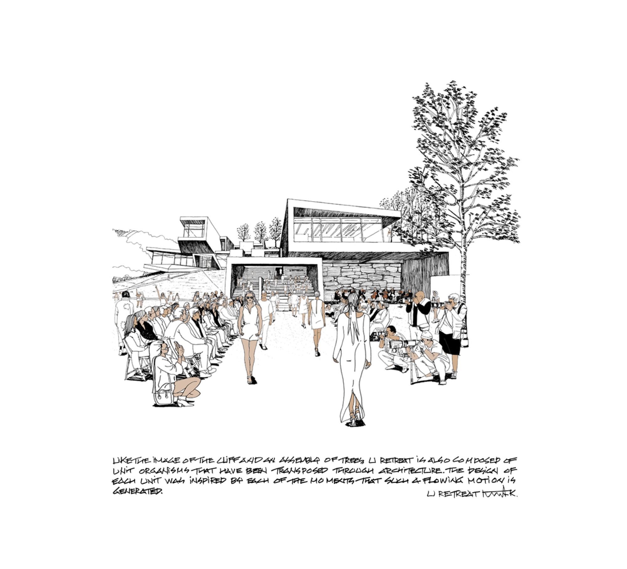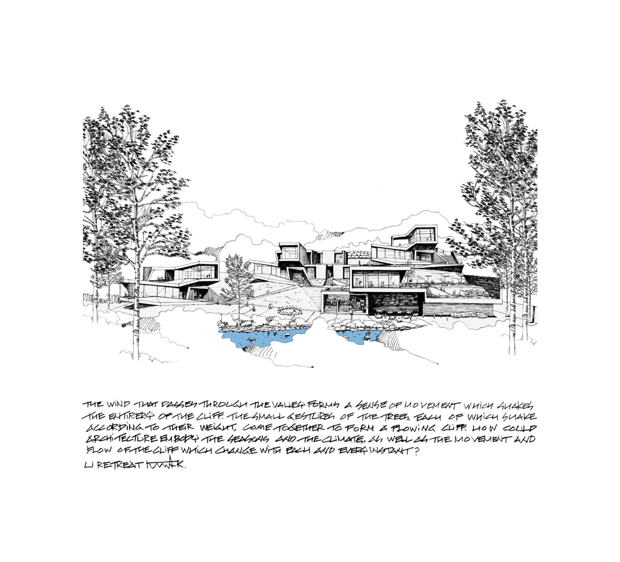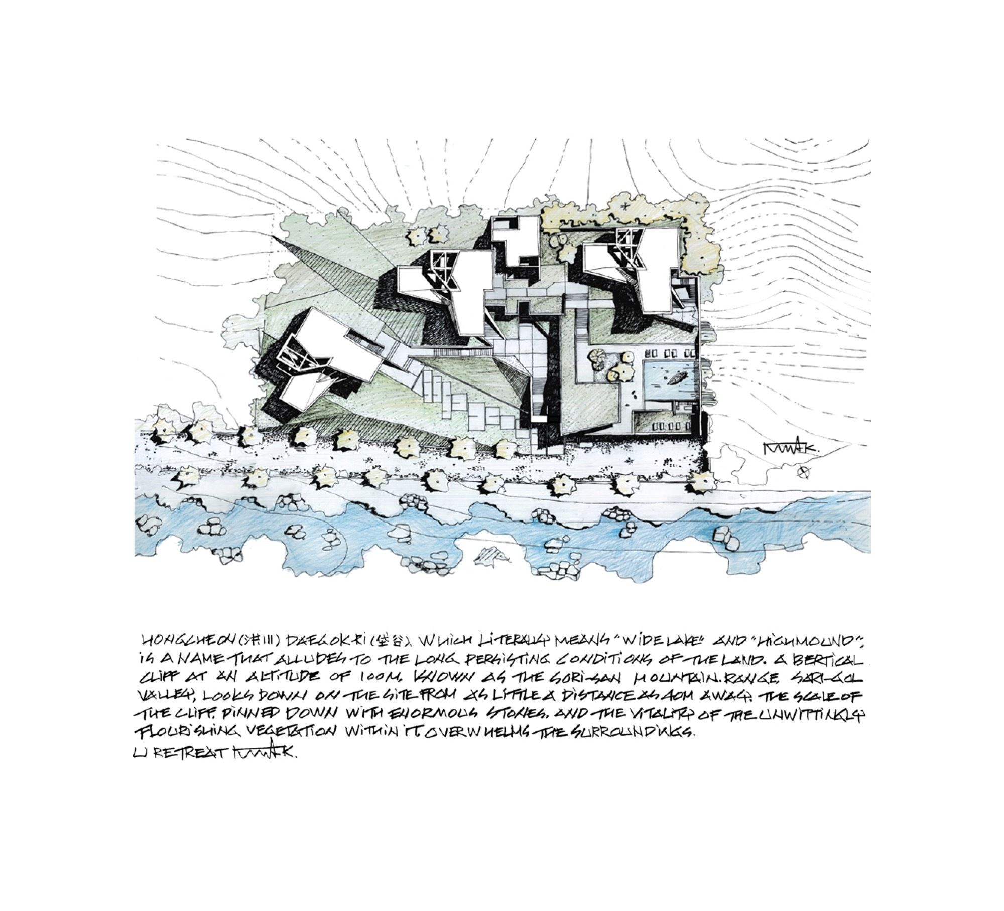 Bordered by the Sori-san mountain range in South Korea, the U RETREAT sits at the core of the Sari-gol valley in Hongcheon-gun Daegok-ri. Looking down on the site from as little a distance of 40 meters, a sharp vertical cliff stretches at an altitude of 100 meters. The scale of this geological formation pinned down by enormous stones, and the vitality of the flourishing vegetation within it totally overwhelm the surroundings.