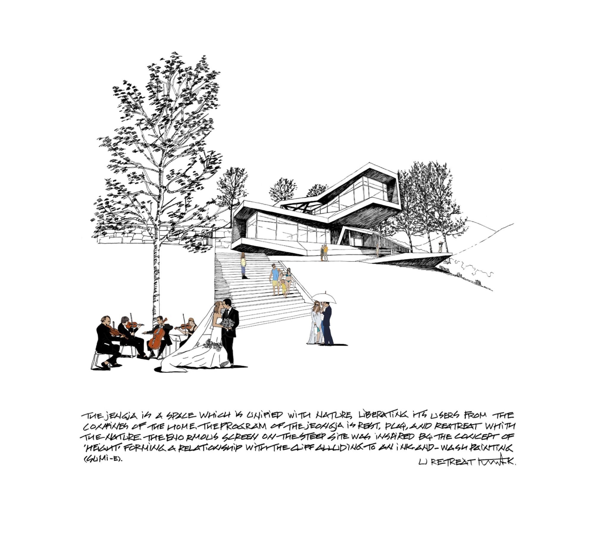 This project has been asked by a retired businessman from the fashion industry. For a retired life, he wanted a unique and meditative accommodation located in a deep valley. The important point of this project was how local small accommodations, so it called as “Pension”, can be architecturally evolved. To do so, I conceived an individual interpretation of nature and an analysis for diverse views from the position of guests to extract a new spatial experience.