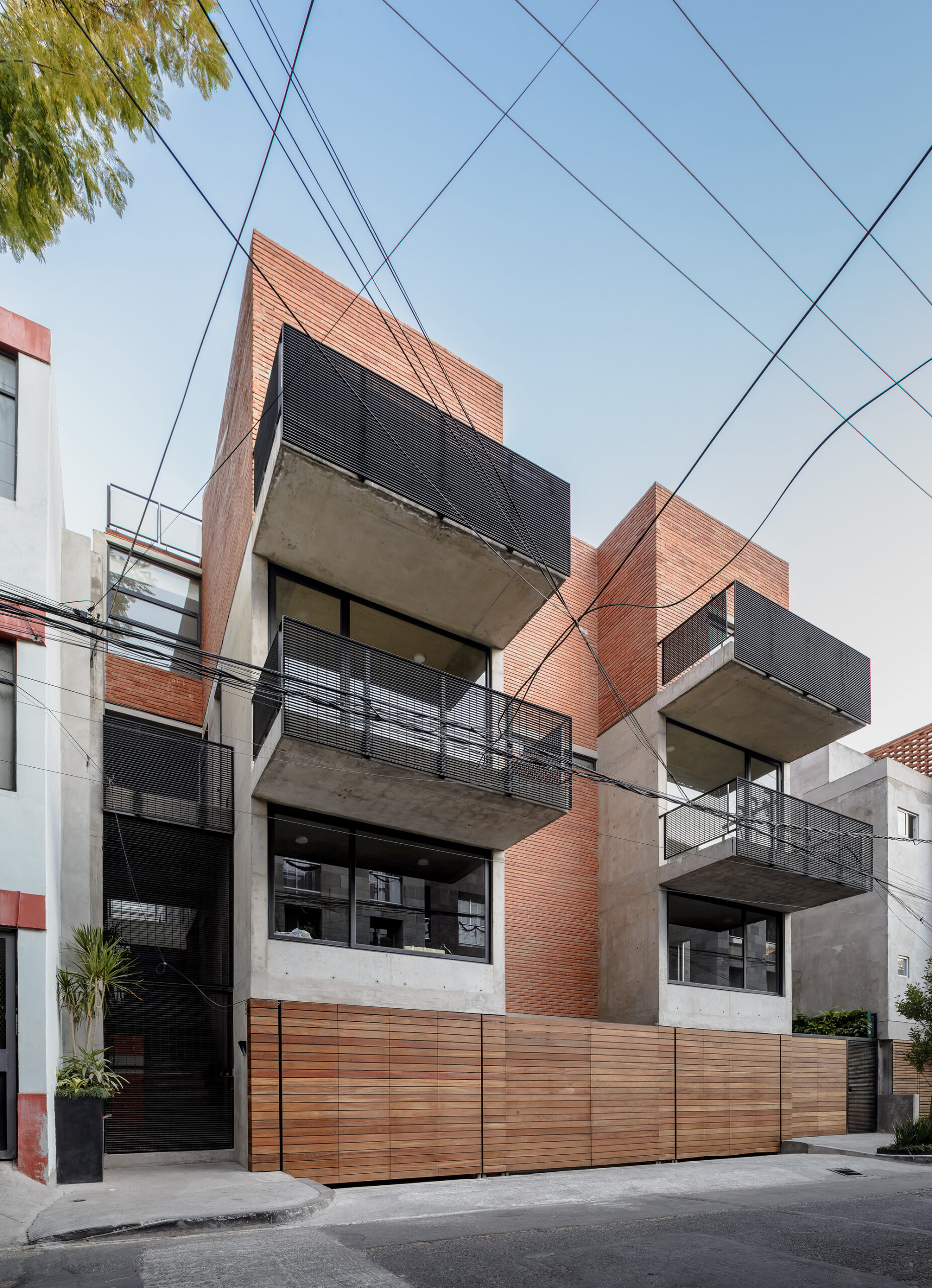 On the first two floors, two-level units are arranged (with some double-height spaces) and the single-floor apartments are located on the third level. Towards the street, four apartments share the main facade defined by four balconies that take advantage of the life and view of the street. This street – a closed small-scale street with little traffic – is located in a neighbourhood in Mixcoac with its intricate and compact urban fabric, which is clearly perceived to this date.