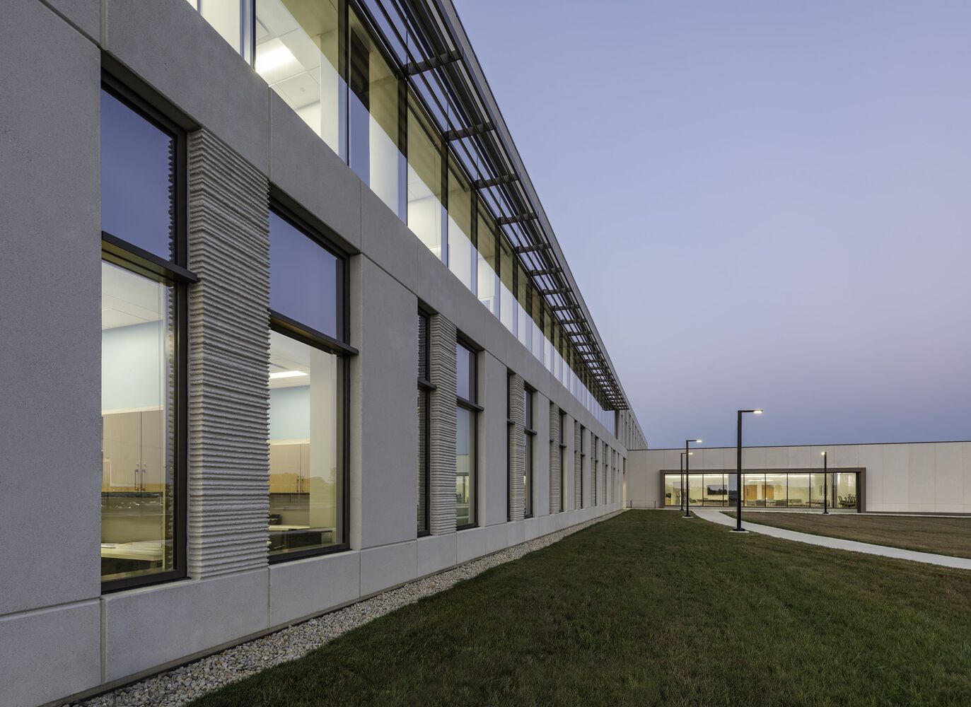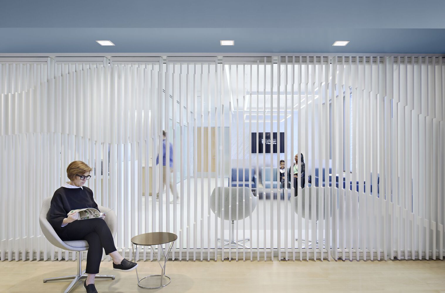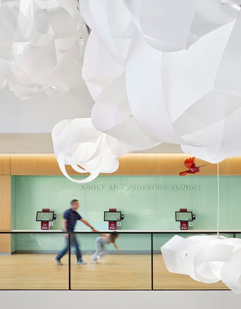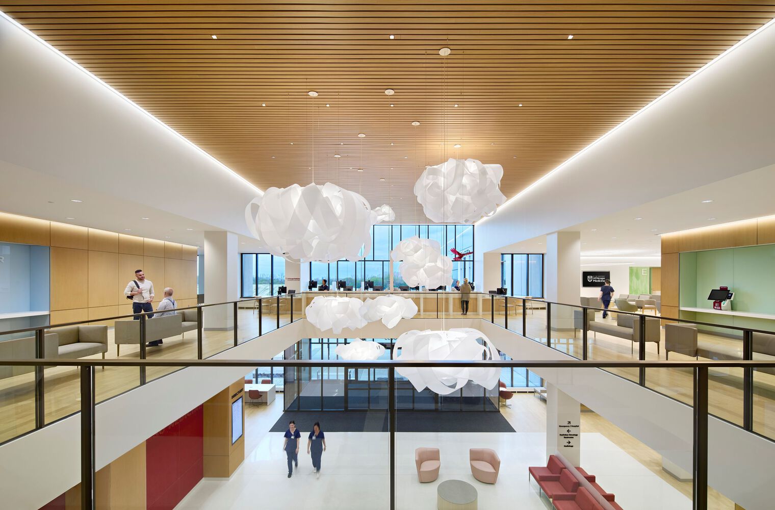 Drawing inspiration from the local environment, the facility’s precast concrete envelope references Indiana limestone, enhanced by textured accents that create dynamic interplays of light and shadow throughout the day. Filled with natural light and surrounded by native prairie grasses, the building promotes patient health and tranquility and provides accessible green space for community residents. The two-story lobby serves as the central hub for patients and their families. Its expansive glass entry, rift white oak, and Indiana limestone-clad walls, reinforce the project’s connection to the prairie site. Wayfinding between the discrete programmatic units is enhanced through distinct color schemes and graphics inspired by the many local varieties of wildflowers, butterflies, birds, limestone quarries, trees, prairie grasses, surrounding fields, Lake Michigan and the dunes. The first-floor radiation oncology waiting area, for example, features a wave-pattern screen to provide filtered light and privacy. Indiana limestone at the two-story elevator enclosure acts as a hearth and creates a warm neutral backdrop. A suspended art piece that mimics clouds, curated by UChicago Medicine, is experienced on both levels of the atrium.