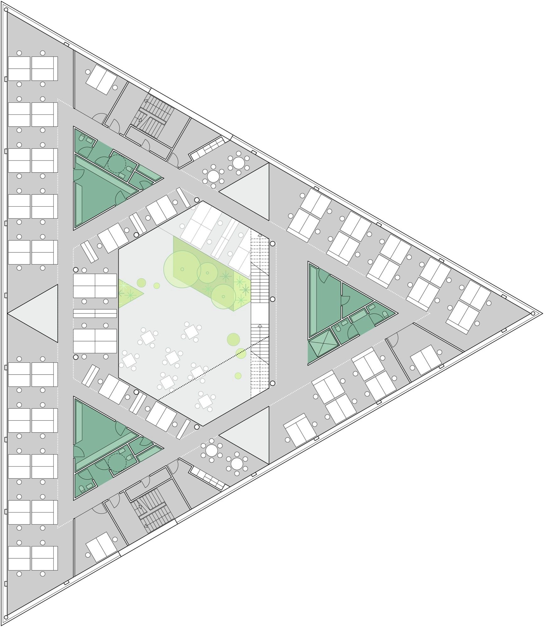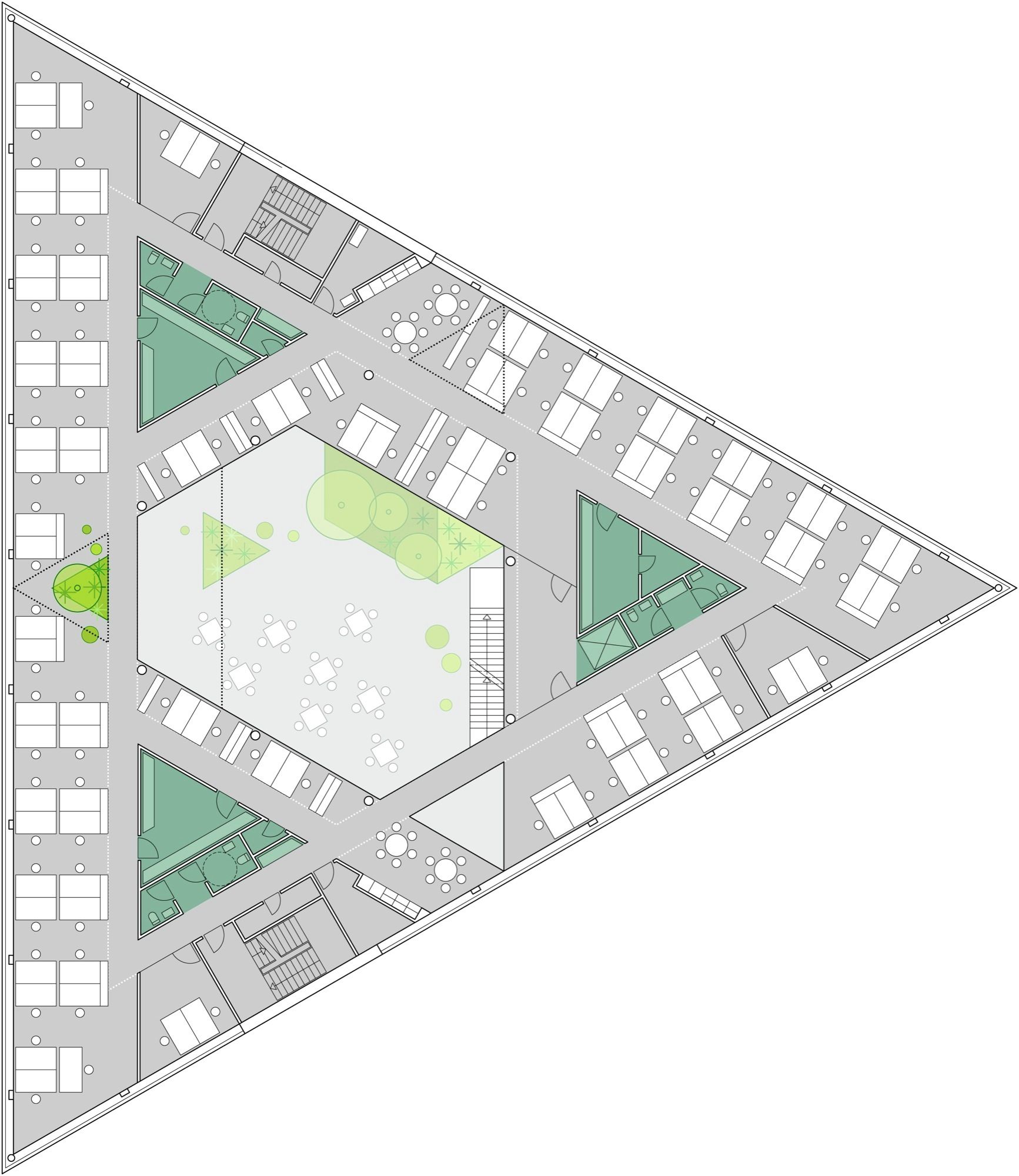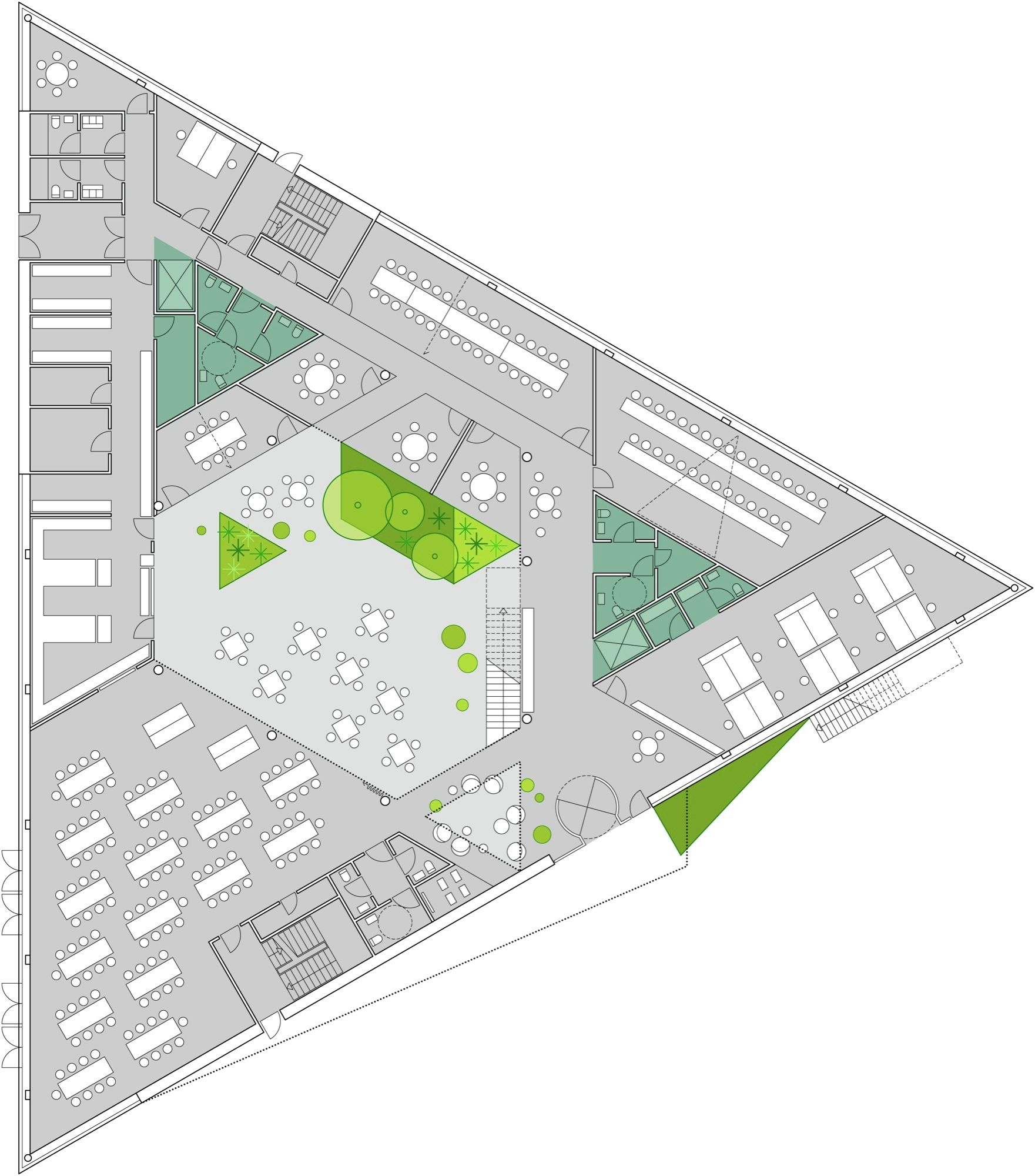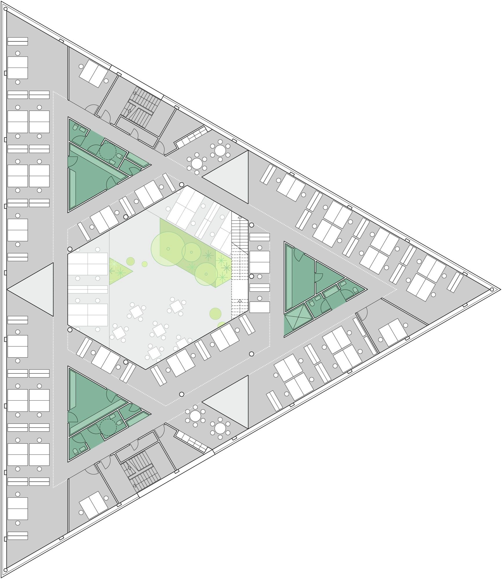In order to divide the building into subsections, a triangular interior atrium is inserted. The atrium is rotated 180° so that its tips meet the building’s outer edges. Given its direct contact to the facades, the atrium’s shape and orientation allow a large amount of daylight to reach the building center. The tips of this central space are “cut off” by walkways and workspace areas, dividing the atrium into the main space and three small atriums. The main space is slightly asymmetric and rotates for each floor, so that varied spaces with different floor-to-ceiling heights emerge, which makes the building flexible and usable in different working situations. Thus, the internal contact between functions increases and becomes much more varied than in a traditional atrium building. In addition, this strategy also meets the ambition of providing manifold of different spatial qualities, which employees can turn to according to needs, mood or project.