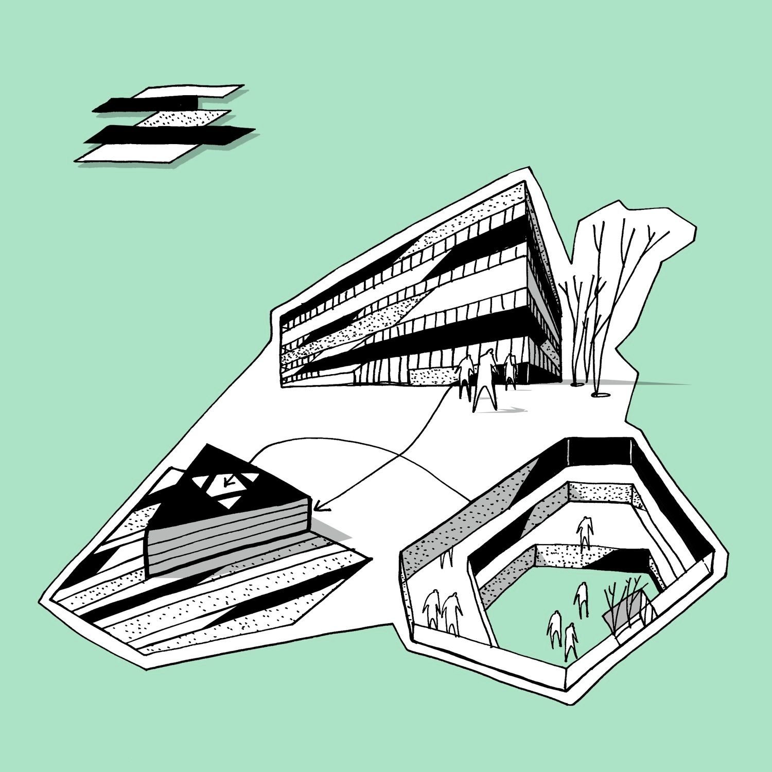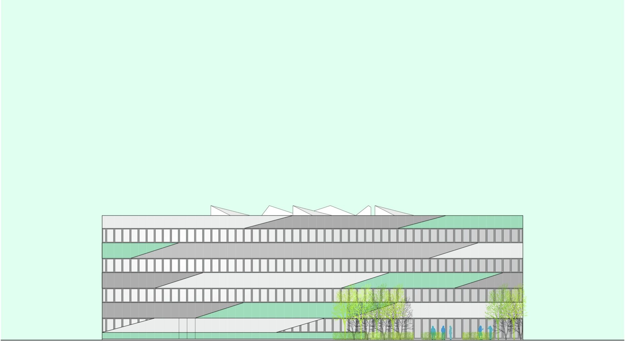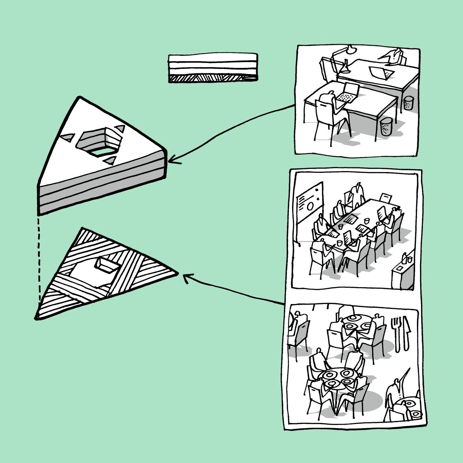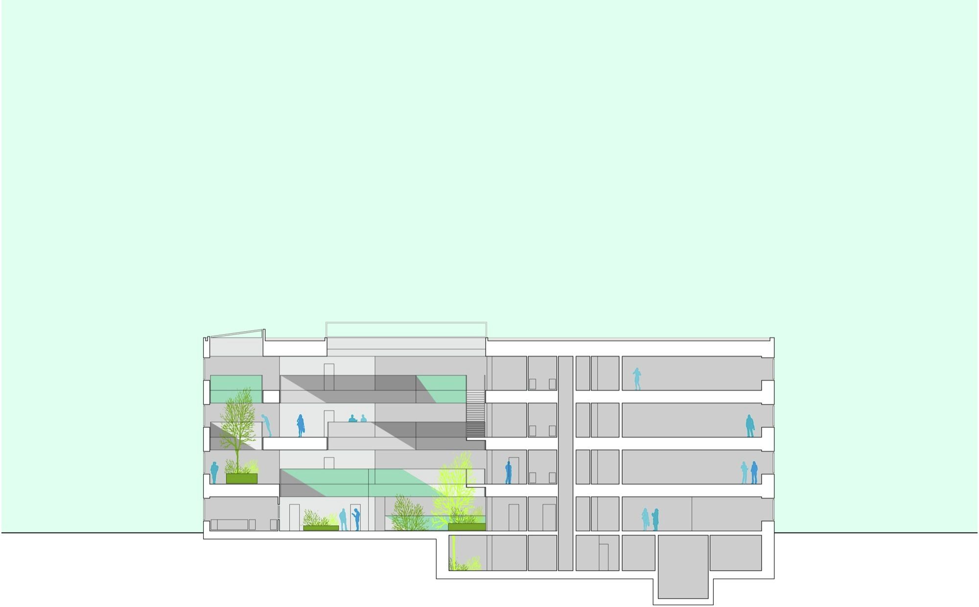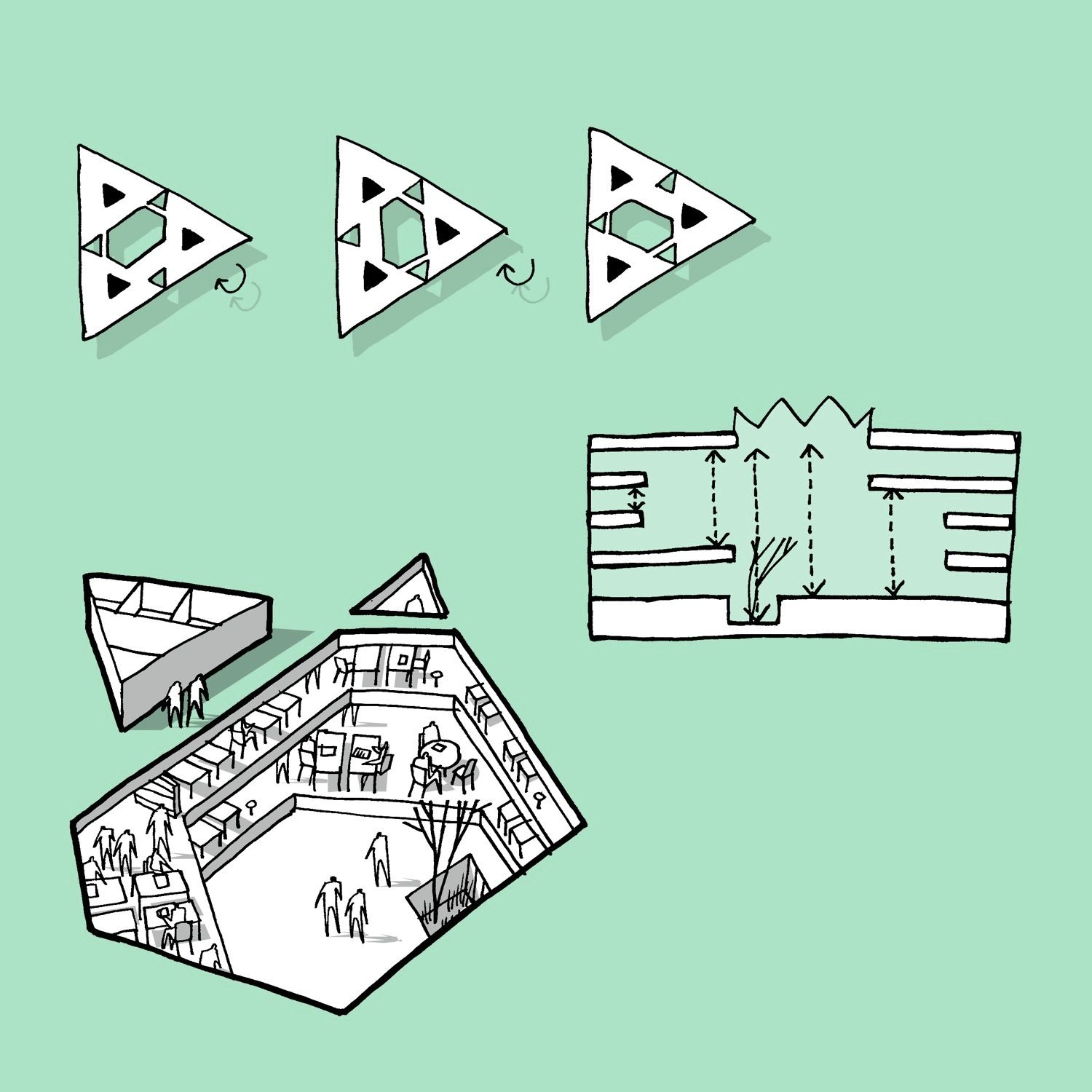 In order to divide the building into subsections, a triangular interior atrium is inserted. The atrium is rotated 180° so that its tips meet the building’s outer edges. Given its direct contact to the facades, the atrium’s shape and orientation allow a large amount of daylight to reach the building center. The tips of this central space are “cut off” by walkways and workspace areas, dividing the atrium into the main space and three small atriums. The main space is slightly asymmetric and rotates for each floor, so that varied spaces with different floor-to-ceiling heights emerge, which makes the building flexible and usable in different working situations. Thus, the internal contact between functions increases and becomes much more varied than in a traditional atrium building. In addition, this strategy also meets the ambition of providing manifold of different spatial qualities, which employees can turn to according to needs, mood or project.