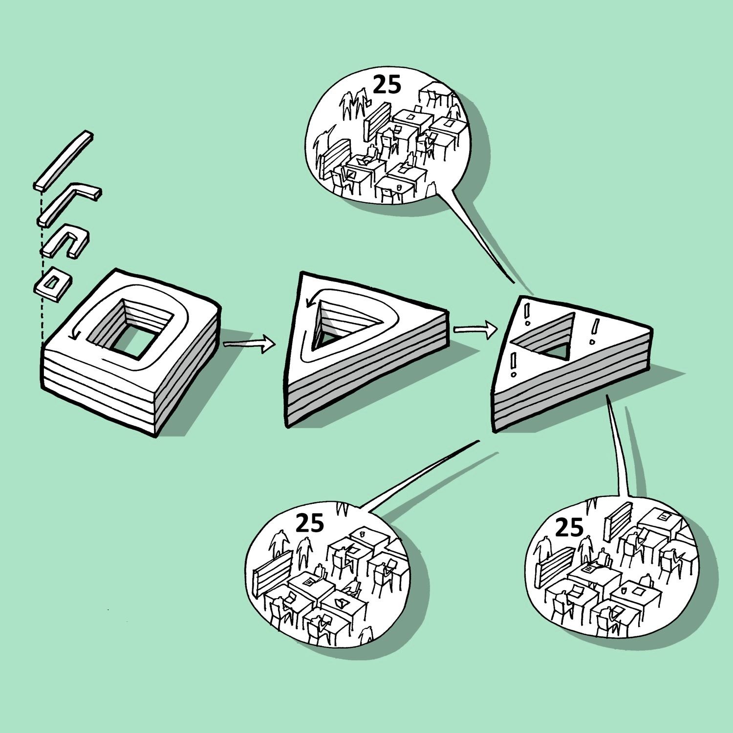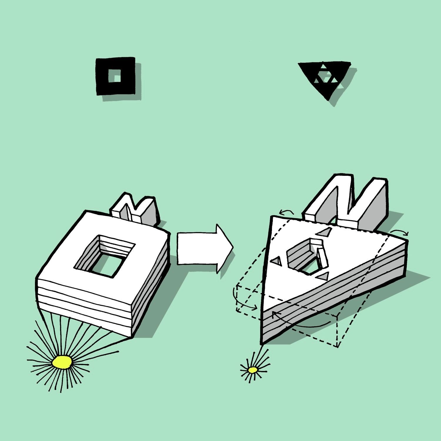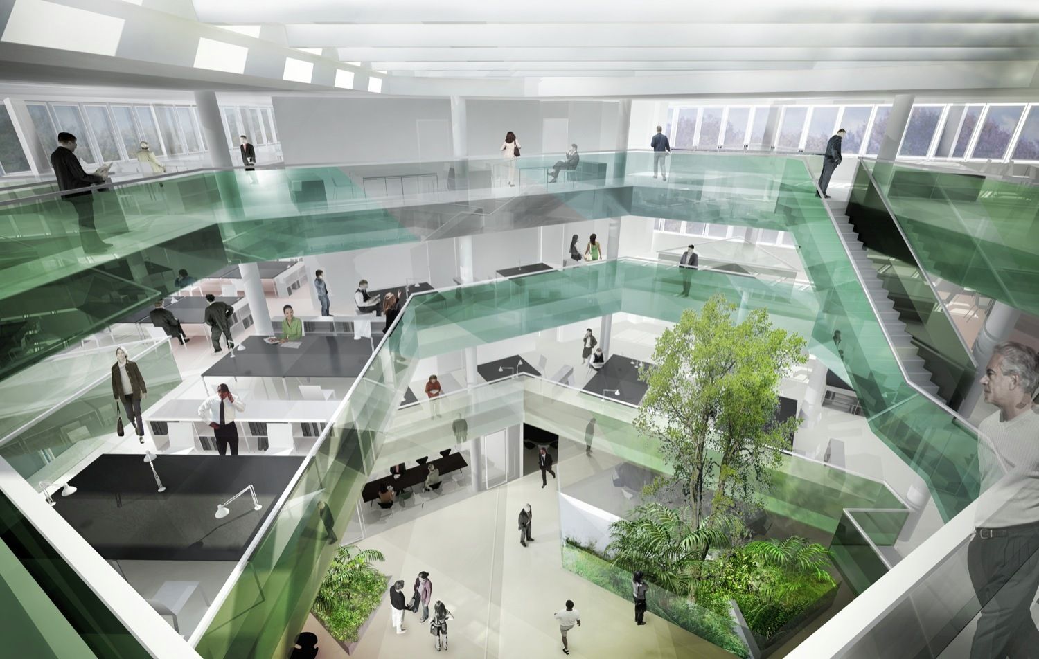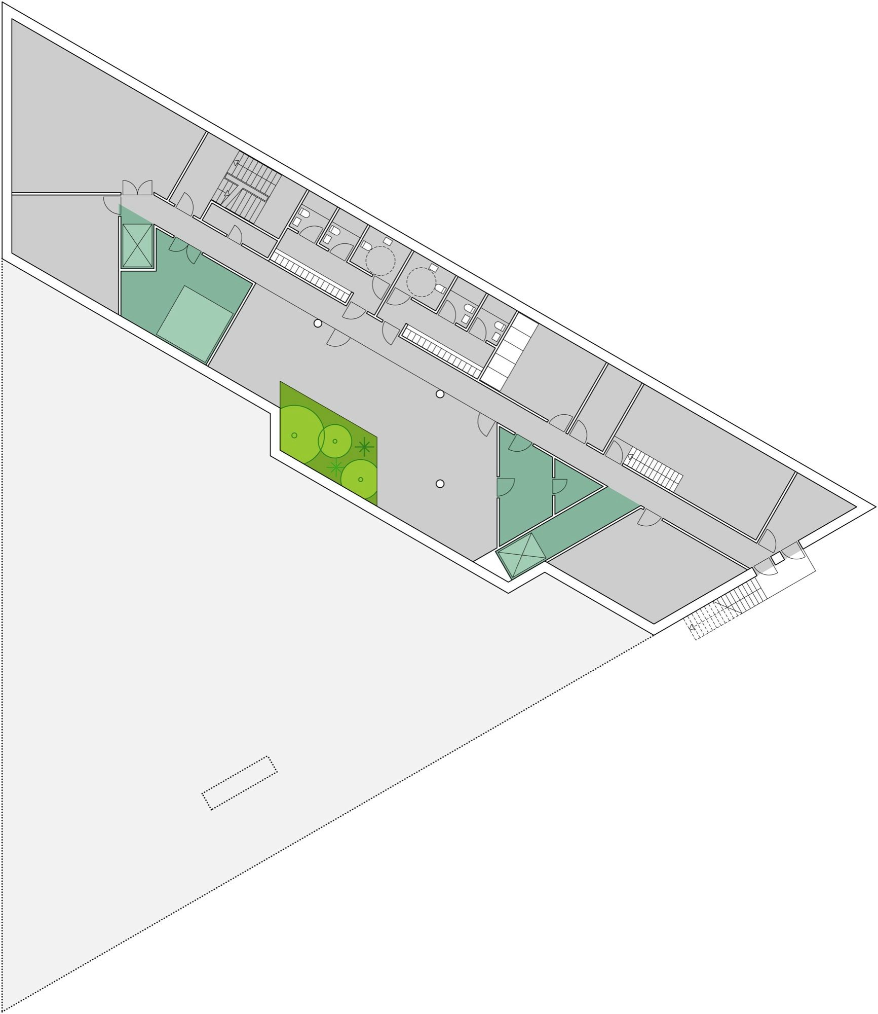 In order to divide the building into subsections, a triangular interior atrium is inserted. The atrium is rotated 180° so that its tips meet the building’s outer edges. Given its direct contact to the facades, the atrium’s shape and orientation allow a large amount of daylight to reach the building center. The tips of this central space are “cut off” by walkways and workspace areas, dividing the atrium into the main space and three small atriums. The main space is slightly asymmetric and rotates for each floor, so that varied spaces with different floor-to-ceiling heights emerge, which makes the building flexible and usable in different working situations. Thus, the internal contact between functions increases and becomes much more varied than in a traditional atrium building. In addition, this strategy also meets the ambition of providing manifold of different spatial qualities, which employees can turn to according to needs, mood or project.