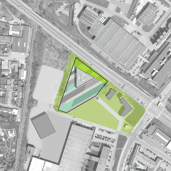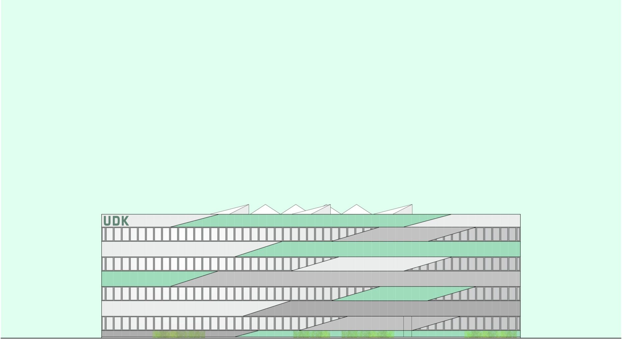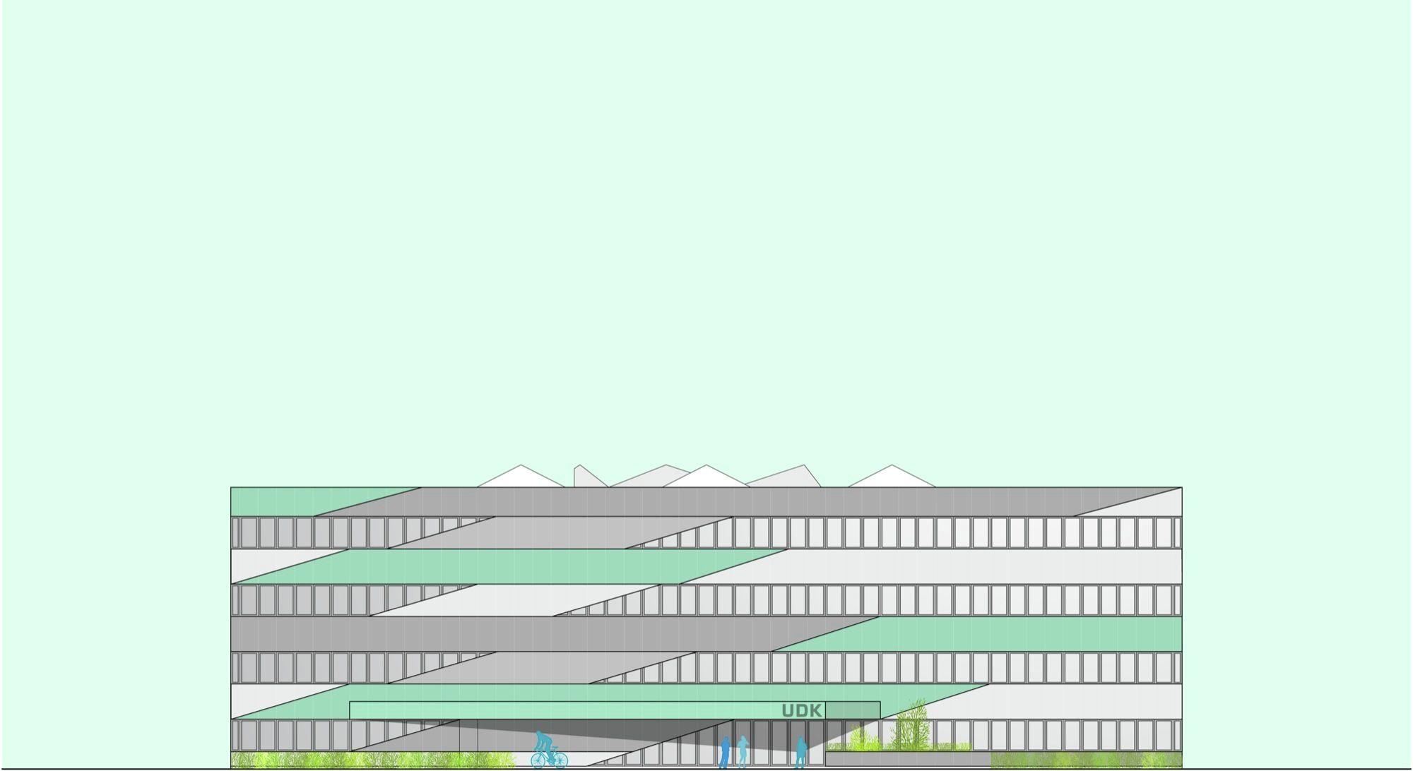 The triangular volume On this basis, the architects designed a characterful building that derives from a clear architectonic concept – a simple yet recognizable triangular construction with manifold and functional spatial formations that developed out of a conscious use of the triangle as shaping element. The triangle is an unusual shape in the Danish architectural landscape and thus, UDK will draw attention to itself, but without visually overpowering its surroundings.
