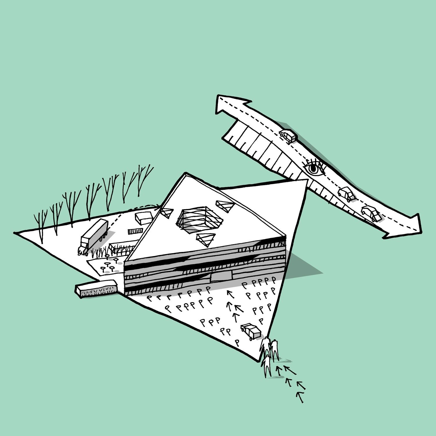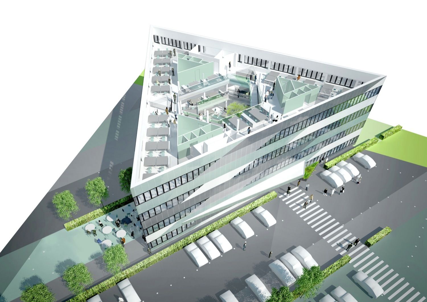 The triangular volume’s orientation on the site aims at creating an ideal combination of exposure, views, daylight conditions and reduced thermal stress. As one of the volume’s sides is oriented northwards there is no direct southern façade, which reduces the risk of overheating and the need for sunshades. The northern façade’s orientation towards the adjacent ring road enhances the building’s exposure and visibility while screening the employee’s terrace to the west and the entrance to the southeast from the road. Interior triangulation Throughout the interior the basic shape of the triangle creates a recognizable pattern that is applied consistently and in varying scales in order to extract valuable spatial qualities and functional subdivisions.