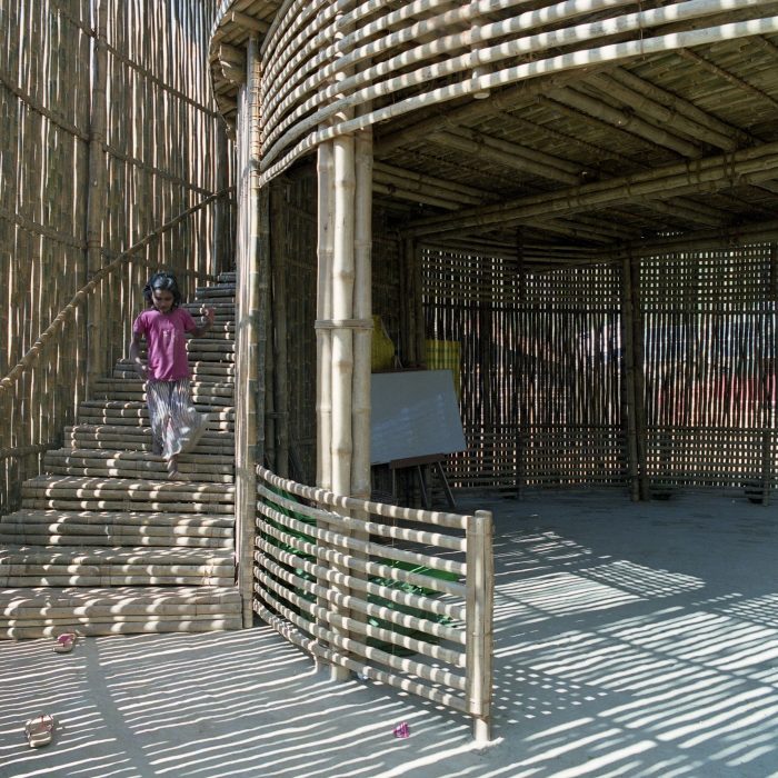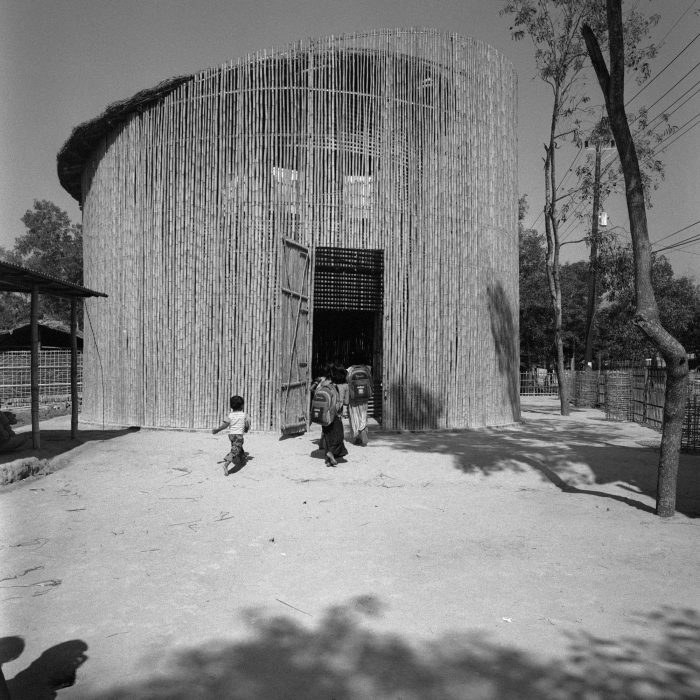 This prototype school was designed for construction within the Rohingya refugee camps, arguably the largest refugee camp in the world, in the southernmost district of Bangladesh close to the border with Myanmar. In view of government-imposed restrictions on the use of ‘permanent’ building materials like cement, brick, steel etc, the architect opted for the single most available bio-degradable material in the country: Bamboo.