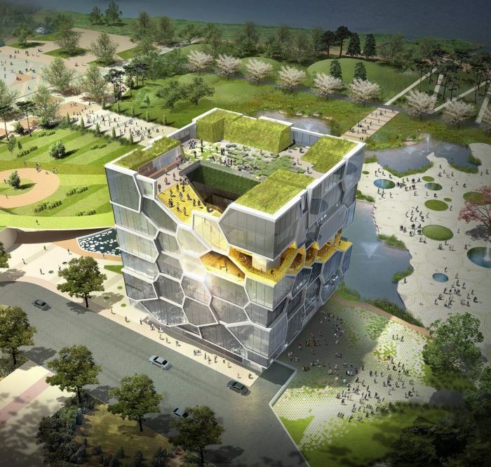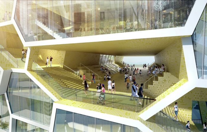 The memorial is comprised of smaller “cells” that appear to look honey comb in nature and was determined using a voronoi diagram. The cells are meant to represent the “collective nature of the UN’s identity” and fuse together to form the whole of the final shape of the building. Each piece functions differently as some provide exhibition space and others function as offices and restaurants. ACME explained that the “memorial should represent the nature of the United Nations, where many individual nations come together to create one entity, but without losing their individual identities.”