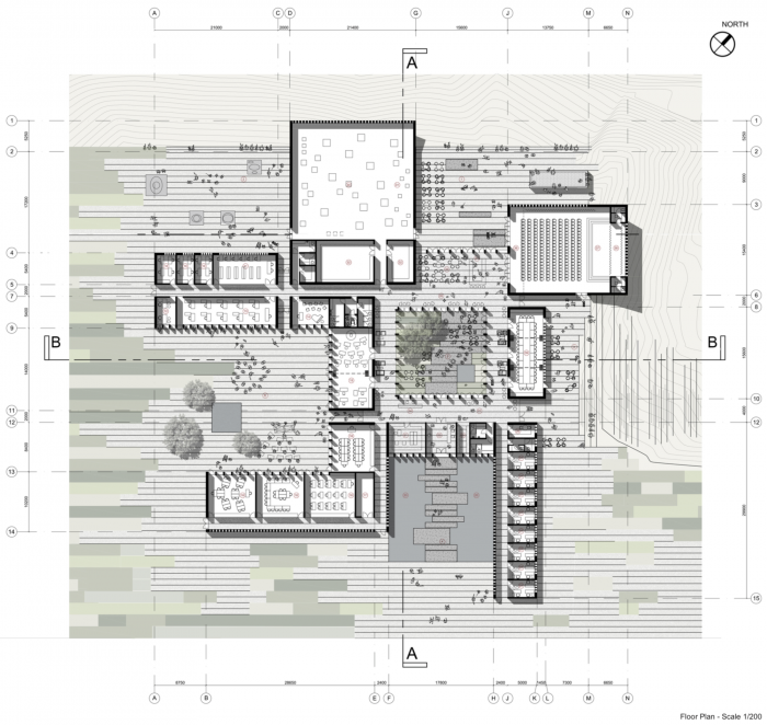 Set out like a piece of string lain upn a rocky steppe on arid land, this fluid concrete structure houses the cultural centre for Afghanistan. This rope-like structure encloses a re-imagined amphitheatre, its stage the lowest level of the natural landscape and the seating arranged on the naturally rising steppes.