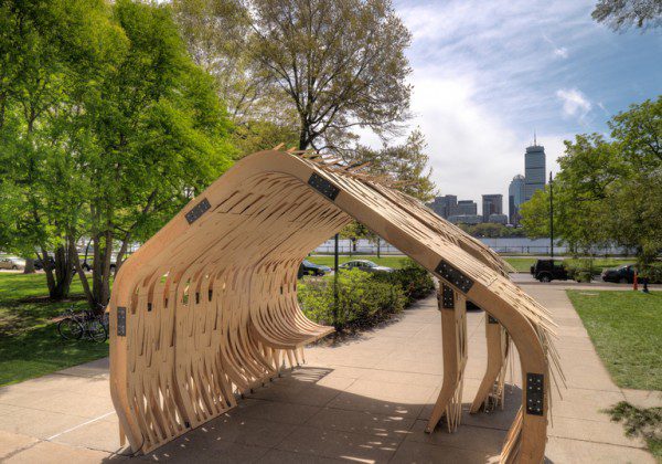 Situated on the MIT Campus, Cambridge Massachusetts, the freestanding pavilion leads the way for a ‘flat-to-form’ fabrication methodology. The structural and functional membrane of the pavilion was generated by the physical flexing of the material.