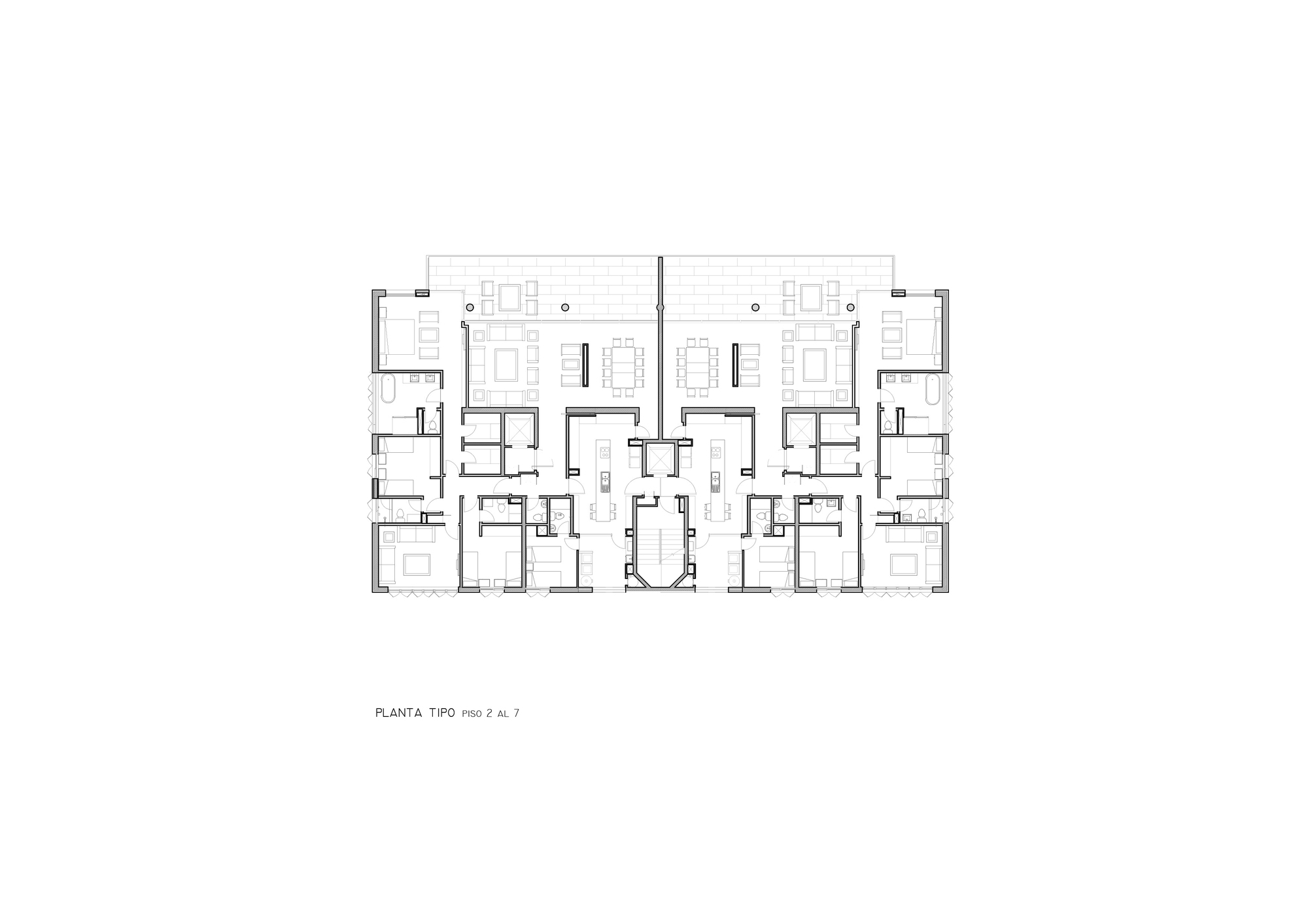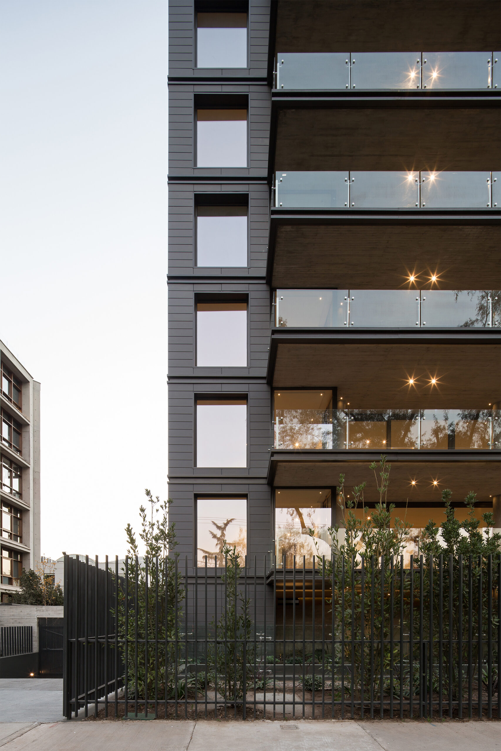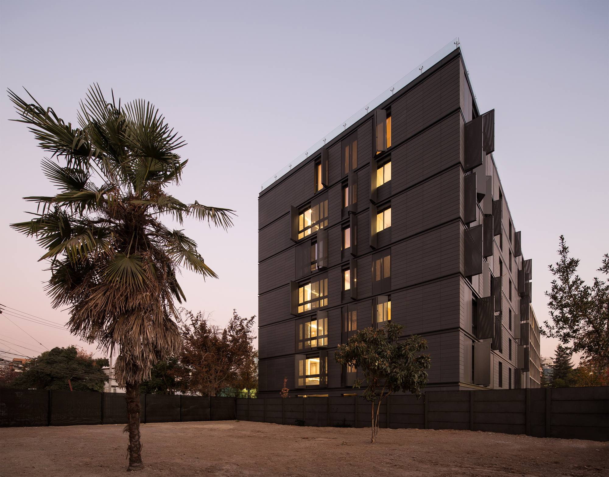 The “Único Building” is a group of twelve apartments distributed in eight floors, located in the area of Nueva Costanera. The simplicity of its rectangular volumetry, contrasts with its meticulous envelope treatment, created with the main objetive of obtaining maximum internal confort and control of privacy for its residents, thus avoiding the residents´problem of incorporating elements external to the project itself. For this reason, a second facade was designed independent of the main structure, allowing great thermal confort within enclosed wall areas and a dynamic solar control system and privacy in window areas. As a result, a great stony expression contrast was created with the dynamic perimetral perforated blinds. Continuous metal bands in every floor connect the terraces of the east facade with the envelope of the rest of the volume. These bands also incorporporate the guides that allow the blinds to slide.