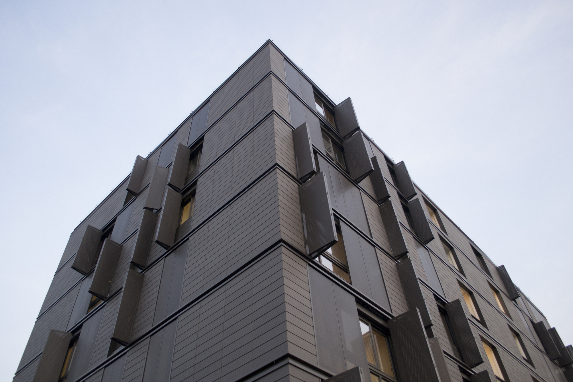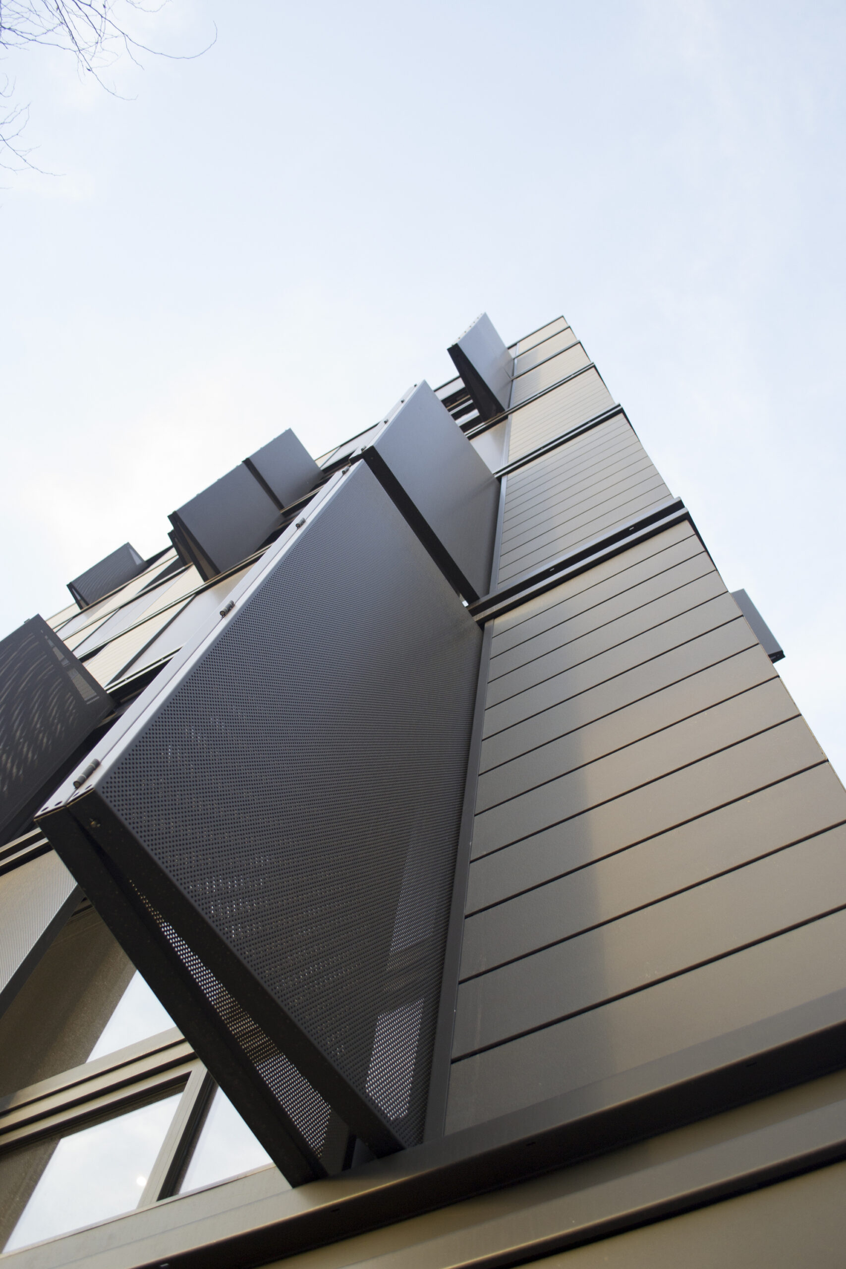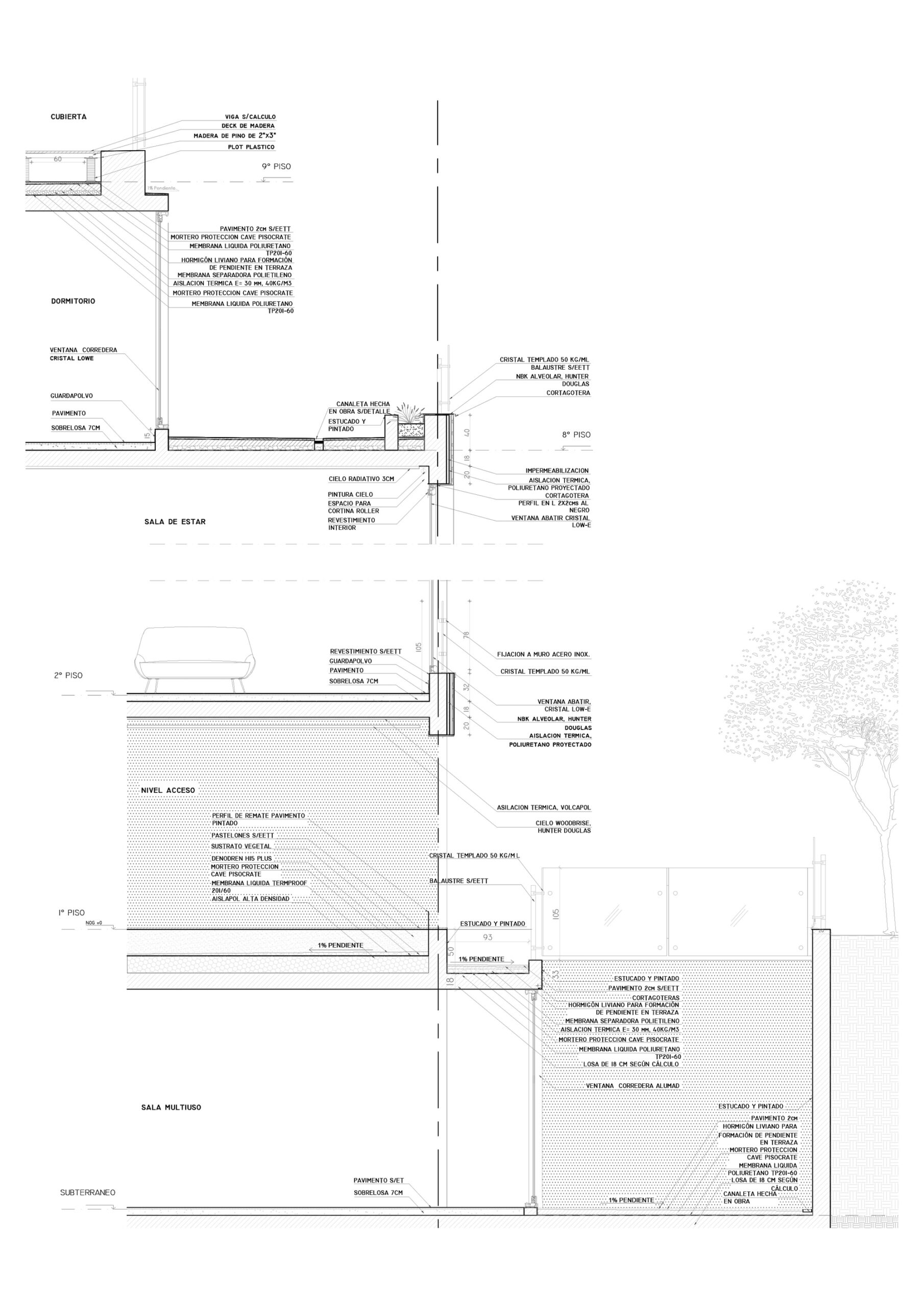 The Project was thought of considering the highest standards of passive thermal confort in order to minimize the necessity for thermal conditioning equipment. To achieve this, all facades have incorporated flame retardant sprayed polyurethane, as well as clay alveolar palmettes attached through metallic profiles to create the effect of ventilated facades. Solar control is achieved using cristal Low E type thermopanel windows, which were preceeded by microperforated metallic blinds. These elements have a double objetive. In the first place, they sift the light and control the amount of incoming heat of different spaces. Furthermore, these panels give the facades a kinetic effect, depending on the hour of the day and the specific use the owners give to each different area.