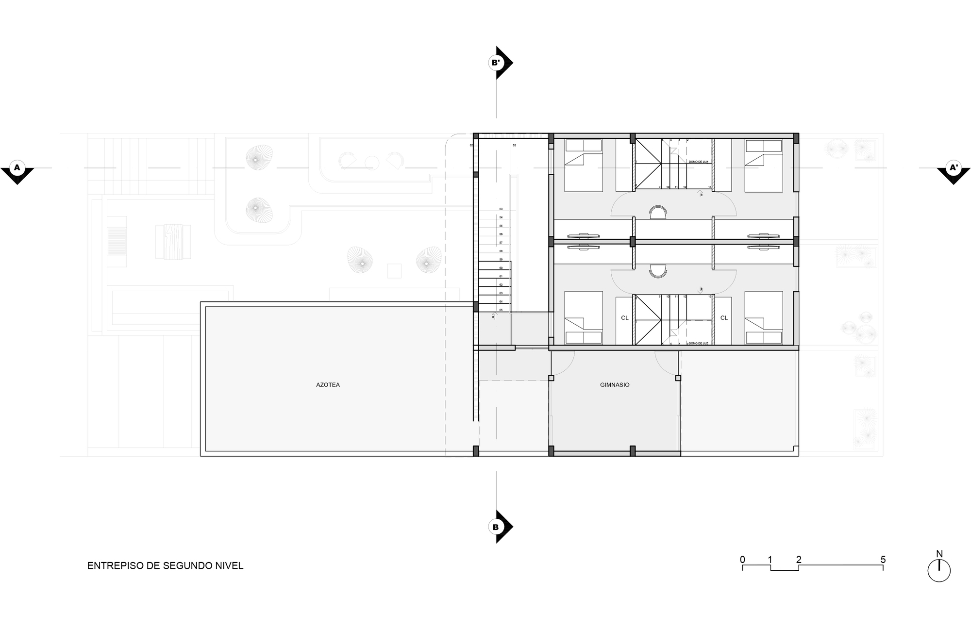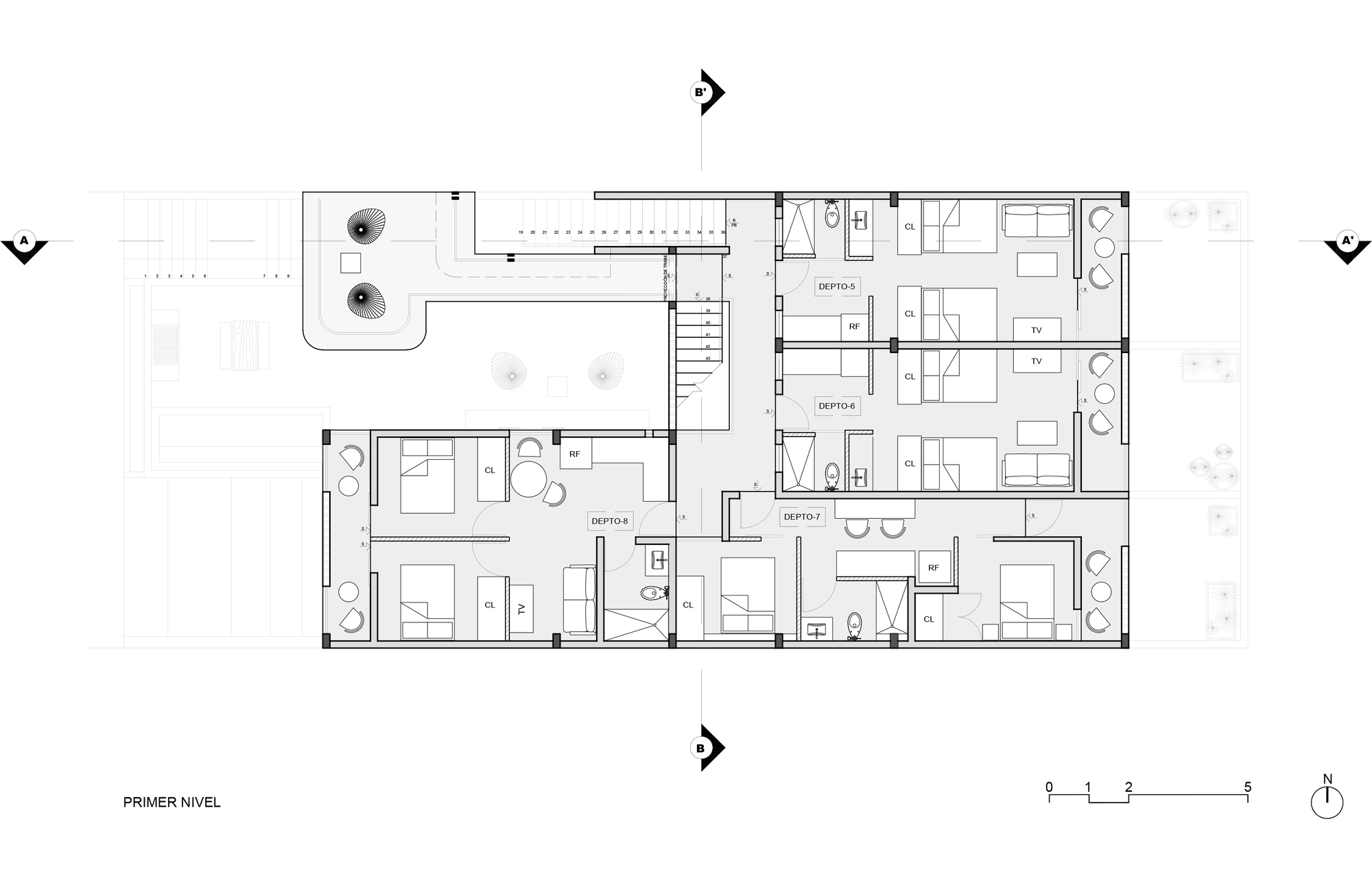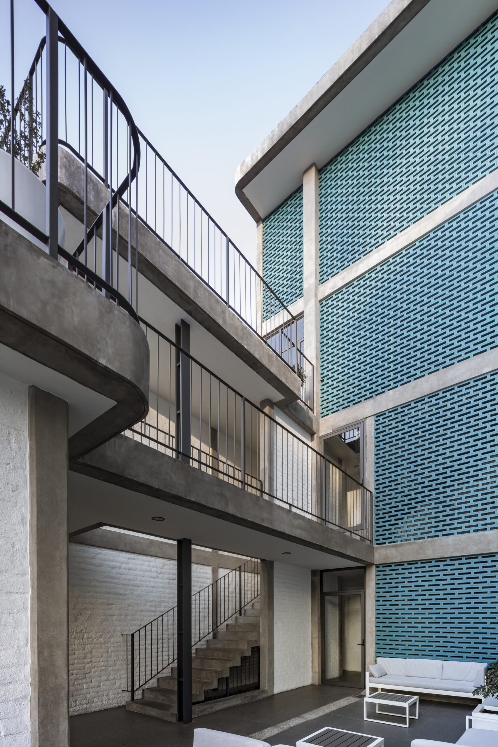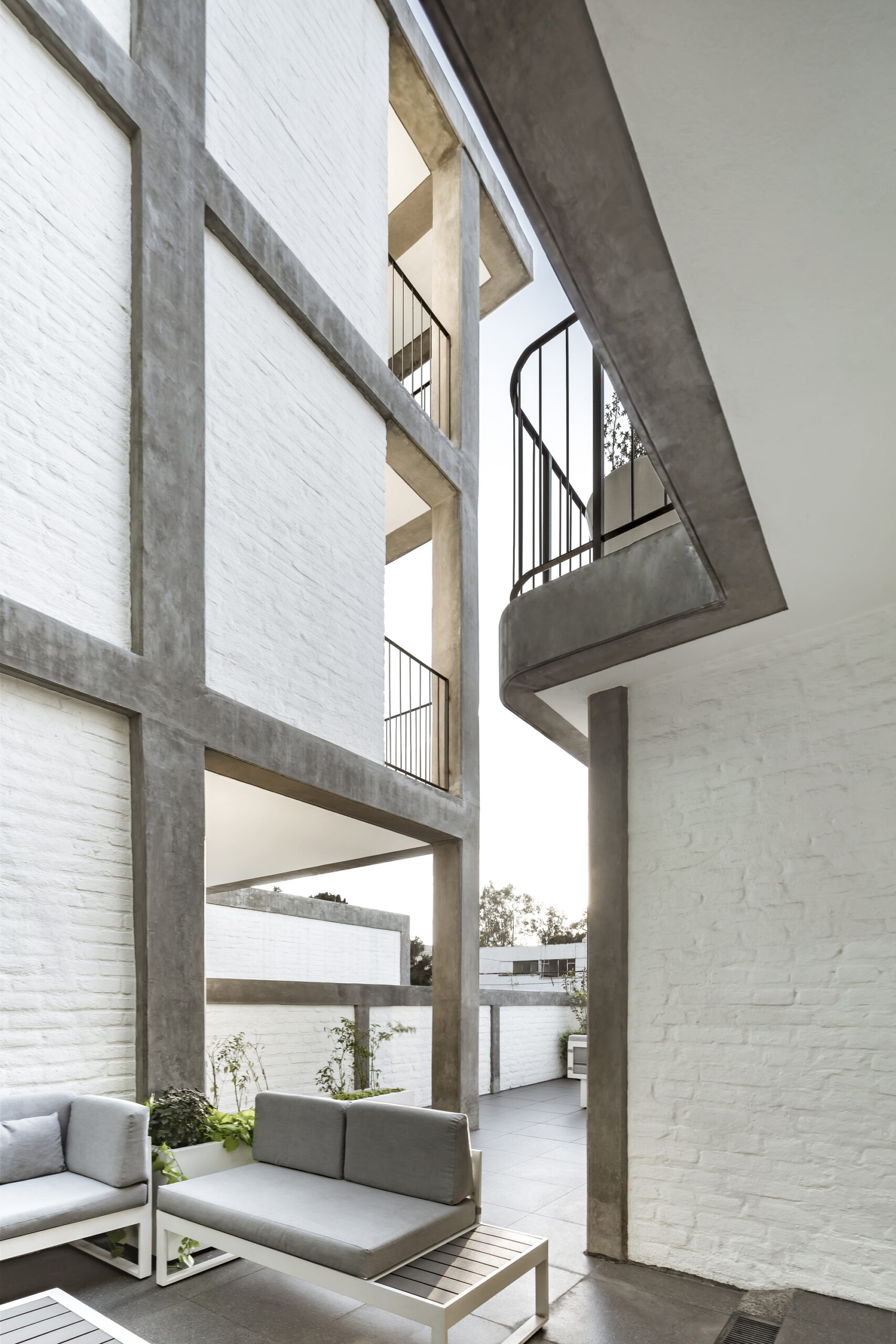 The main shape of the building is like a horseshoe. Then an important mass in the shape of an L rises up leaving a series of semi-open bridges in the rest of the extension. This is an open courtyard in the center of the building. That can be seen from some of the rooms and the staircase that circulates between the first, second, and third levels.