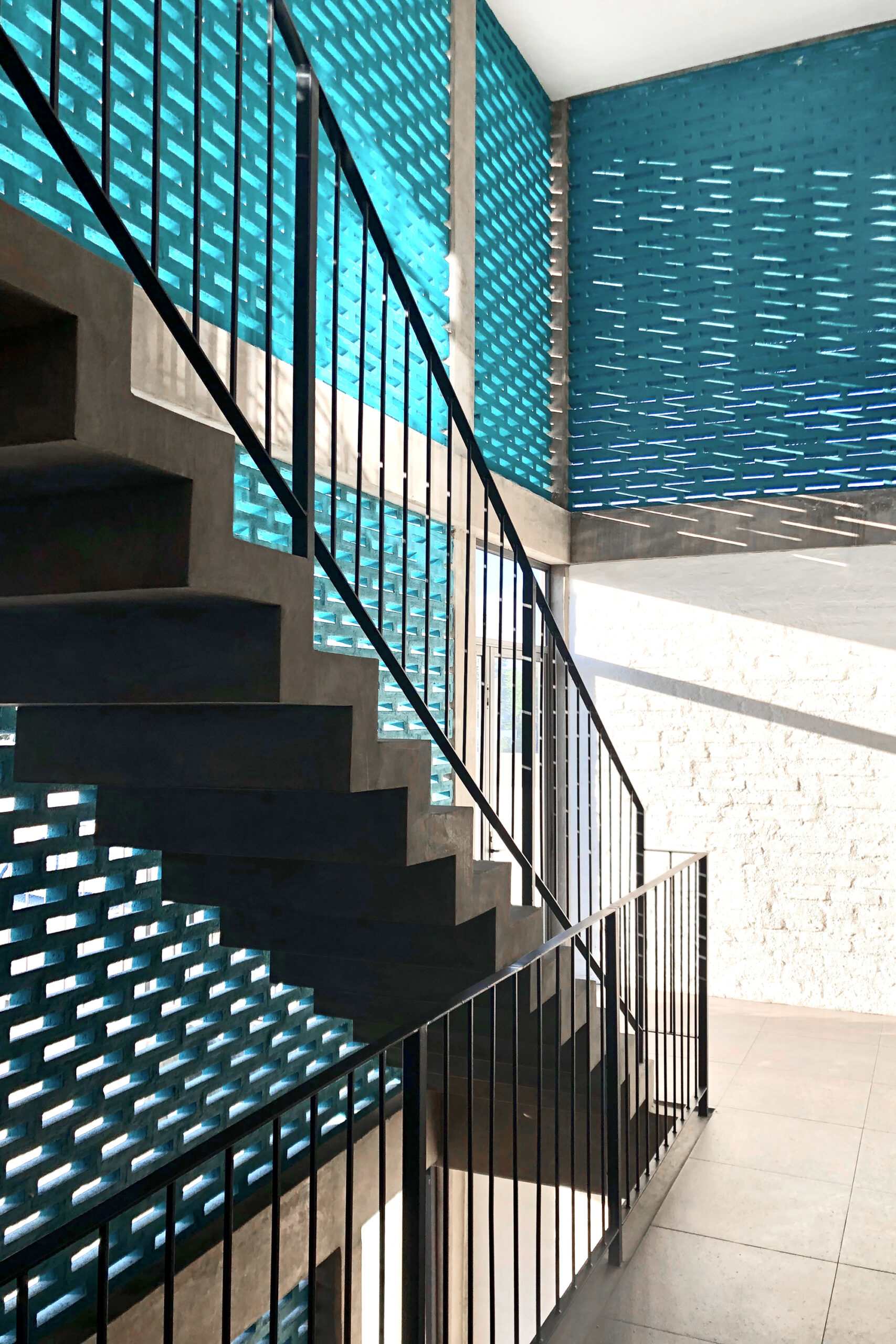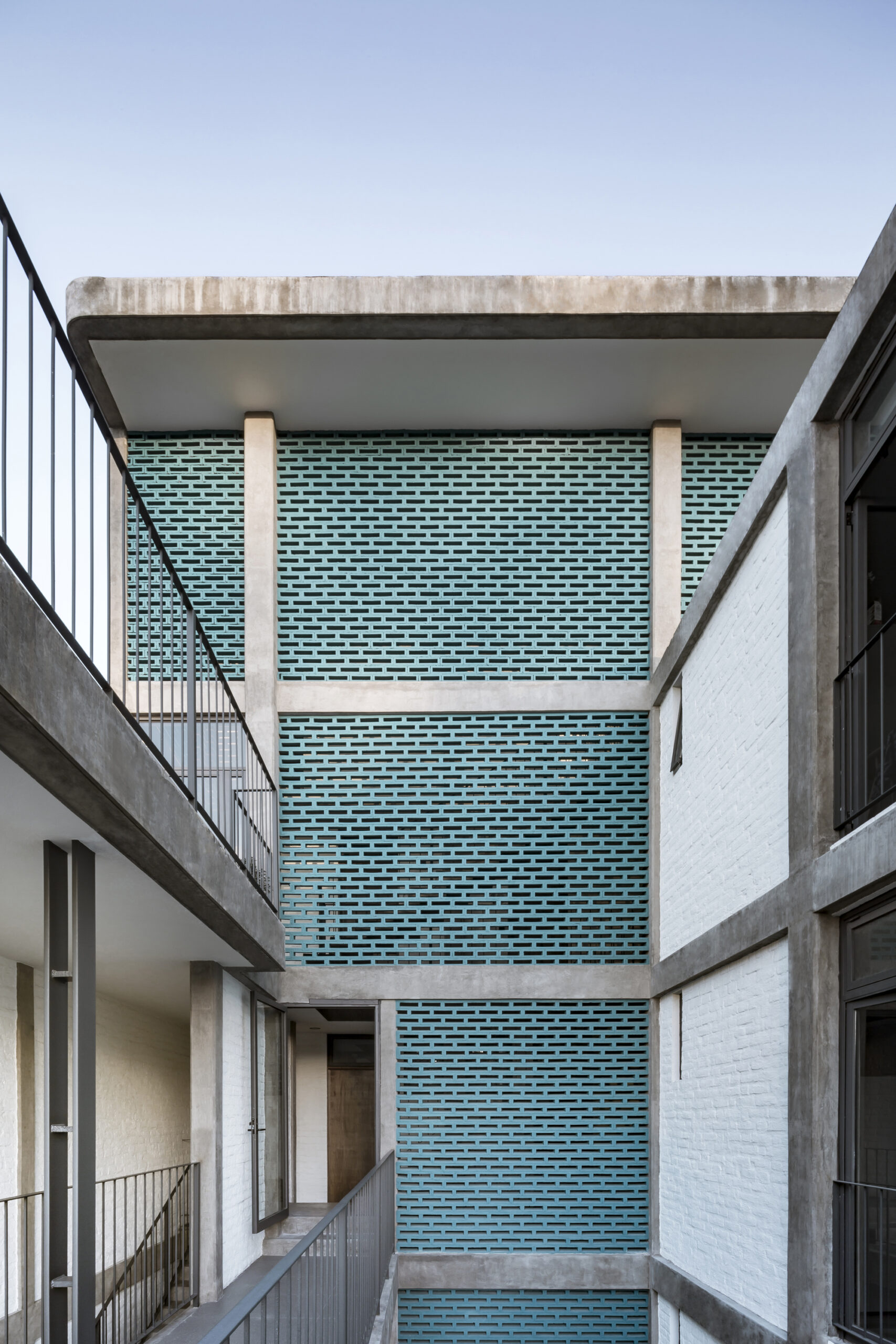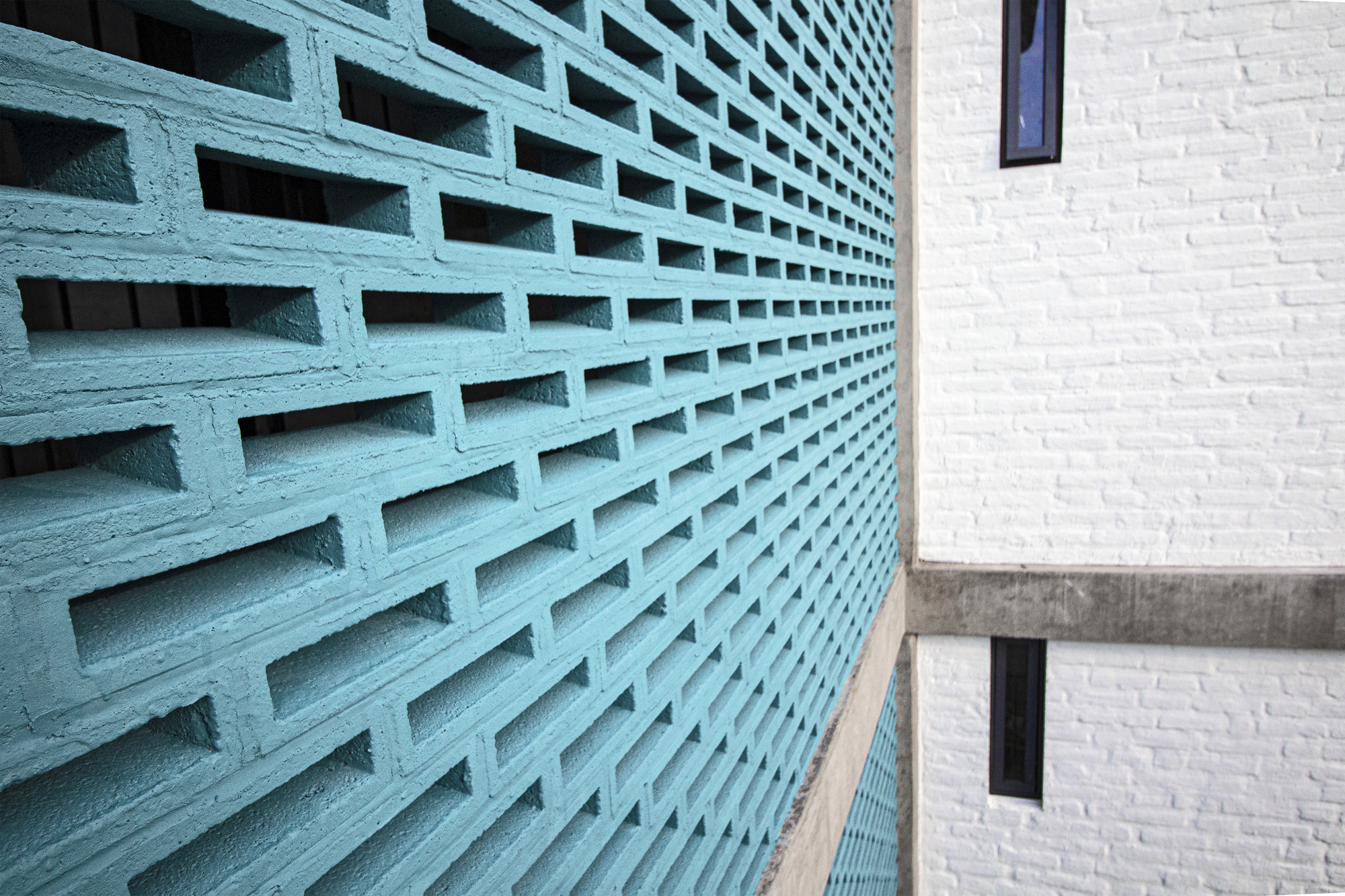 The sun is an important factor because it hits directly to the front and back facades. In order to reduce the solar incidence, a lattice membrane was used to cover most parts of the building.