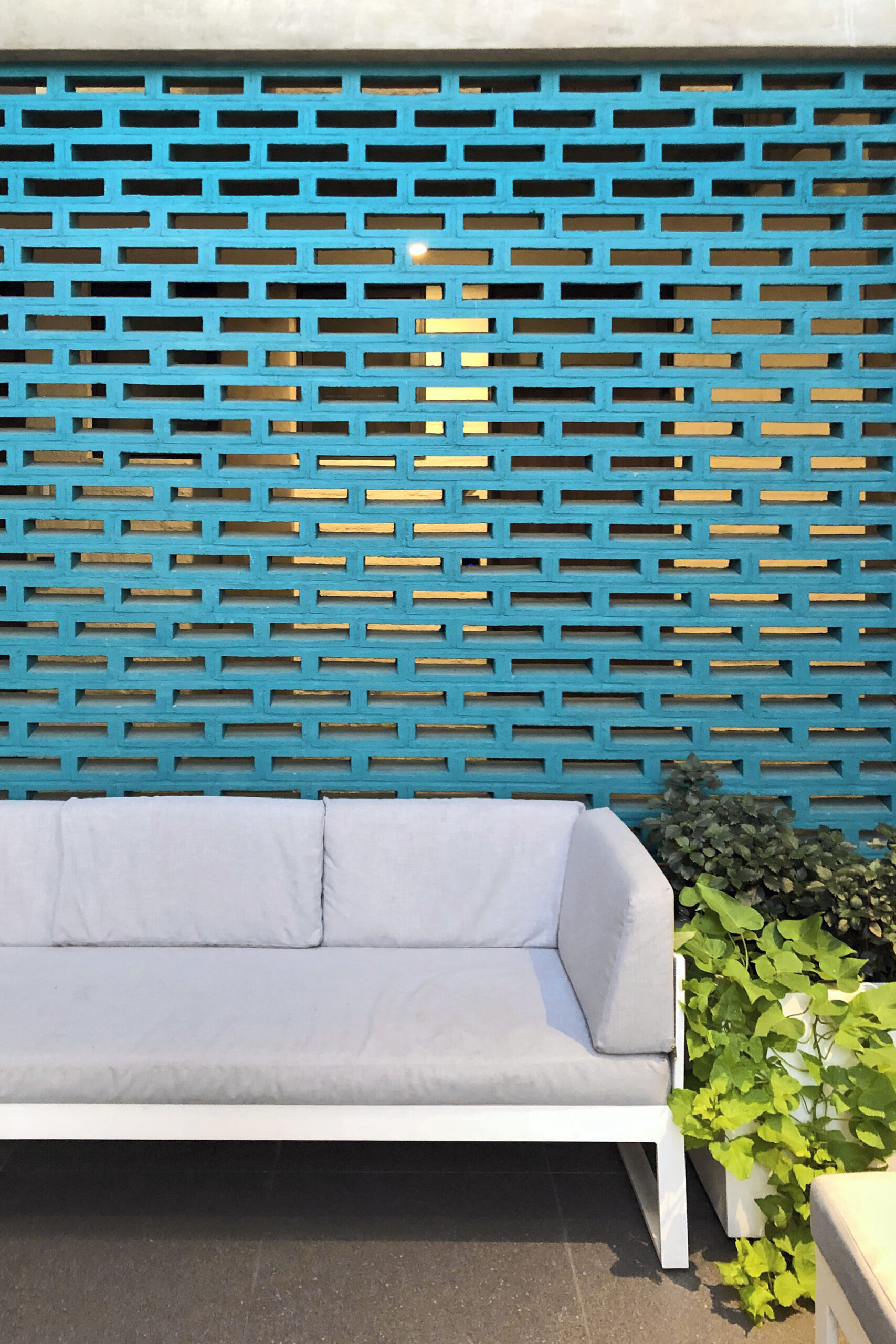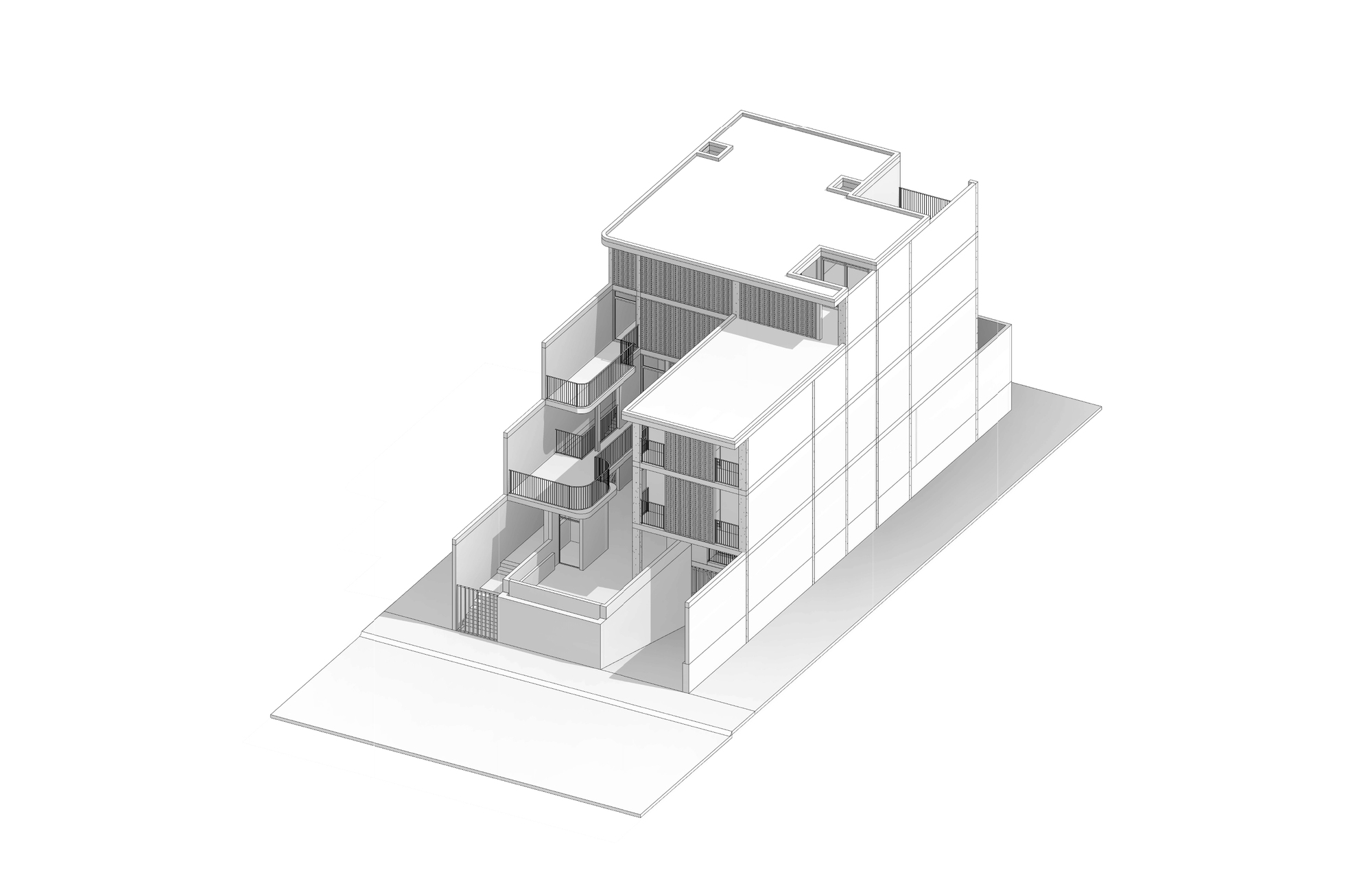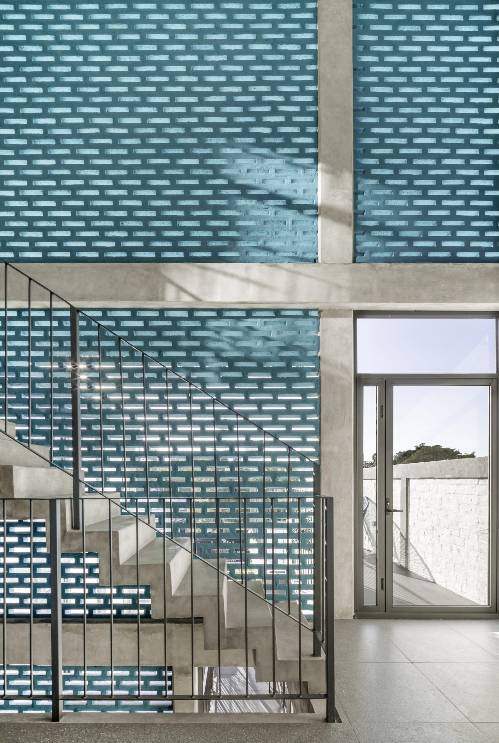 The sun is an important factor because it hits directly to the front and back facades. In order to reduce the solar incidence, a lattice membrane was used to cover most parts of the building.