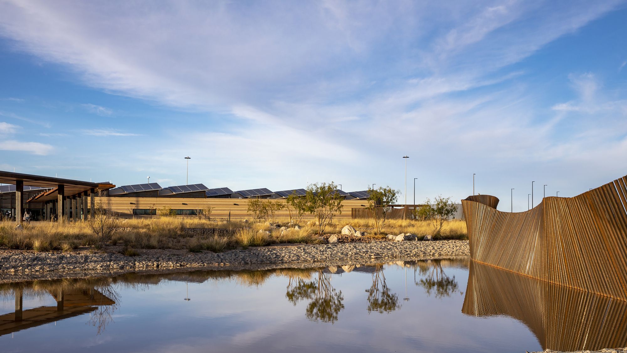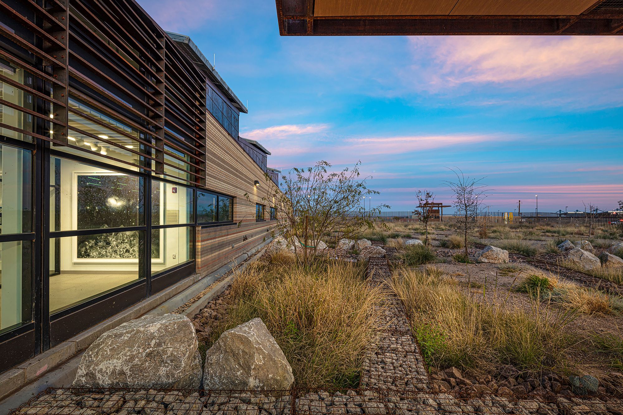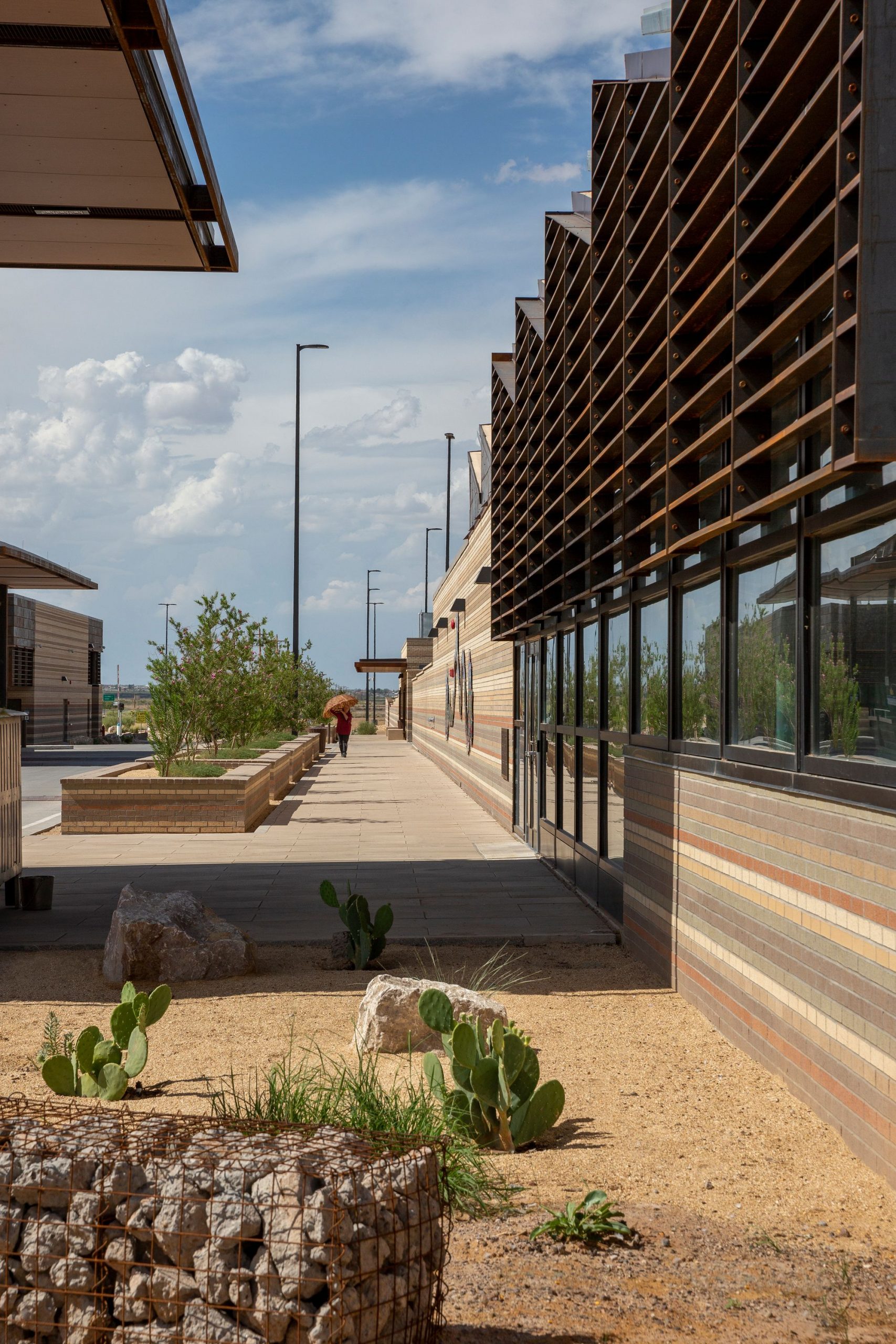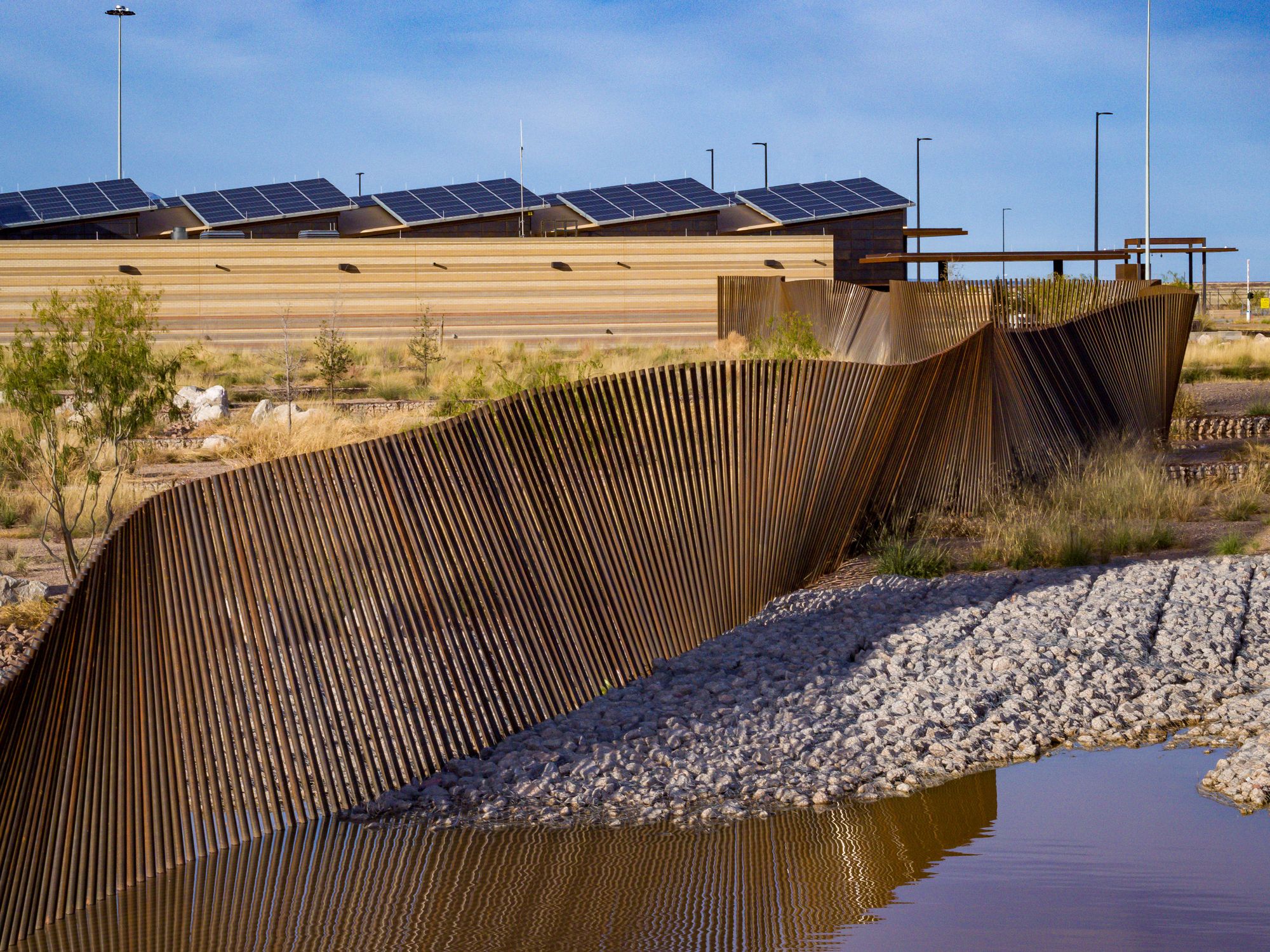 The designs integrated and expressed response to the breadth of sustainable design opportunities is the mechanism for creating and conveying this message. The rhythm and silhouette of photovoltaic, clerestoried roof monitors echo distant mountains. Colored brick strata and weathered steel extend the patterns and colors of the desert earth and grasses that reach the horizon. Terraced native landscaping and a sculpted ground plane convey the story of the scarcity, the harvest, and the power of water in the desert while moderating historical regional flood hazards to neighboring Puerto Palomas. Shaded exteriors and daylit interiors shelter, diffuse, and harness the intense desert sun.