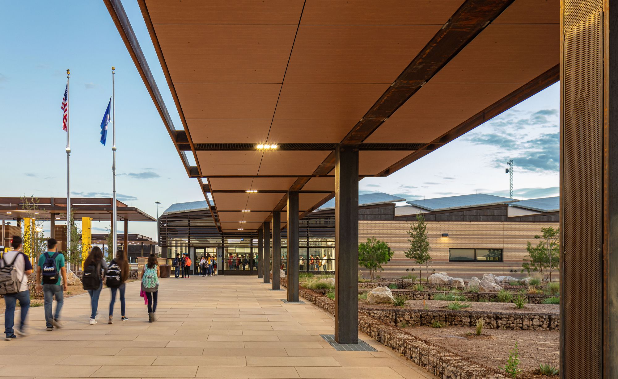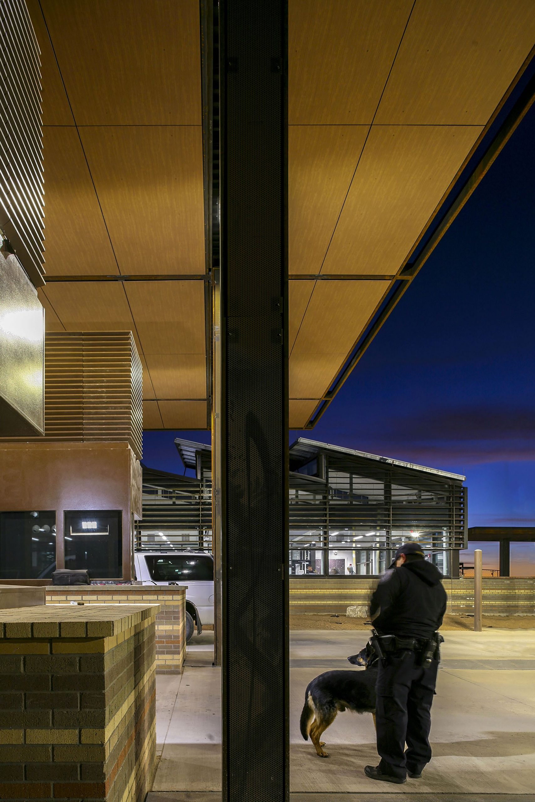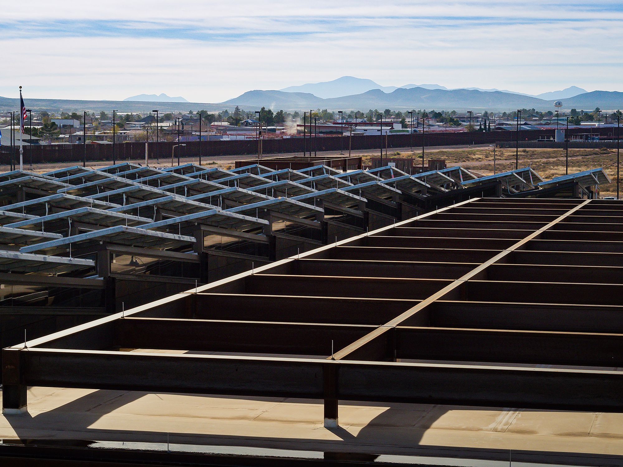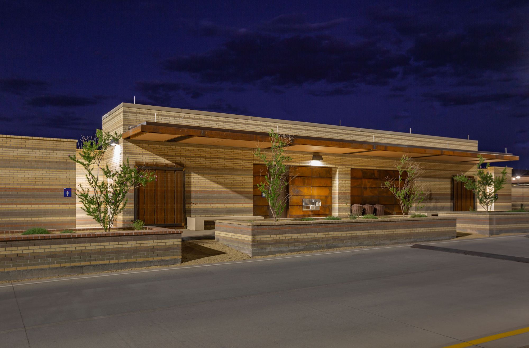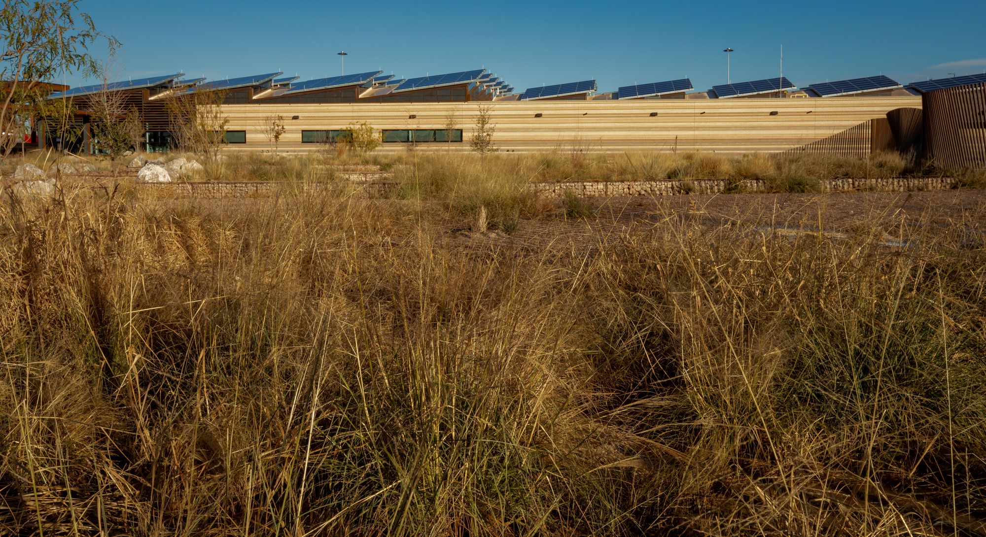 The designs integrated and expressed response to the breadth of sustainable design opportunities is the mechanism for creating and conveying this message. The rhythm and silhouette of photovoltaic, clerestoried roof monitors echo distant mountains. Colored brick strata and weathered steel extend the patterns and colors of the desert earth and grasses that reach the horizon. Terraced native landscaping and a sculpted ground plane convey the story of the scarcity, the harvest, and the power of water in the desert while moderating historical regional flood hazards to neighboring Puerto Palomas. Shaded exteriors and daylit interiors shelter, diffuse, and harness the intense desert sun.