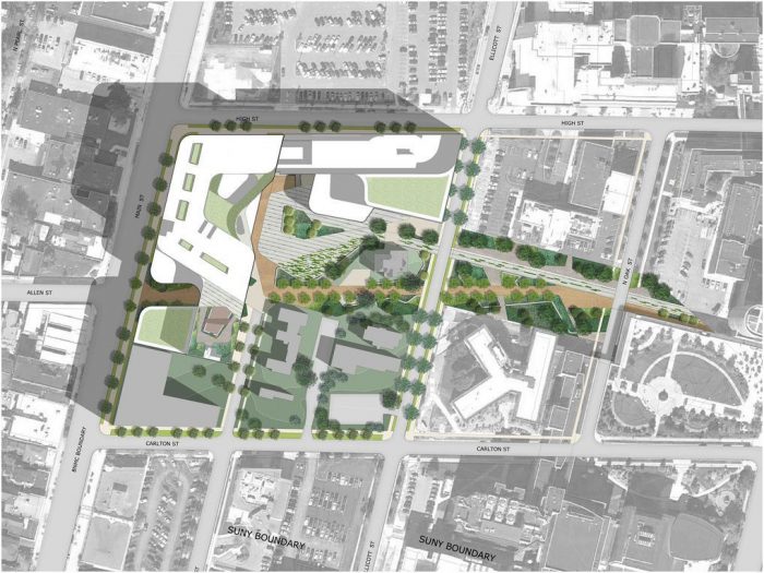 “This building will be a linchpin in our downtown campus, an anchor in the Buffalo health sciences community and a hub for excellence in medical research, education and patient care. It will be a prominent new feature in the skyline of a city known worldwide for its architectural treasures”, President Satish K. Tripathi said. “Responding to all these needs is a tall order, but HOK has amply demonstrated that it has all the right tools to rise to the challenge: innovative vision, expertise in green design and in the planning of 21st century health science facilities and a clear understanding of the unique potential of our medical school and the communities it serves”. he added.