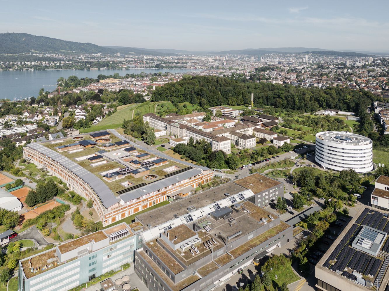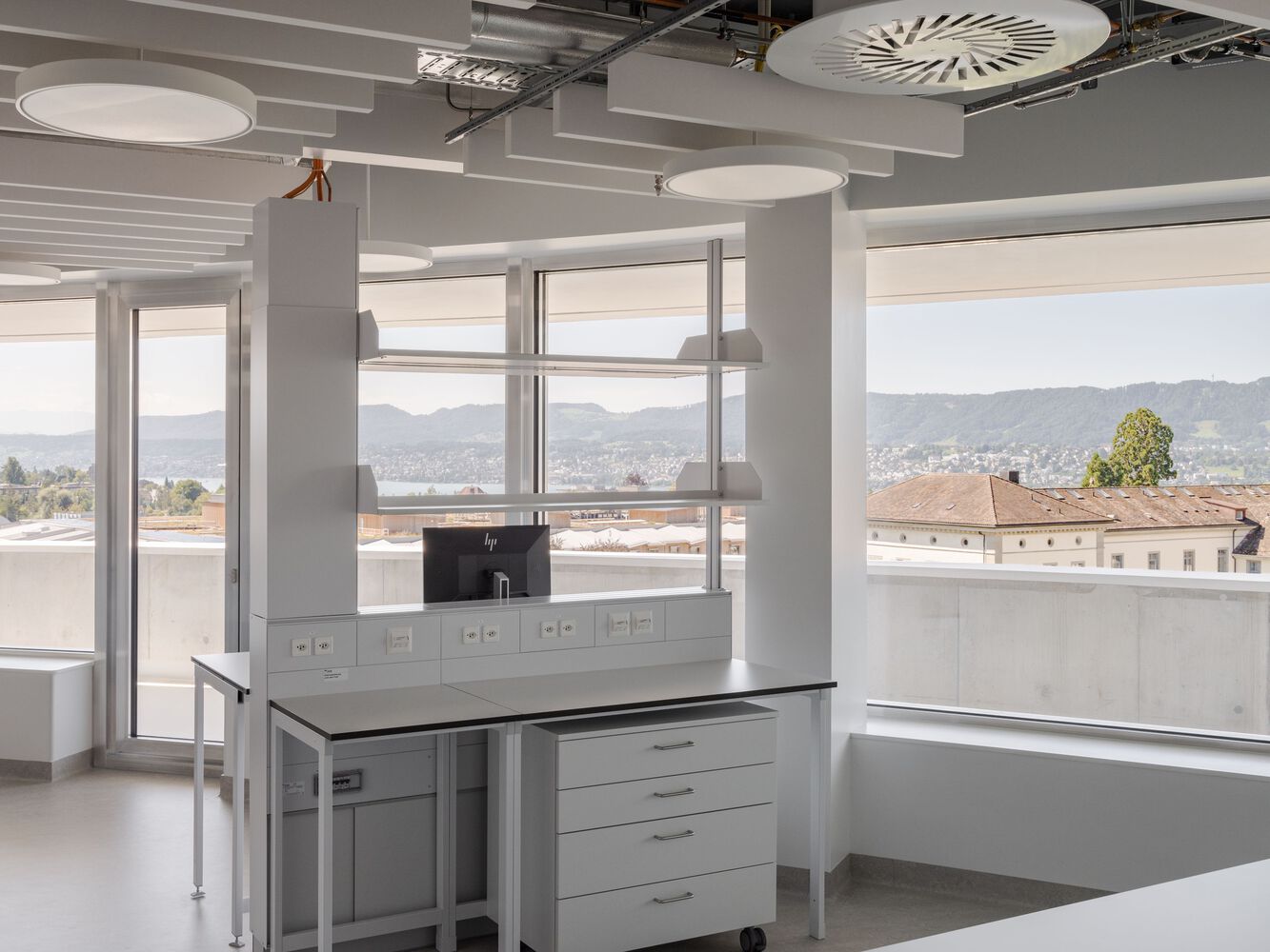 Embedded in an expensively designed landscape, the research and teaching building is a standalone structure amid a fruit orchard similar to those in many Burghölzli gardens. The building itself speaks an abstract, clearly geometric language and makes use of few materials. Cantilevered balconies with tall railings painted white give the building the appearance of being both weighty and airy at once. The two facilities of the Children’s Hospital, though different and distinct, are complementary. Situated on the hill, the circular building for research and teaching guides the gaze towards the lake. The elongated, horizontal shape of the acute-care hospital fits into the flat landscape, providing a view of the mounting rage behind it. The hospital focuses on each patient as an individual, and that means not only the healing process but the well-being of relatives and staff as well. The building for research and teaching highlights exchange and collaboration among scientists and students, which is a prerequisite of forward-looking research.