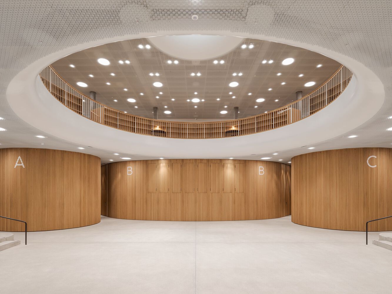 The Research and Teaching Facility – The rooms of the cylindrical, white building for research and teaching are organized around a central atrium, encouraging exchange and collaboration among researchers. An agora for teaching and study spreads out under this central space and responds directly to the surrounding landscape. Three lecture halls step into the natural slope of the terrain. Daylight streams in from outside, and thanks to movable walls, the lecture halls, lobby, and café can be reconfigured into one large space. This creates an agora with a stage in the middle for special events and room for an audience of 670 people. A gallery overfed contains open workplaces for students. Adjoining seminar rooms on the same level complete the spaces available for university teaching. Laboratories for research and diagnosis with accompanying offices on the five floors above have an unobstructed view of the surrounding landscape. Open workspaces are arranged around the atrium for the use of doctoral students and laboratory staff. From them, one can see several stories at once as well as the agora below, which is in turn connected to the atrium above through an oculus—a small, round hole in the ceiling.