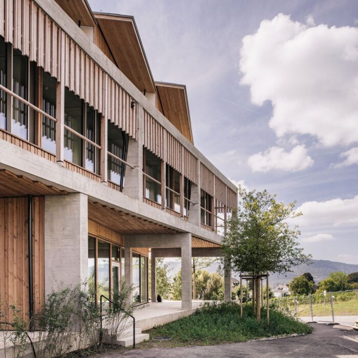The new University Children’s Hospital lies in Zürich-Lengg, at the foot of a hill known as Burghölzli. It is adjacent to other hospital buildings from several eras and is the largest facility for children and adolescents in Switzerland. It consists of two buildings: the acute-care hospital and the research and teaching facility. The acute-care hospital to the south consists of a three-story concrete frame with intricate wooden infills that blend into the landscape. The interior functions like a town: the medical specialties are neighborhoods with squares and connecting streets. On each of the three floors, a central main street runs past various green courtyards that provide orientation and bring daylight into the building. The patients’ rooms on the roof are like individual cottages.
