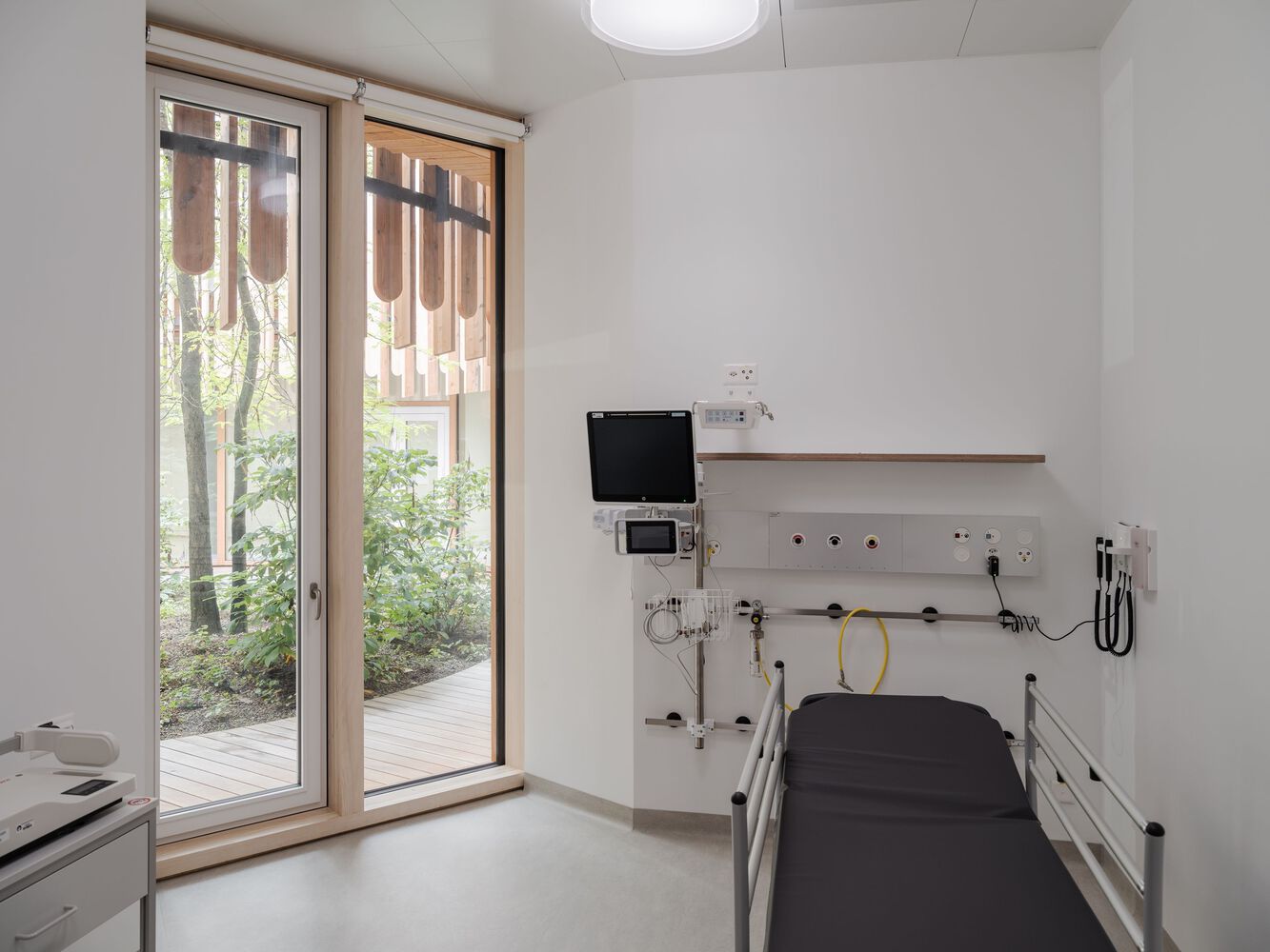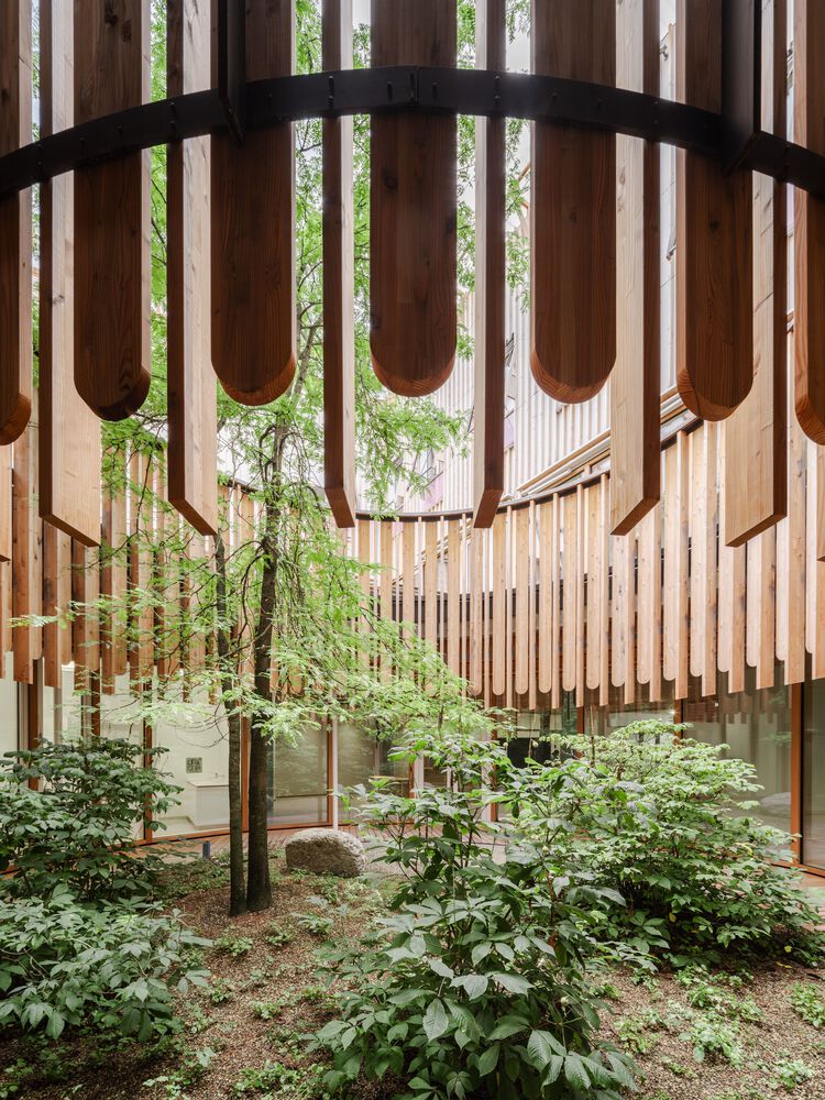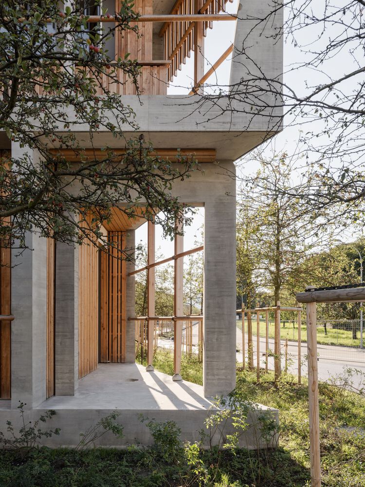 In the center of the second floor, additional services are located on both sides of the main street, such as the hospital school, the pharmacy and other shared uses. An officescape oriented towards the outside is wrapped like a wreath around this central zone and provides some 600 workspaces for medical and administrative staff. The top floor, the quietest area in the hospital, is reserved for children and adolescents, and inpatients who are staying overnight or longer. Each of the 114 rooms is designed as a wooden cottage with a roof of its own, providing privacy, a view of the green outdoors and enough room for parents to spend the night with their children. There are four centers along the main street in the immediate vicinity of the cottages, where children and adolescents can receive transdisciplinary treatment. The façade of the hospital consists of a three-dimensional, load-bearing concrete structure. It combines the first and second floors. The depth of the façade and the infill, which may be wood, glass, fabric, or vegetation, varies depending on orientation and the activity inside. Lightweight construction materials have been used consistently throughout the building except for the concrete supports and the circulation cores. In this way, departments can increase or decrease in size: the flat building with its distinctive shape thus ensures the interior flexibility that is so crucial for hospitals. The top floor with the inpatient rooms is set back and speaks an architectural language of its own. The rooms are staggered and have rooftops with varying inclinations. The individualized, elementary shape of the cottages underscores the singularity of each and every patient.