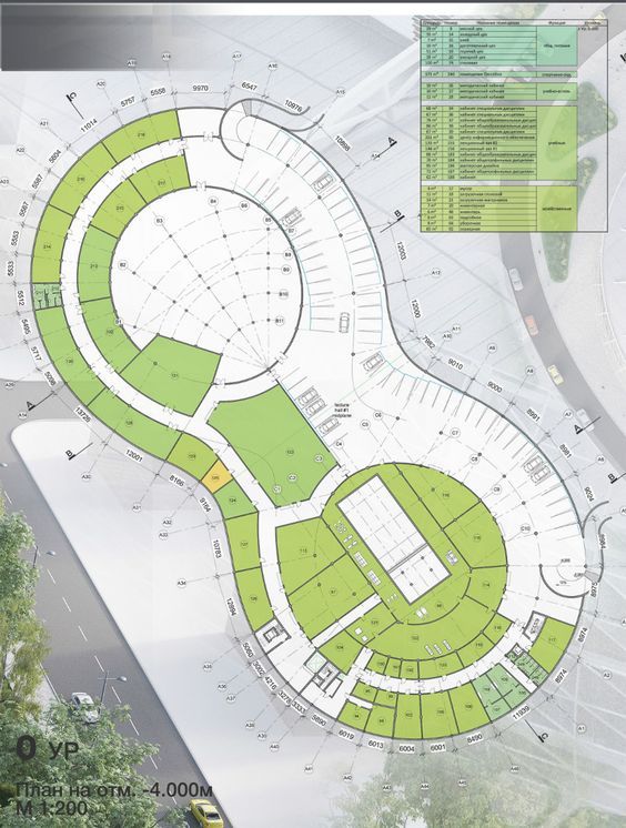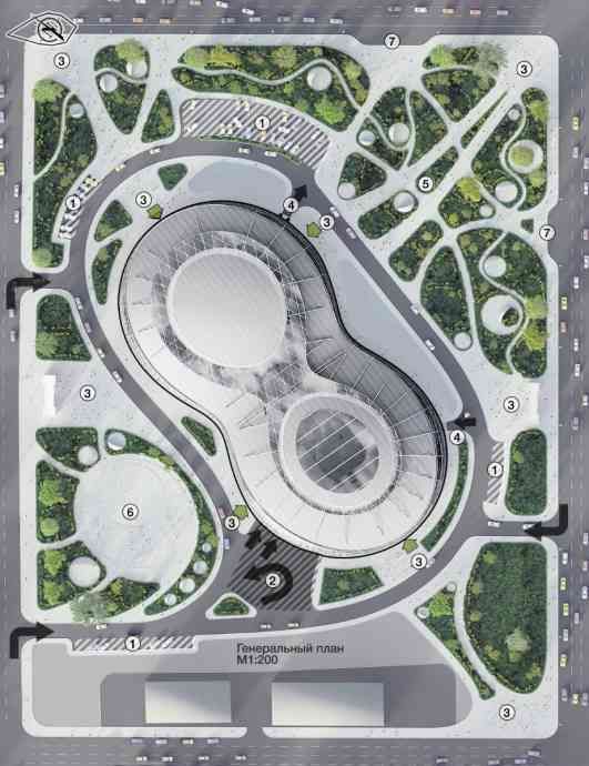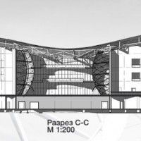 In order to shape the architectural solution of the project, two main functional centers of the building were taken into account – Concert Hall and Sport Center. It helped find a geometrical shape that allowed an optimal positioning of all important functional units, an effective communication between them and form the main social node – recreational – exhibition space. This open atrium space, in the center of the building – is a new element in the planning structure of an educational institution. It stimulates students to share information and spread knowledge, and also helps organize exhibition and demonstration events.