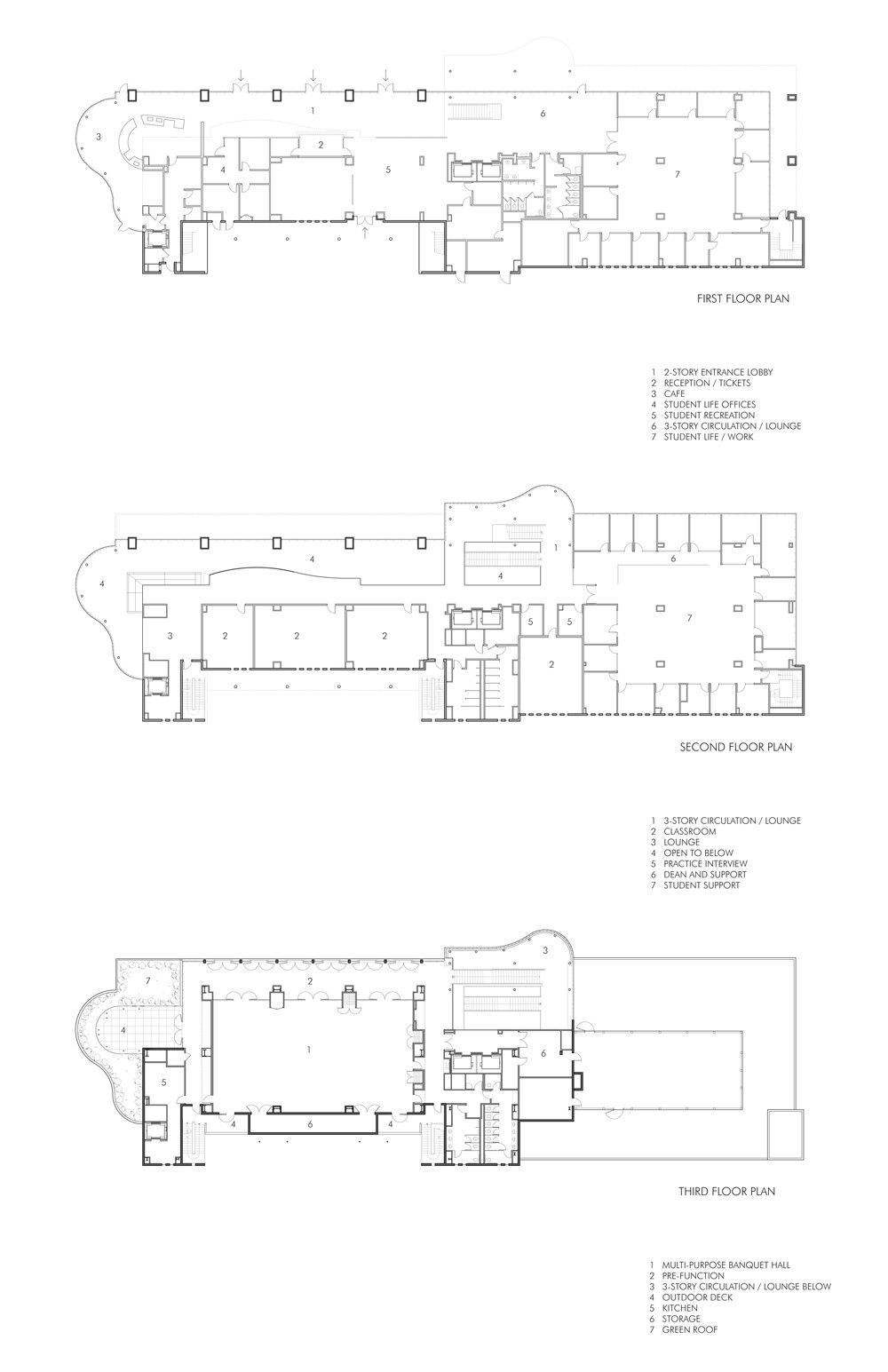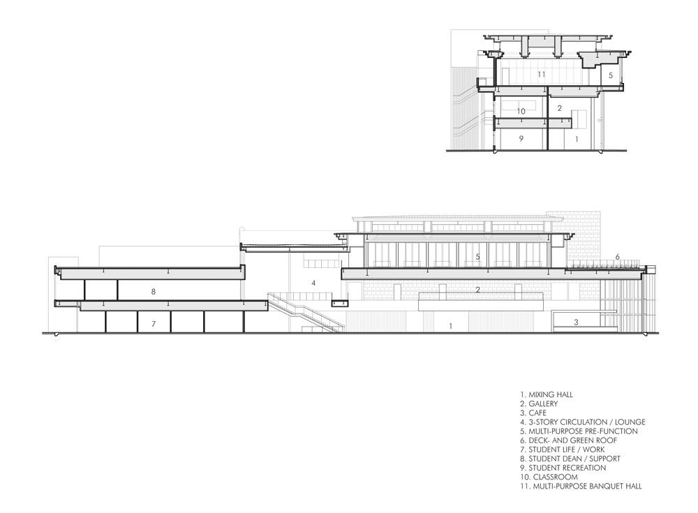 Additionally, the north-facing curtain wall makes a statement, of maximum transparency of Campus Center activities literal window onto the life of the campus. Day and night, a student or campus visitor will be able to ‘read’ the building’s activities and occupants from the exterior of the building, whether driving of walking. This celebration legibility of Campus Center activity will be exposed on all three levels, its visible Mixing Hall encouraging campus social sharing, academic collaboration, recruitment, and retention.
