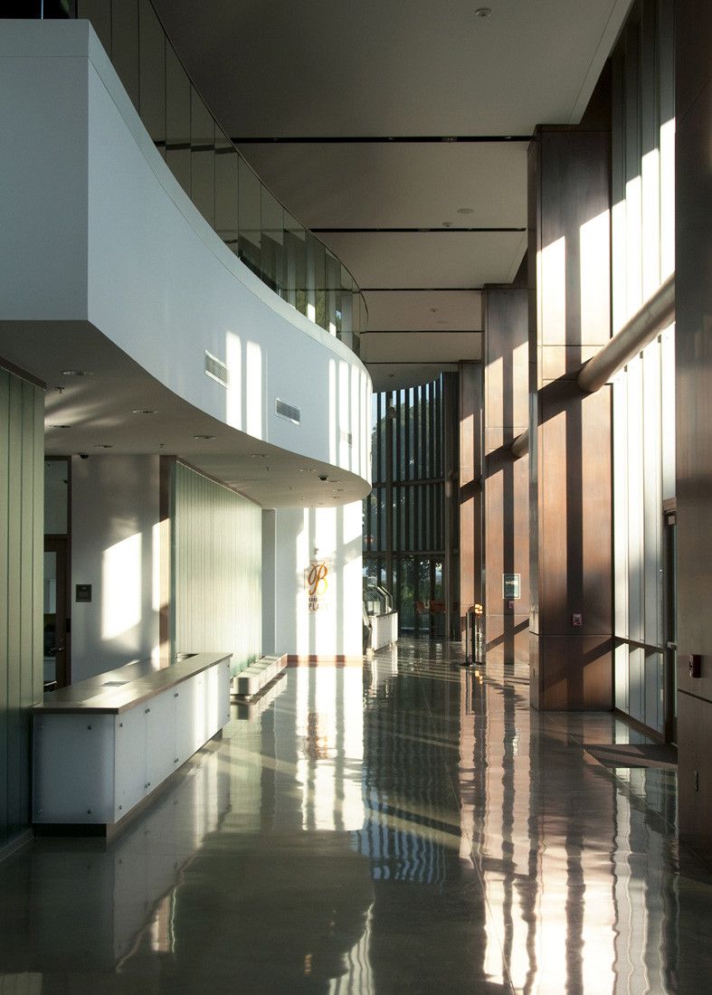 The glass and copper palette also dominates most of the Mixing Hall interior, in combination with a polished concrete floor. Glass – or translucent variants of glass – is employed in the details of the interior as well as in the variously fritted curtain walls. The gallery railings, the Circulation Lounge stair railings, and the Pre-function Porch railings are solid glass cantilevered from the floor decks. Cast channel-glass is used along the Ground Floor of the Mixing Hall Gallery to separate the lobby from Student Recreation and from Student Life Offices – this channel-glass serving as a custom-lit donor wall along a portion of its run. Backlit 3-Form translucent panels are used at both the Reception Desk and at the Café service line. This combination of transparency and translucency has its obvious repayment in a maximization of interactive views, in an overall environment of reflection, soft sparkle, and lucidity.