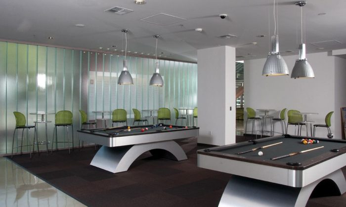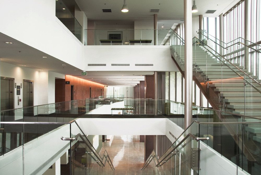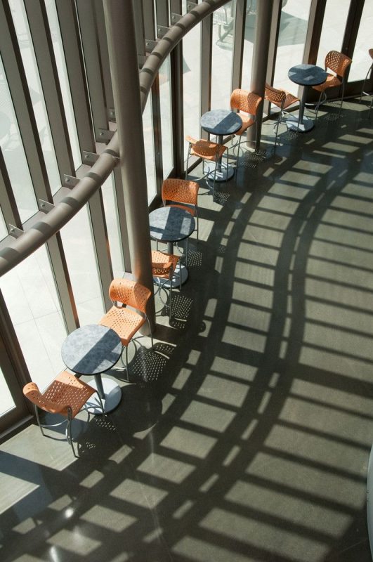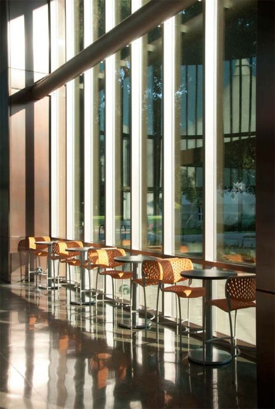 The design took an approach to sustainability that targeted and achieved a Silver LEED rating but emphasized major strategic sustainable initiatives over point gathering. The soft and ambient quality of the day-lighting, in all varieties – (clear and fritted glazing, channel glass, clerestory windows) – formed a dominant focus of design, as did the provision of high-quality views from almost all of the occupied spaces. Equally important was the application of a minimal materials palette, anchored in a raw, regionally-source concrete floor for the major public area. In addition to the steel content, materials rich in recycled content include the carpet tiles and the casework, clad in back-lit translucent plastic. The roof surfaces are single-ply liquid membrane highly reflective roofing, in combination with a walkable deck and a demonstration green roof atop the Café.