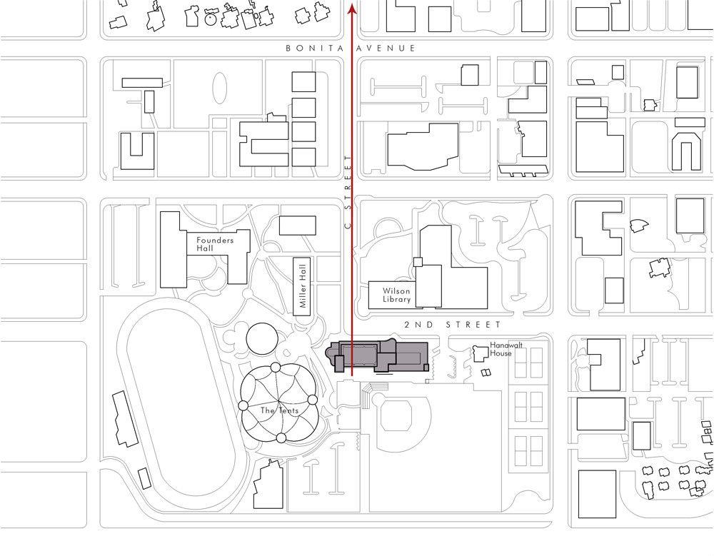 There is significant vertical interpenetration in the Campus Center, the planning and the volume conceived very much in concert; according to the following strategies: Identity, View, and Massing. The axis of C Street penetrates into the westerly third of the site, providing a dramatic view into the site from as far as Bonita Avenue, and providing an even more dramatic view out to the San Gabriel Mountains.
