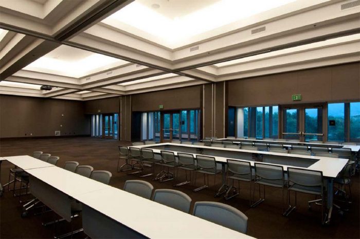 The three-story portion of the facility is also massed with its centerline on the street axis, at the westerly third of the site. This third story consists primarily of a multi-purpose Banquet Room directly above the entry gallery area, with a ‘Pre-function Porch’ sheltering the long entry wall, cantilevering out 15 feet over the sidewalk. With sight-lines at some 35 feet above grade, both the banquet room, (with glass wall and doors to the north), and the Pre-function Porch, (also with continuous French doors and glass handrails), have panoramic views of the mountains framed between the campus’ oak tree-tops and the sky.