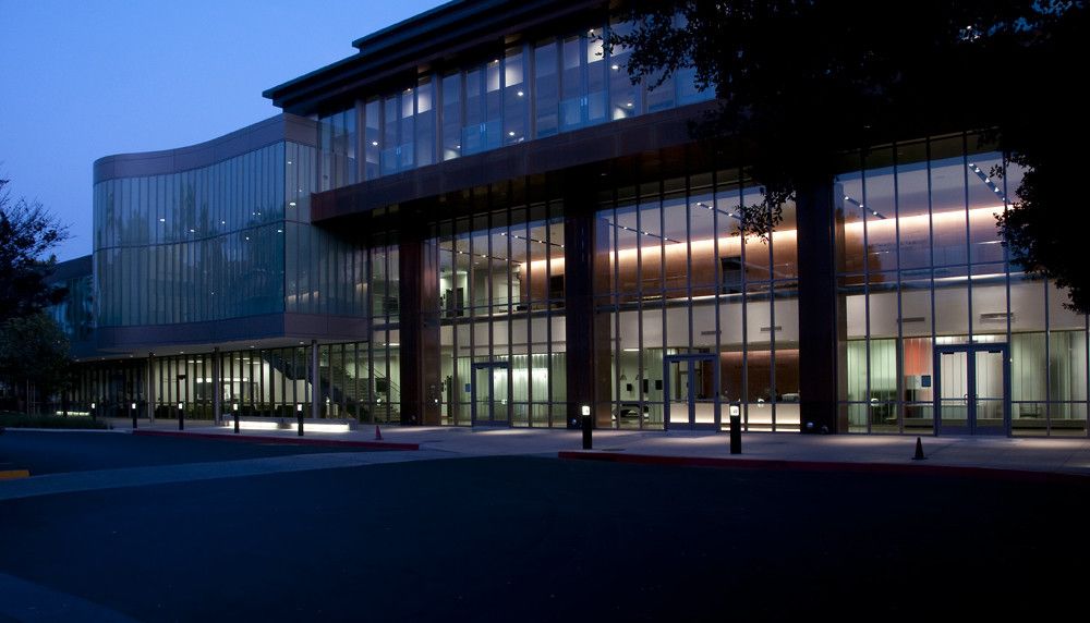 With the three-story mass established as the building’s center of gravity, the building tapers steps down to two-story glazed linear offices to the east, and the curvilinear two story Café to the west. The roof of this Café serves as an outdoor extension of the third-story Pre-Function Porch, with a gathering view-deck surrounded by a green roof.