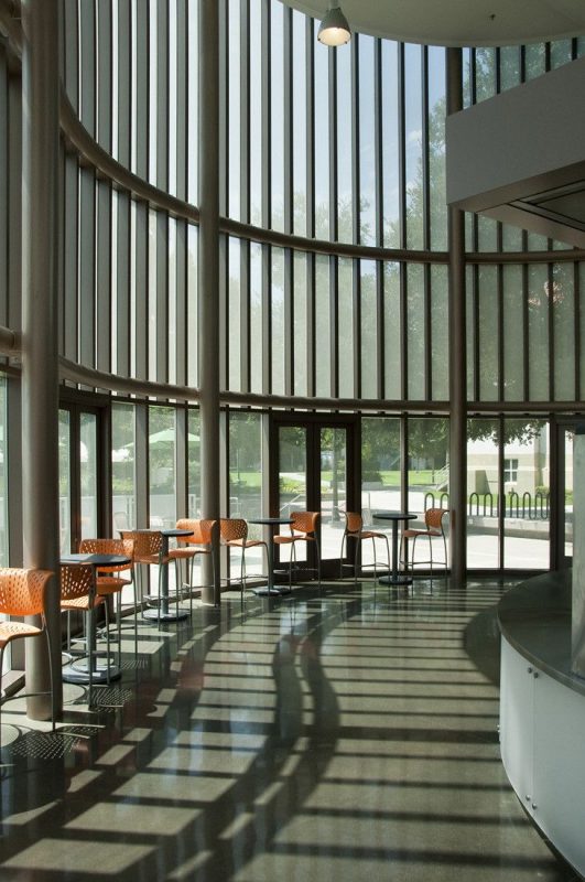 To the east of the linear entry, a gallery is a three-story “Circulation Lounge,” with a ceremonial open stair to the second-floor gallery and the third-floor Pre-function Porch. Wrapped in a curved fritted glass similar to the café’s wall, this Circulation Lounge juts out over the sidewalk and additionally provides discrete gathering and study areas that are an integral part of the Mixing Hall concept.