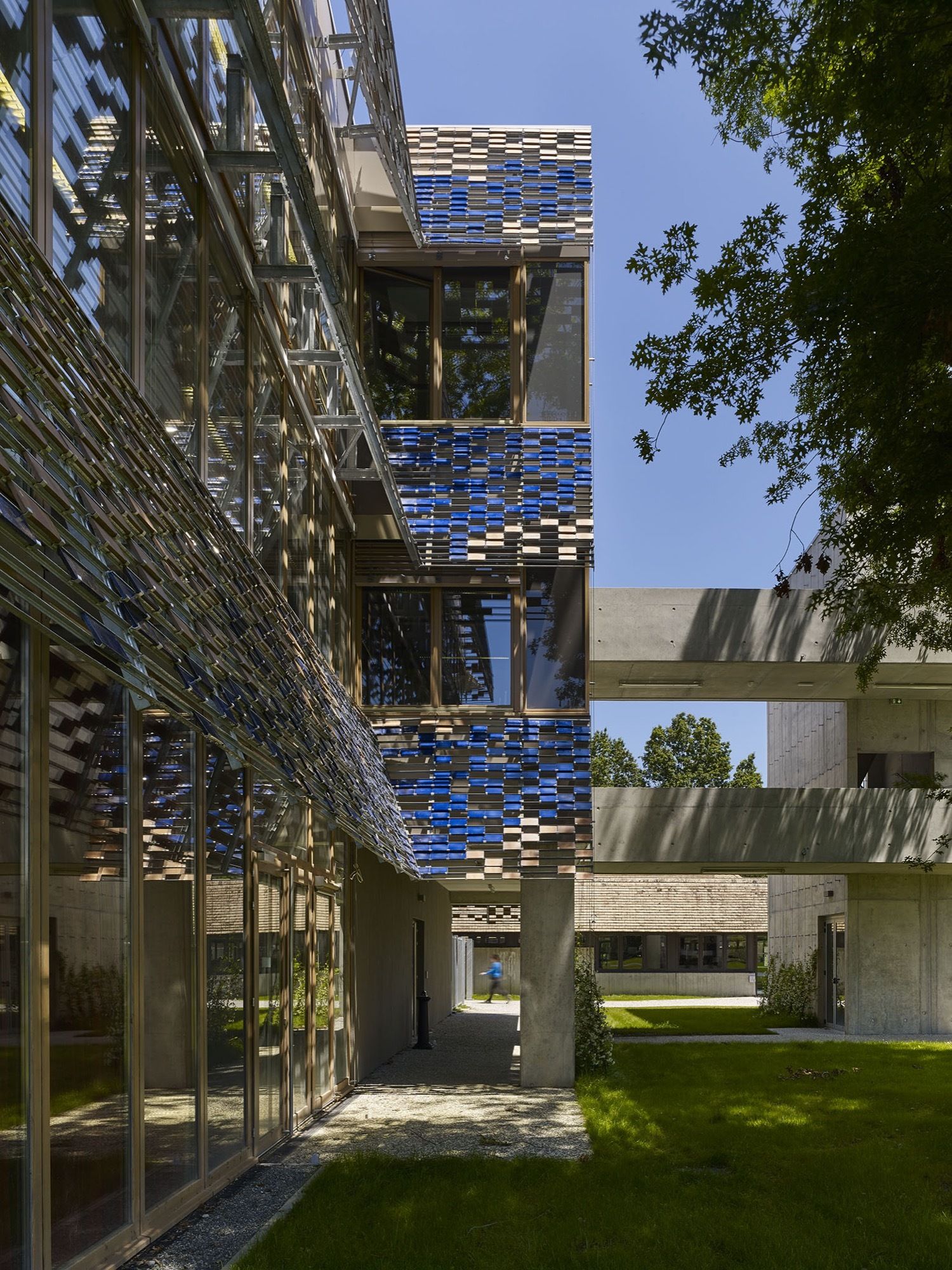 A random mix of these 5 colours livens up the façades of the new building and allows their identification. Each of the 25,500 made-to-measure 10 cm x 20 cm terracotta flat tiles is clipped to the metal frames. All the frames, measuring 3 m x 2.15 m, are placed according to the façade grid of the timber window frames (1 m x 2 m) while maintaining the inclination and alignment on the existing canopies. According to the varying exposure, a play of solids and voids enlivens the façades of the new parts. The sun-shields are gradually perforated, depending on how close they are to the existing building: they are denser on the north-east and north-west to link to the existing building, and less dense on the south to highlight and enhance the new research centres.