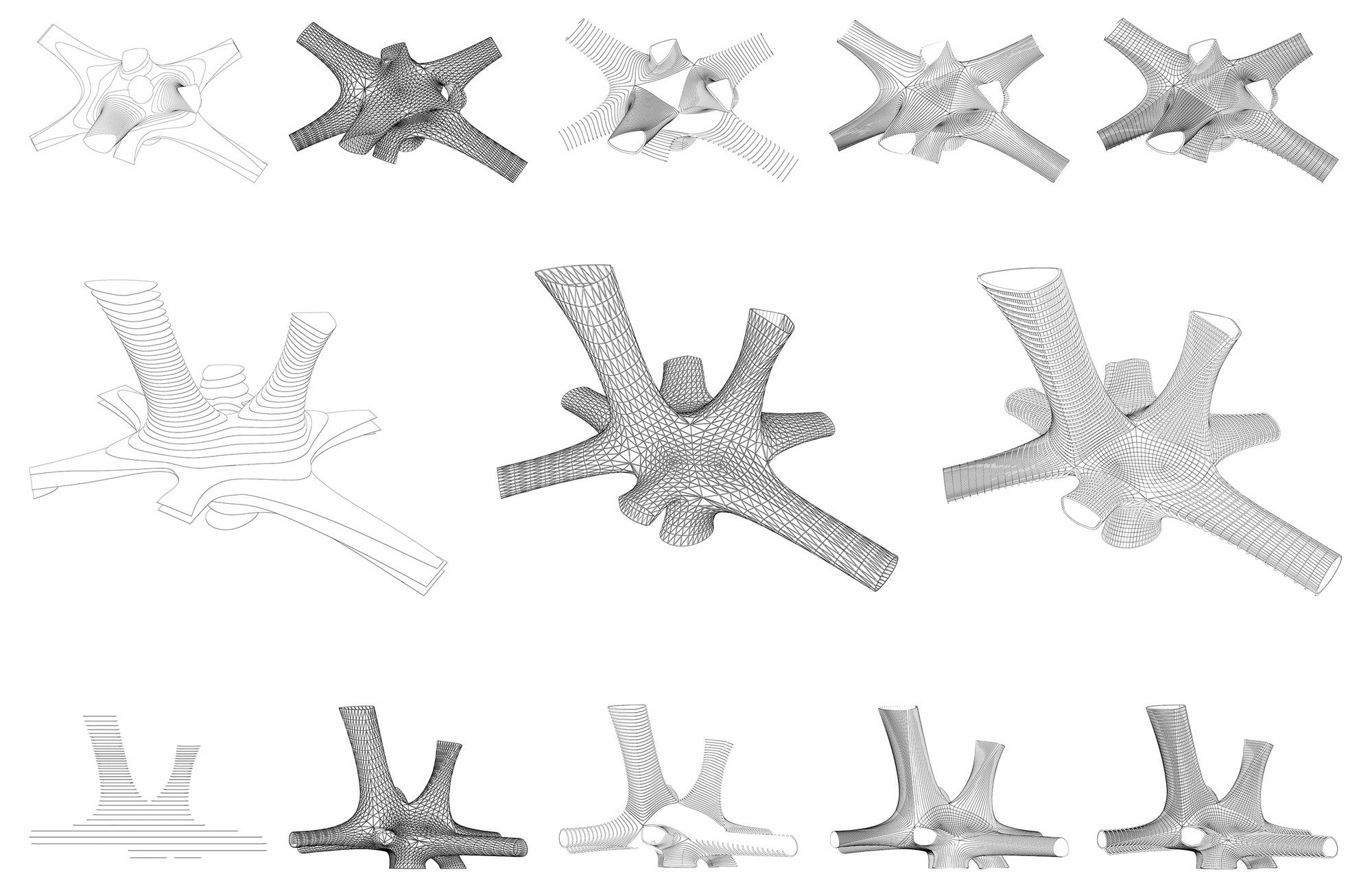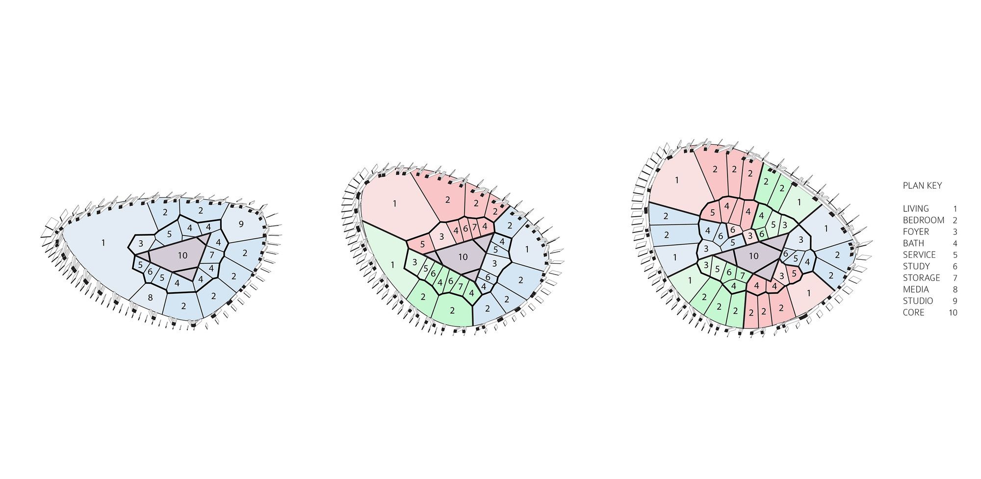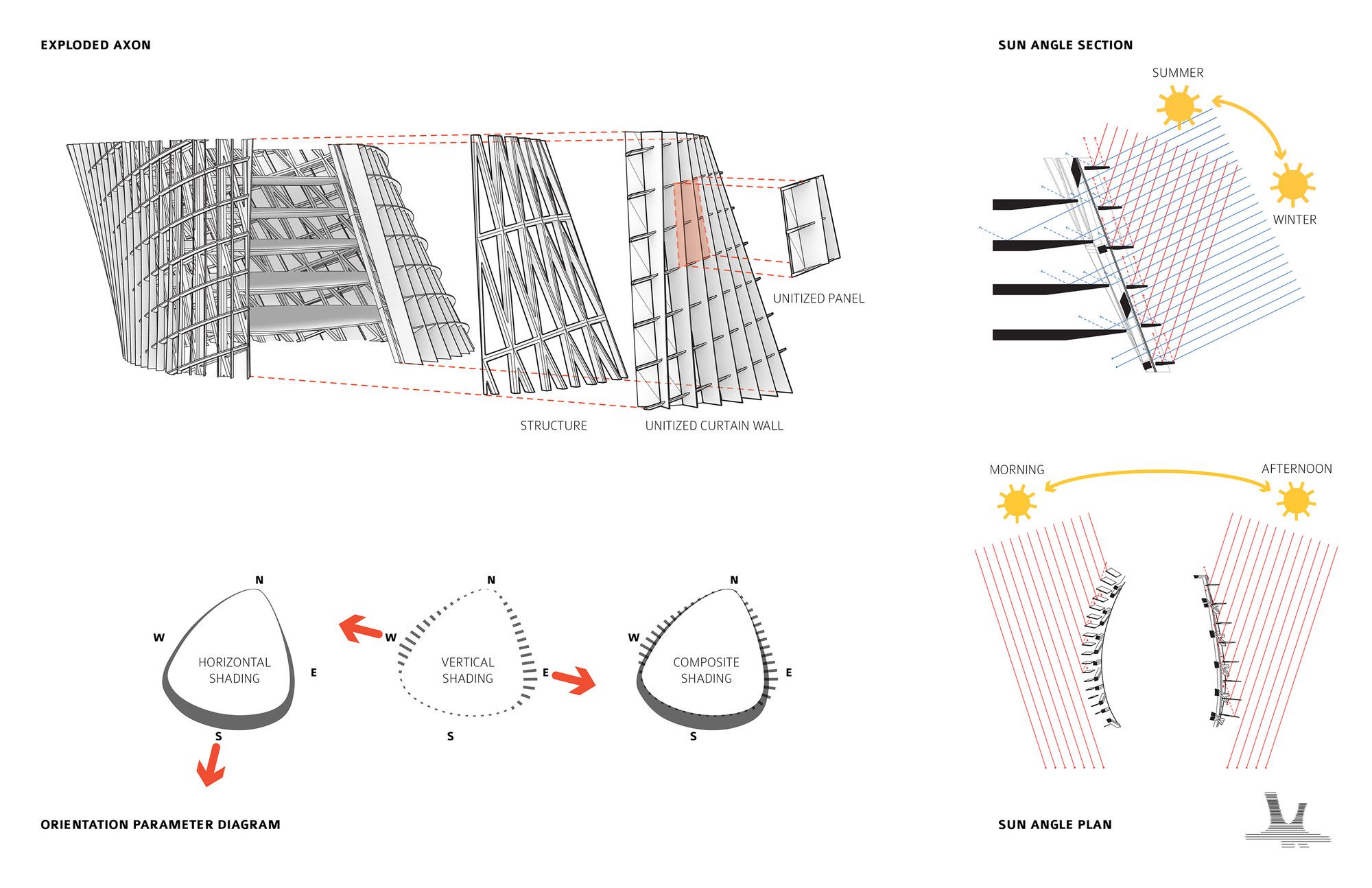 Not only are the programmatic concerns important, as are the structural arrangements and envelope that these elements can flourish in. The floor plates of the building relate to the program by a set of transitioning geometries that from the base to the top of each tower change from cylindrical to triangular. This complex shift requires a sophisticated facade that responds to the different environmental exposure that the building encounters. A grid is applied to the complex geometry with a combination or alloy of multiple dynamic systems. An algorithm is generated to produce vertical and horizontal fin profiles that allow the grid to determine its shape according to the optimal solar shading and daylight transmitting requirements. Therefore each fin is unique to its solar orientation.