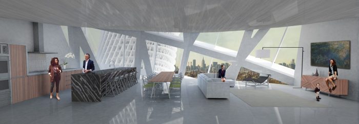 The proposal, Urban Alloy by Chad Kellogg and Matt Bowles of AMLGM, is a mixed-use tower is a topographical approach in responding to transportation and residential needs. By capturing the air rights above freeways and elevated train tracks, the designers are able to take advantage of these often-wasted spaces, and allow for a building to “organically” form and address the growing population needs.