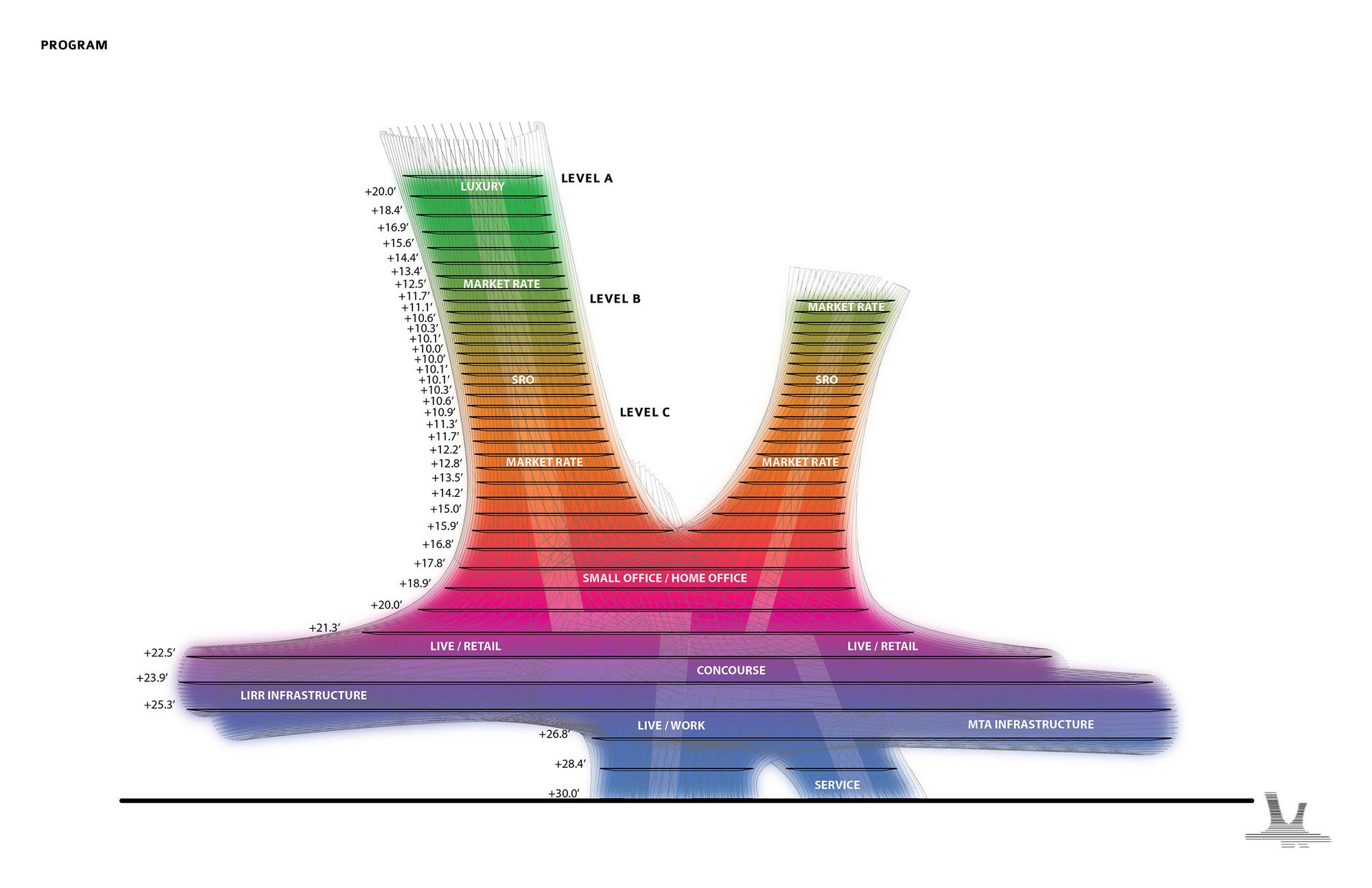 More specifically, the project has chosen to study the existing intersection above the LIRR and 7 train. The building is meant to adapt according to which intersection it is to be sited on. However, in this case the goal is to create living units at a high cost that are personalized to the residents needs. By encompassing a large range of programmatic needs into the structure, such as, places to eat, play, work, and rest within pedestrian zones, they are trying to entice people to pay premium.