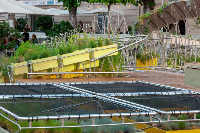 The stage is structured into three distinct zones: an urban garden where fruits and vegetables grow seasonally, inviting public participation; a meadow with tall grasses, offering a sense of nature within the city; and an intimate stage that encourages spontaneous gatherings and performances. By integrating greenery into the urban fabric, the project promotes environmental awareness while enhancing public well-being.