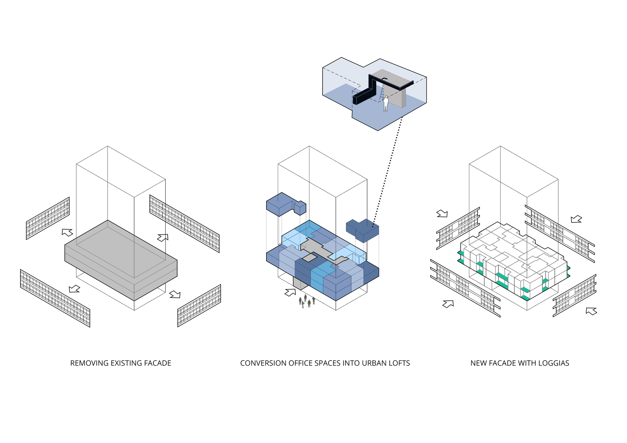 The existing facade of these levels with office spaces underneath the buildings were outdated and are renewed with respect to the characteristics and structure of the original design. As an addition each loft apartment is provided with a loggia.