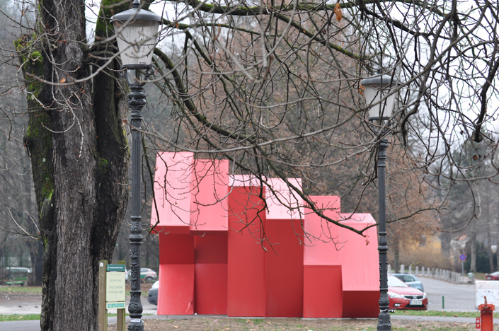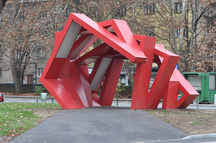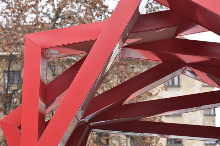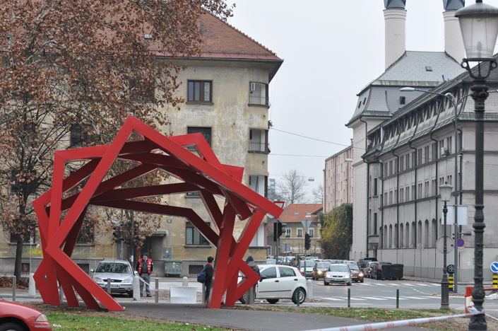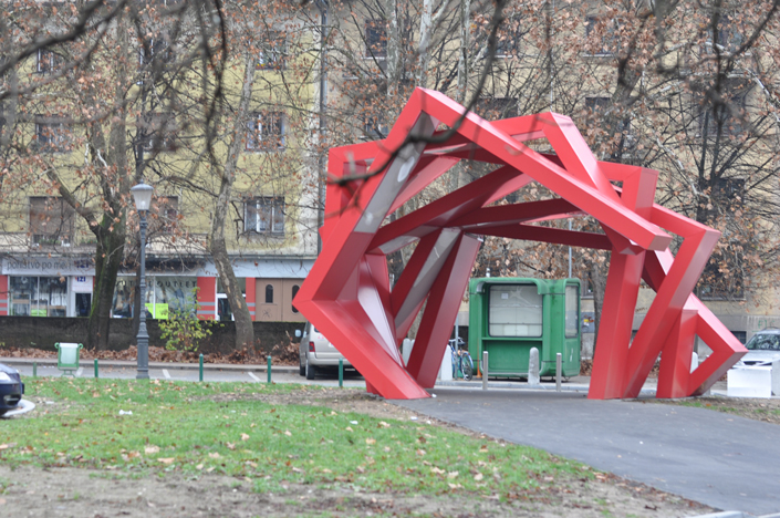 Designed by Rok Grdisa, This urban sculpture, a new Tivoli info point, is actually the end of another story, the¨TrimoUrbanCrash 2007 competition¨ and the beginning of a new project. In the first competition, two projects were chosen to be built as temporal structures. After two months, the event was finished and we took them apart to be recycled. At this time four separate initiatives for permanent use of pavilion came to the municipality of Ljubljana, and it seemed to be the perfect opportunity to reuse this urban sculpture. Initiatives were brought by the International Center of Graphic Arts (MGLC), National Museum of Contemporary History, academician Jože Bernik, and deputy Jožef Školč. Because the Park Tivoli is a very protected area, where you are not allowed to build, we had to search for a new location within the direct vicinity of the park. The final resting place for this sculpture turned out to be an untidily grassy triangle, located directly by the park entrance. By placing the sculpture here, we have revitalized this meadow and established a new entrance to Tivoli park. We have a made clear connection between Celovška street, the Tivoli Sports and Event Hall, and Tivoli park. The new purpose of the sculpture is to inform visitors of different art installation and museum exhibitions that take place in the park. Hidden in the park, there are museums, gardens, and exhibitions including the International Center of Graphic Arts, the National Museum of Contemporary History, and the Botanical garden.