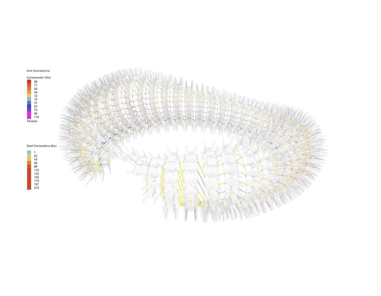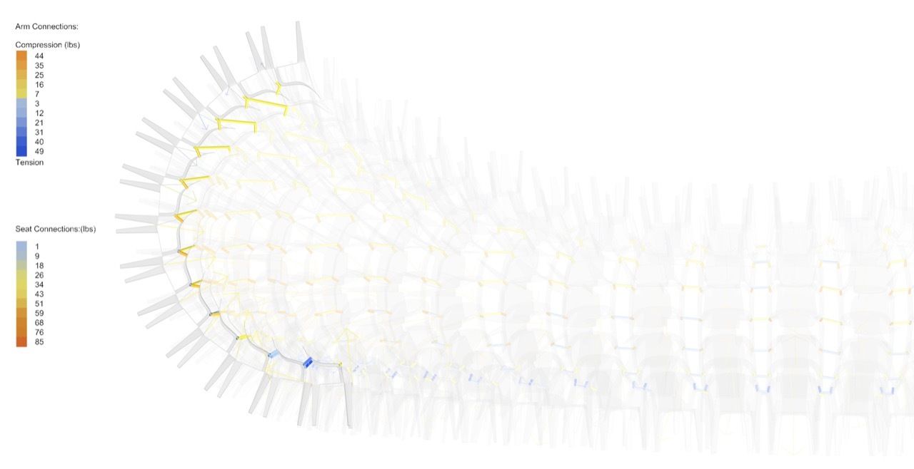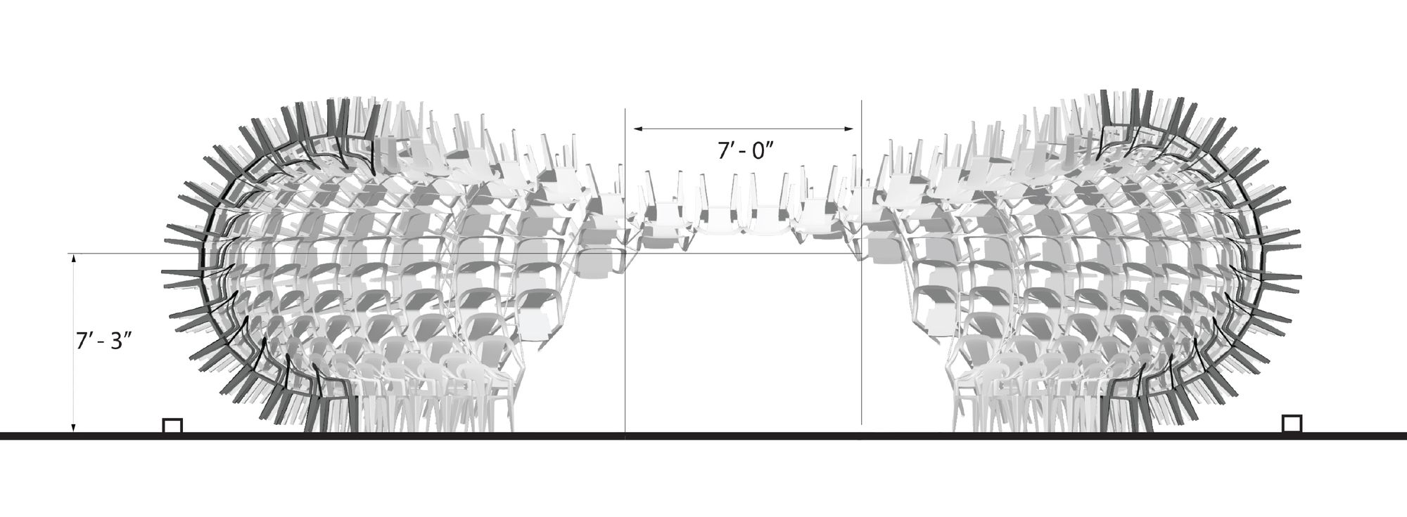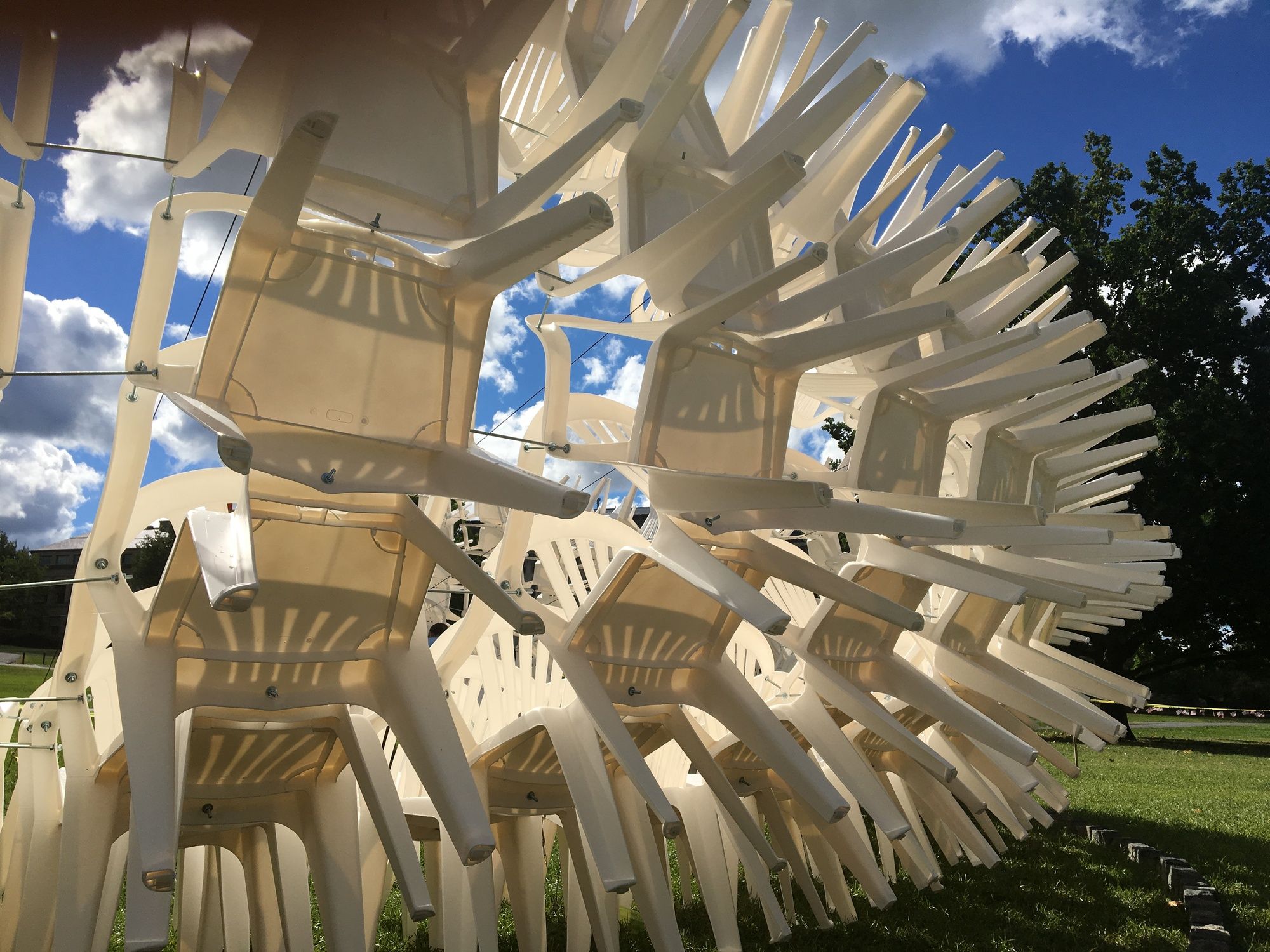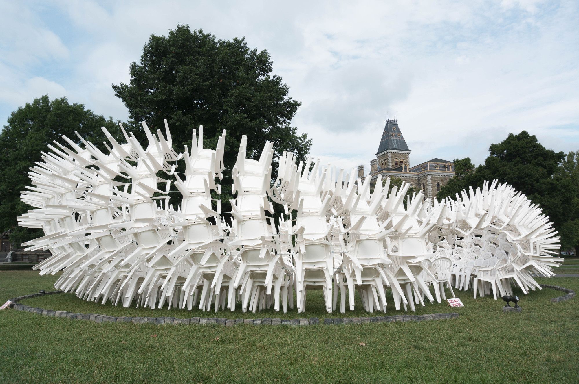 Dipping down in response to the statue of AD White, the pavilion allows the seated figure of one of Cornell University’s founders to enter into the (impossible) circus. No chairs were harmed in the production of Urchin, and they will be returned to circulation afterward. Urchin plays with the question of usefulness and uselessness by the manipulation of the simple chair, and consequently our perception of the chair and the connection between our bodies, the chair’s components, and their orientations. The question of use as a primary perceptual phenomenon is a product of James J. Gibson’s Theory of Affordances in his Ecological Approach to Visual Perception. The project aims to provoke the questioning of usefulness and perception from the scale of the individual chair unit to the scale of the pavilion.