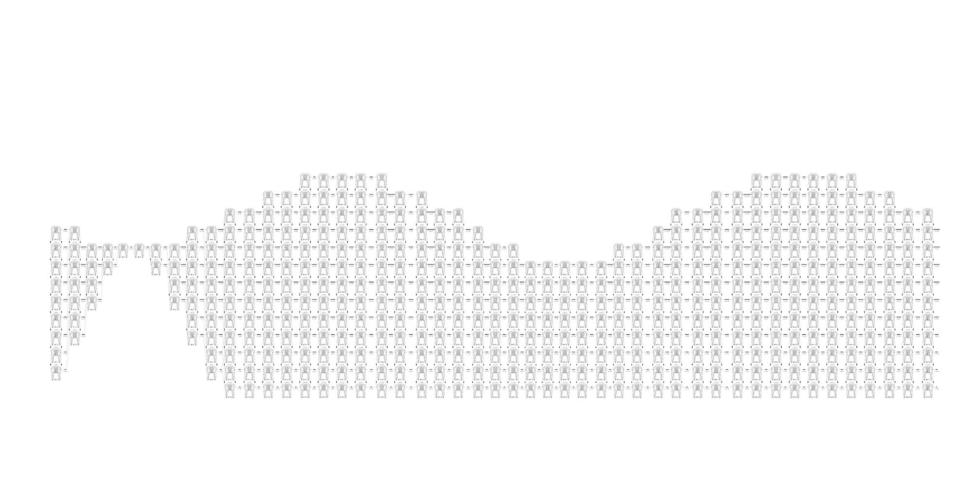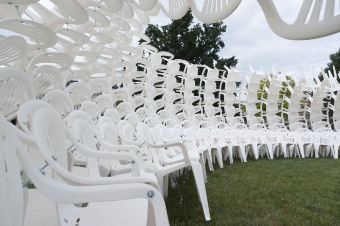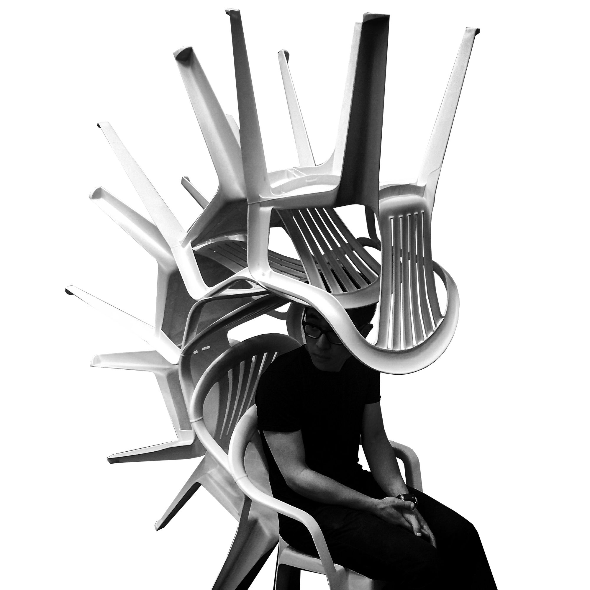 Built from 500 borrowed plastic chairs, Urchin aims to question the role of the everyday object: from the typical use that ‘affords’ sitting to an aggregation that becomes skin-like: the object’s features are no longer understood in terms of their use (legs, arms, seat) but in terms of their form (spikes, curves, voids) as, due to their rotation away from the ground, they lose their relationship with the human body.