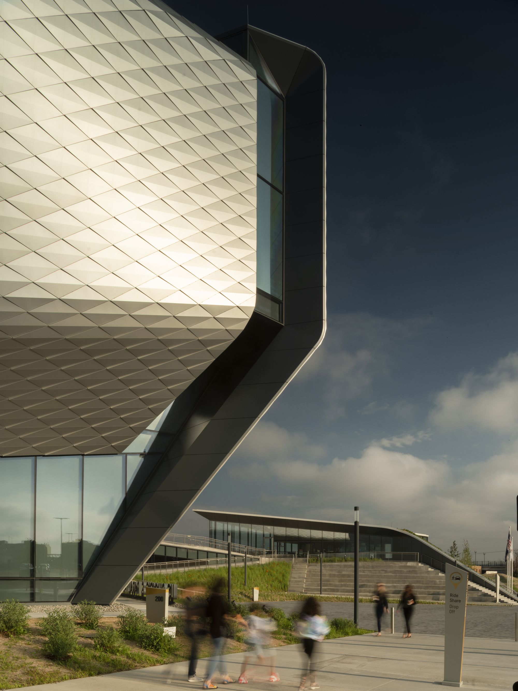 Façade: The façade consists of over 9,000 folded anodized diamond-shaped aluminum panels, each unique in shape and size. The taut skin wraps four overlapping petal-like volumes that spiral around the internal structure. Each metallic panel is animated by the extraordinary light quality in Colorado Springs, producing gradients of color and shade that give the building another sense of motion and dynamism.