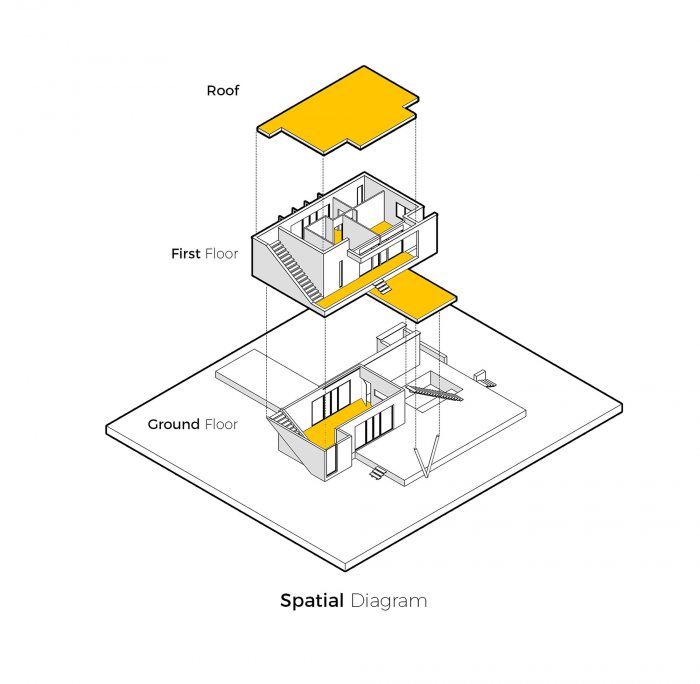 Another challenge was the 45-square-meter gross area; Ground floor connected to the earth by a platform is dedicated to the living room and kitchen and the first floor includes 2 bedrooms and a bathroom. The two levels are connected by a stairway which is cantilevered to solve the gross area challenge and to meet spatial requirements as well as playing a fundamental role in shaping the form of the building. The upper stairway leads to the roof which is functioning as an observation space over natural sceneries. A pool is added to the eastern part of the platform to improve natural ventilation in the living room.