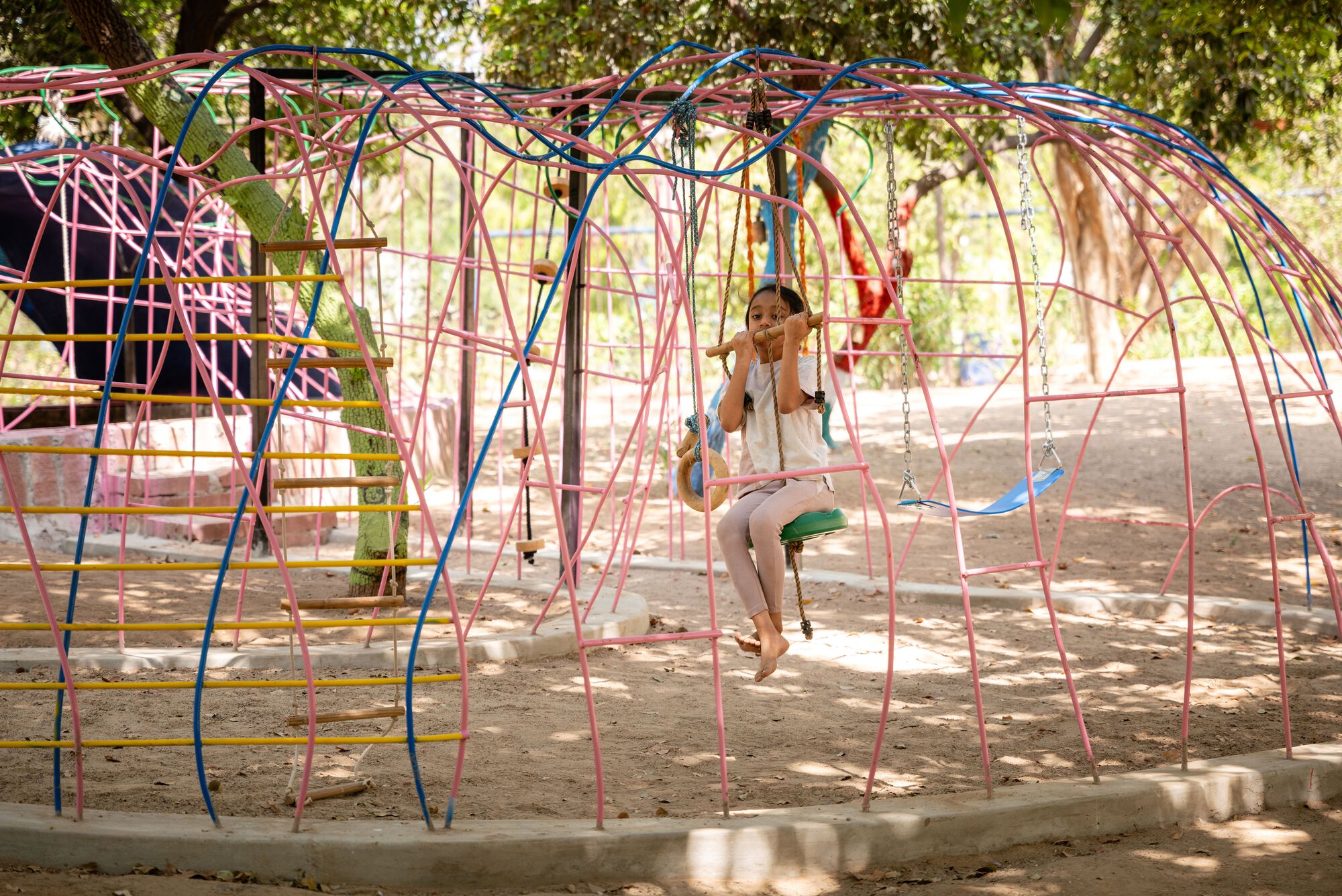 Looking at this, we have designed a space that includes a water zone, sand zone, climbing, swinging, and sliding spaces as a reimagined play gym, and all of these culminate into a tunnel space that is very uniquely designed from waste concrete pipes and mosaic which give it a colorful appeal to children. The jungle gym has curves that are designed by studying the anthropometry of children and giving curves where the children can explore different climbing surfaces very safely. The curves are made with very thin MS sections, which make it very easy for little children to hold them as compared to thick sections usually found in commercial jungle gyms. The colorful play spaces are designed in collaboration with the kids from the school, who have painted the trees and reused wooden tree logs from old trees, which gives them a sense of ownership and accomplishment, and they always have memories tied to the space.