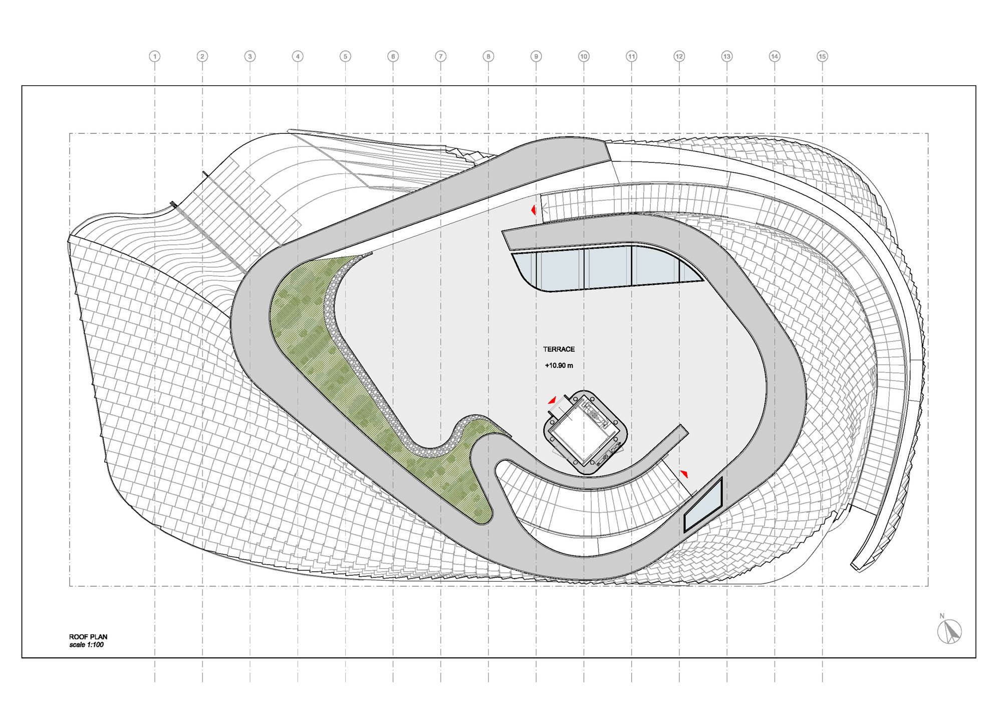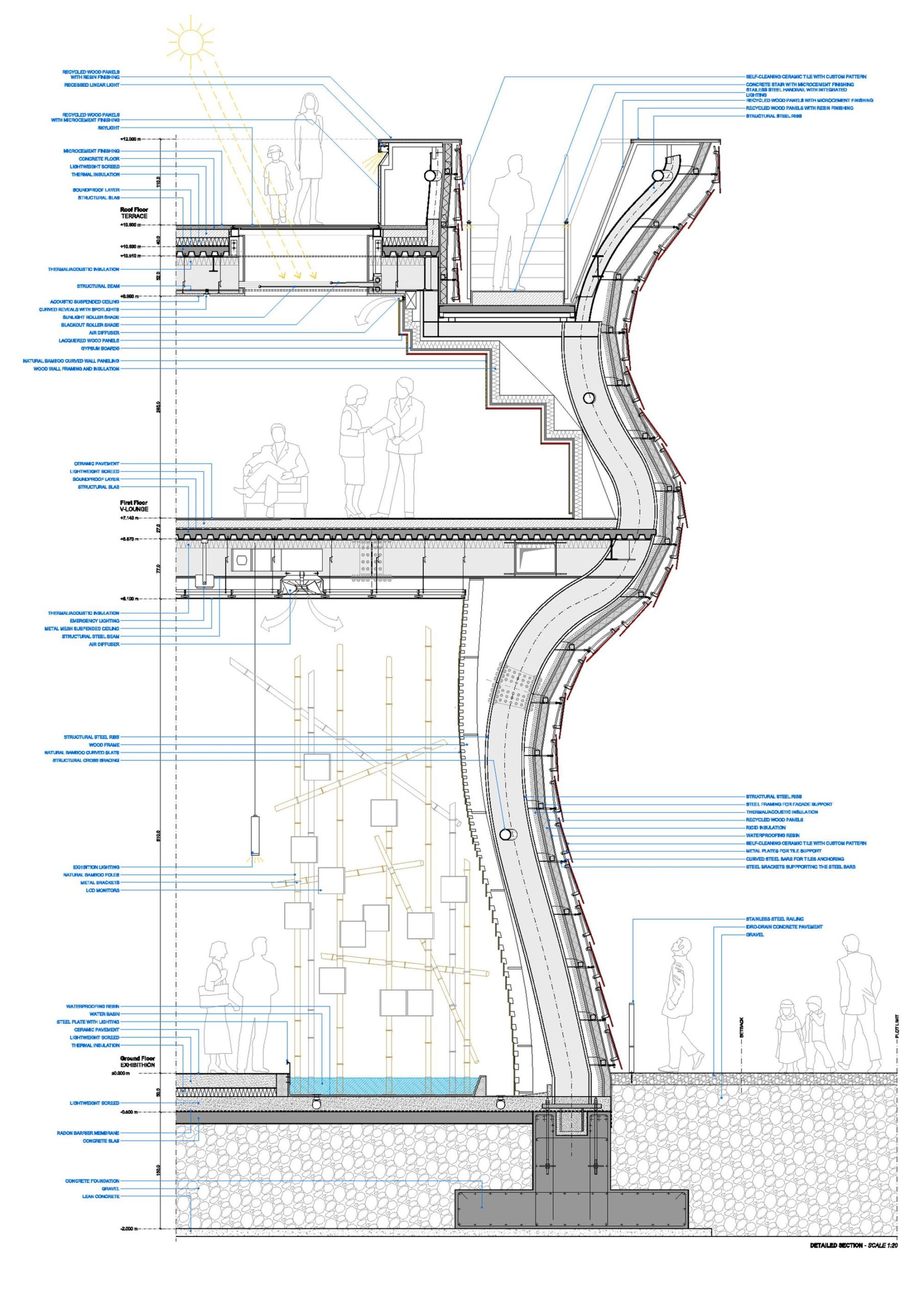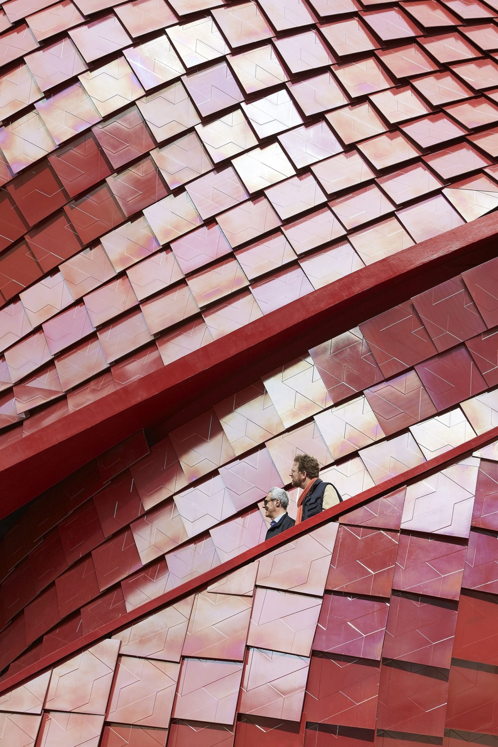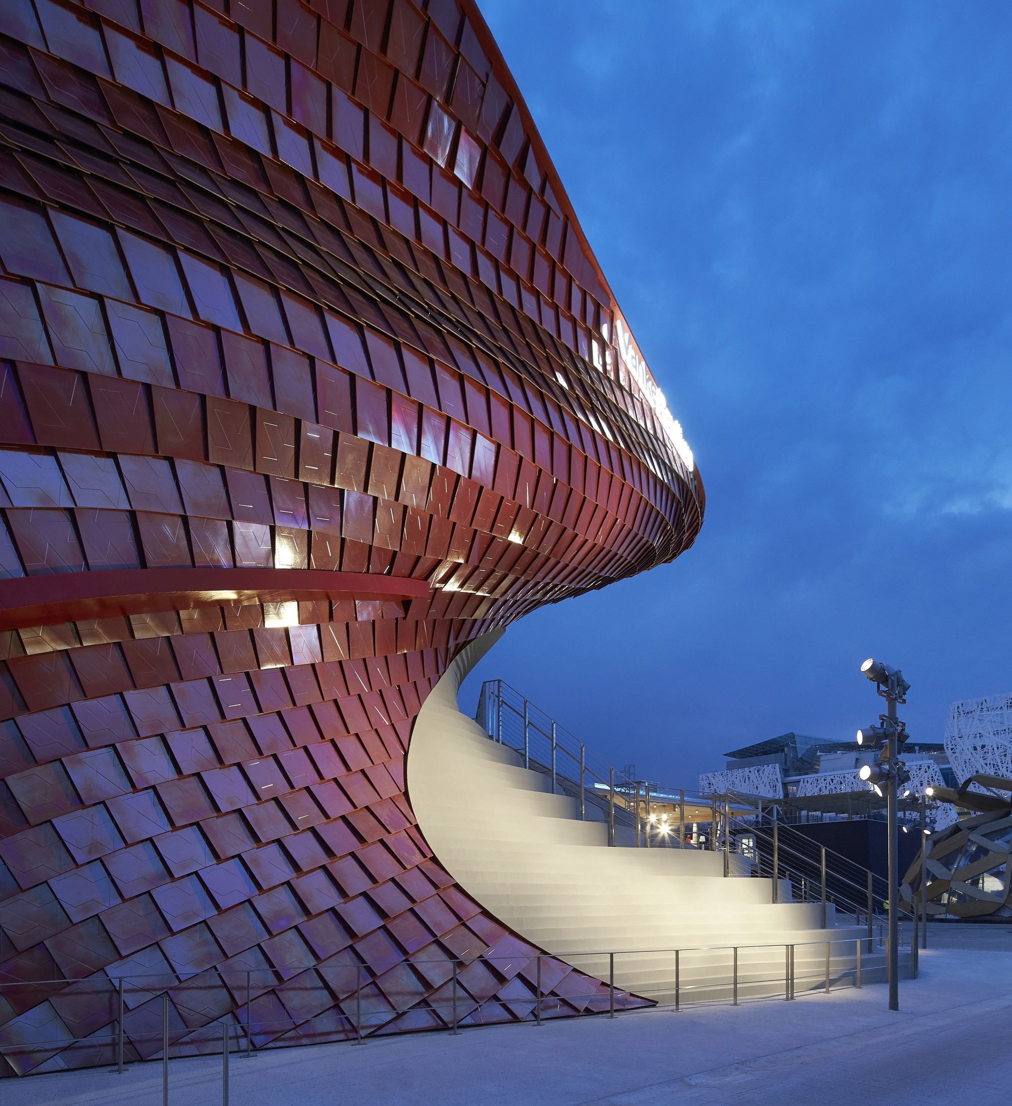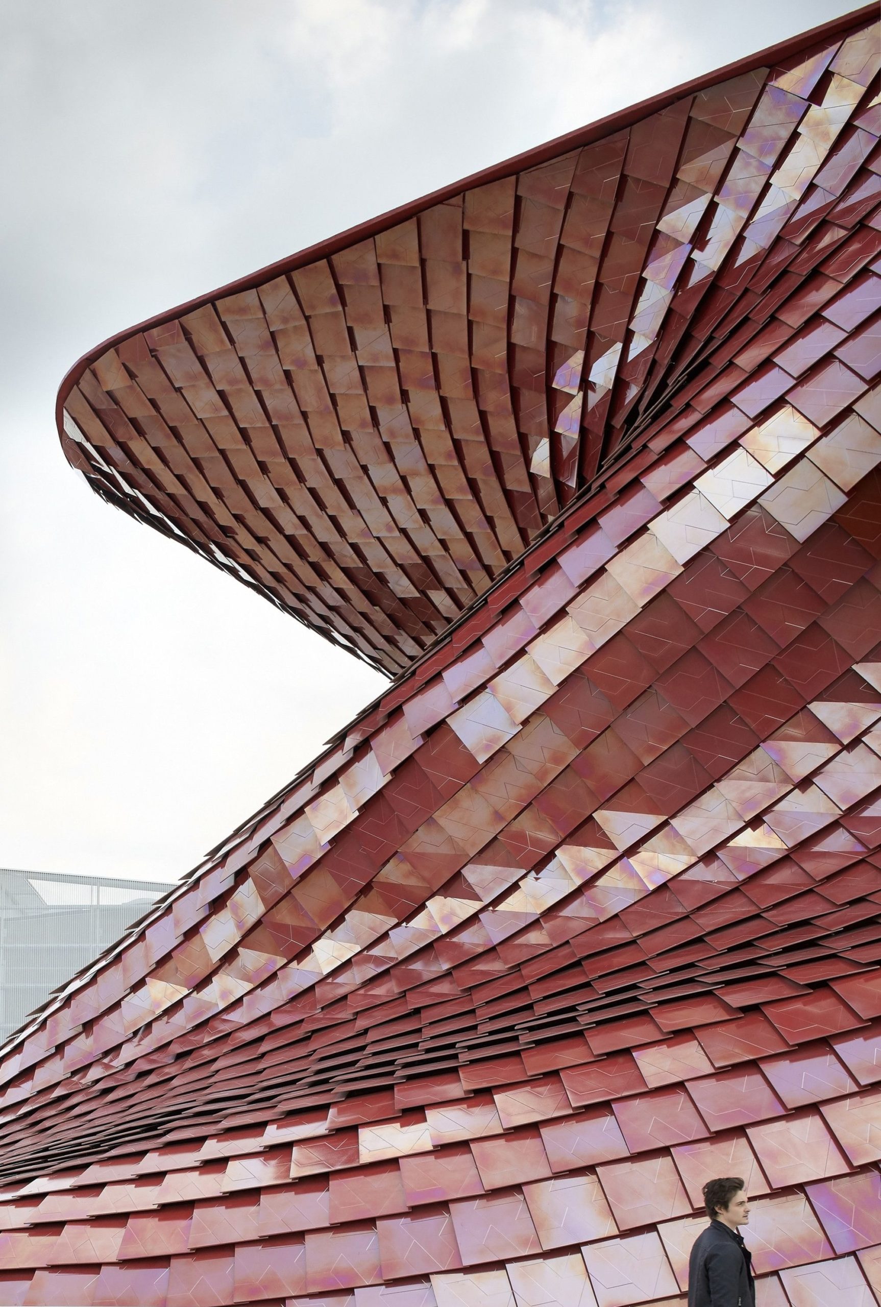 Sure, it’s shape makes it so that people can climb the building through a set of stairs, and enter it under a folder on it’s façade. And sure, the ascent to the terrace is one of it’s finer points (and one of the most clear references to China, the drawings on the stairs). But one can’t help but to feel bored, desensitized towards this building – it’s architectural vocabulary runs out on itself. It is as if, by virtue of its “peculiarity”, “sculptural prowess”, “innovative plasticity” and its “breakthrough designing” it held nothing of its own in terms of identity. The structural shape was intended to become a sculptural figure that welcomed China’s vast cultural impact, from the periods of the renaissance, contemporary art as well as Confucius and Lao Tzu. The exterior of the skin portrays a scaly nature that entirely wraps the structure. There is also access to the roof and terraces through an external stair that allows visitors to experience the view of other nearby expo pavilions.
